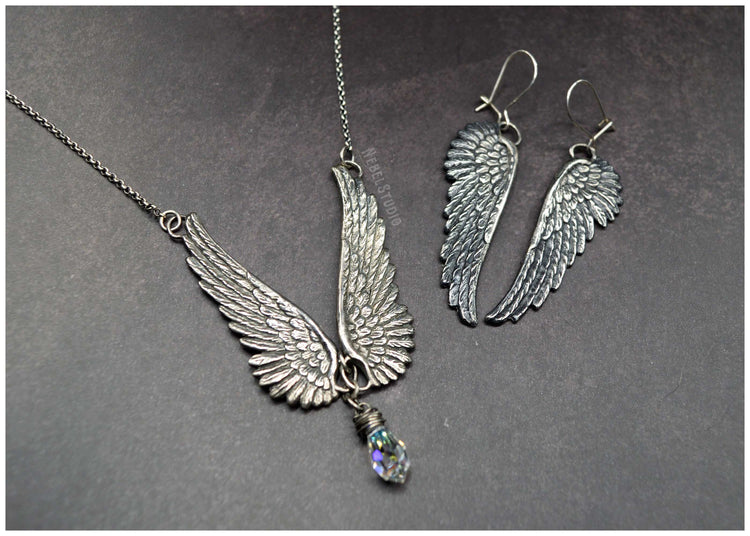 En esta colección puedes encontrar tanto un collar de plata 925 con cristal tipo Swarovski, como un juego de pendientes de plata 925 o de bronce. Las piezas de esta colección se pueden comprar juntas para combinar o por separado. Puedes comprar las alas de ángel clicando en la foto o en la descripción.
