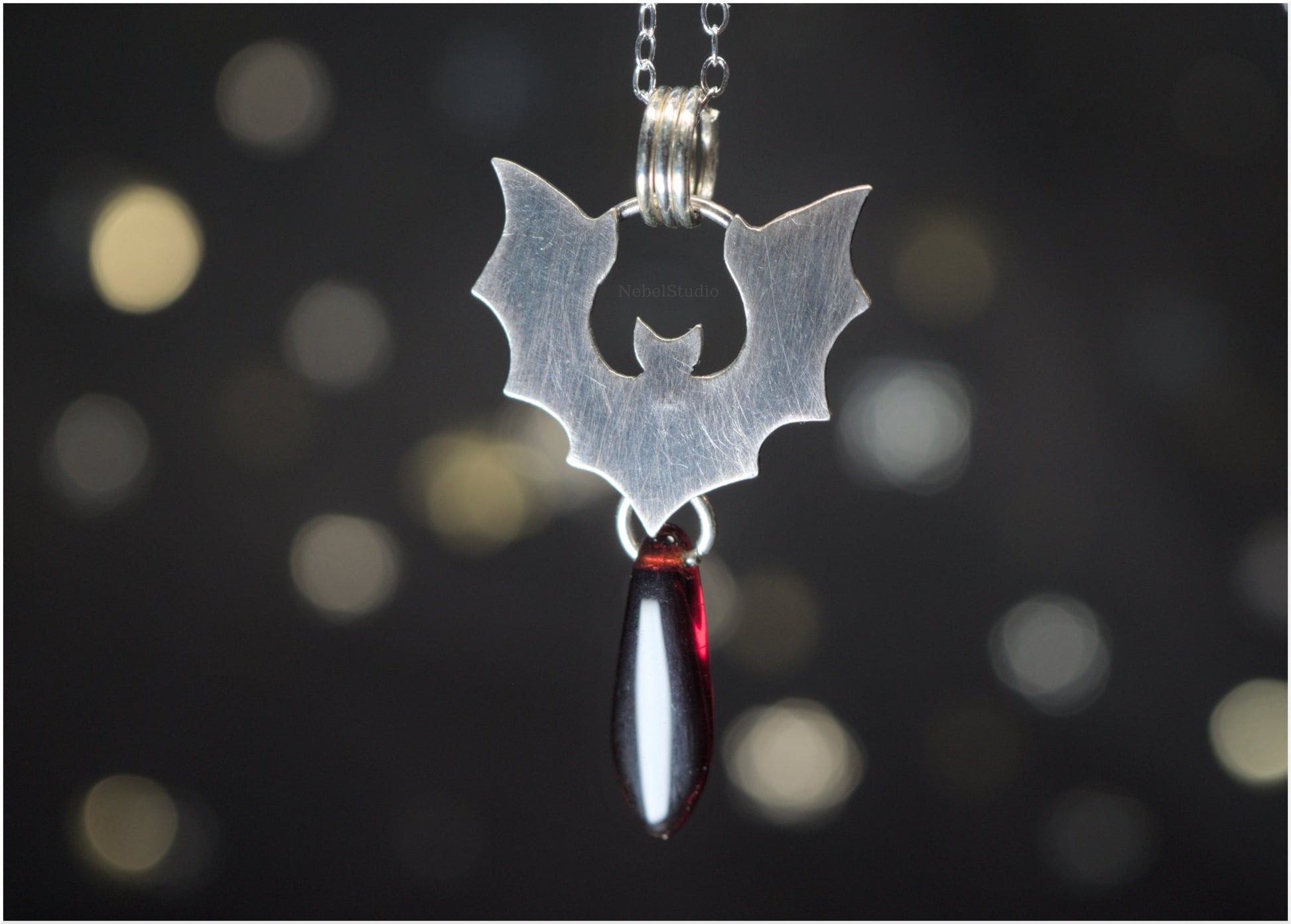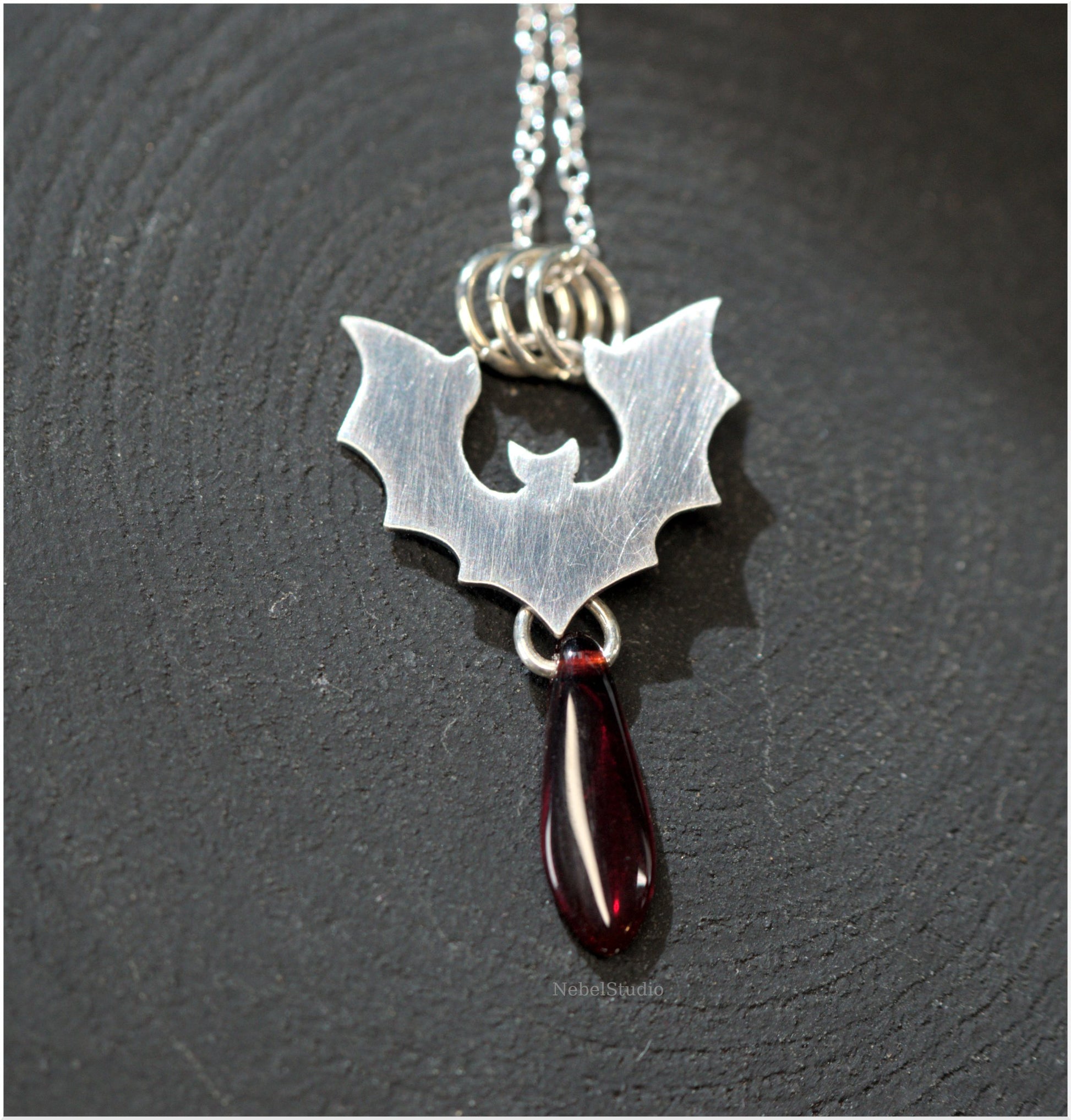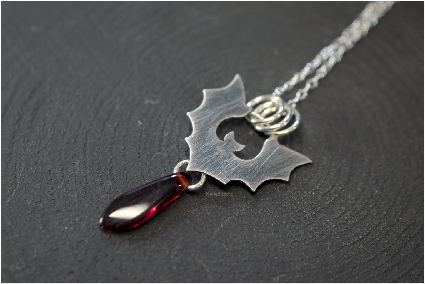 Bat-shaped pendant, openworked by hand in 925 sterling silver, with a matte finish and patina. It represents the silhouette of a bat with its wings open and pointing upwards. Attached to the thread that joins the wings, at the top, there are three rings to be able to pass the pendant through a chain or cord to hang it. From the bottom of the bat hangs an elongated drop of garnet-coloured Czech crystal.