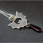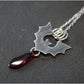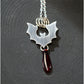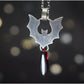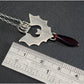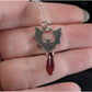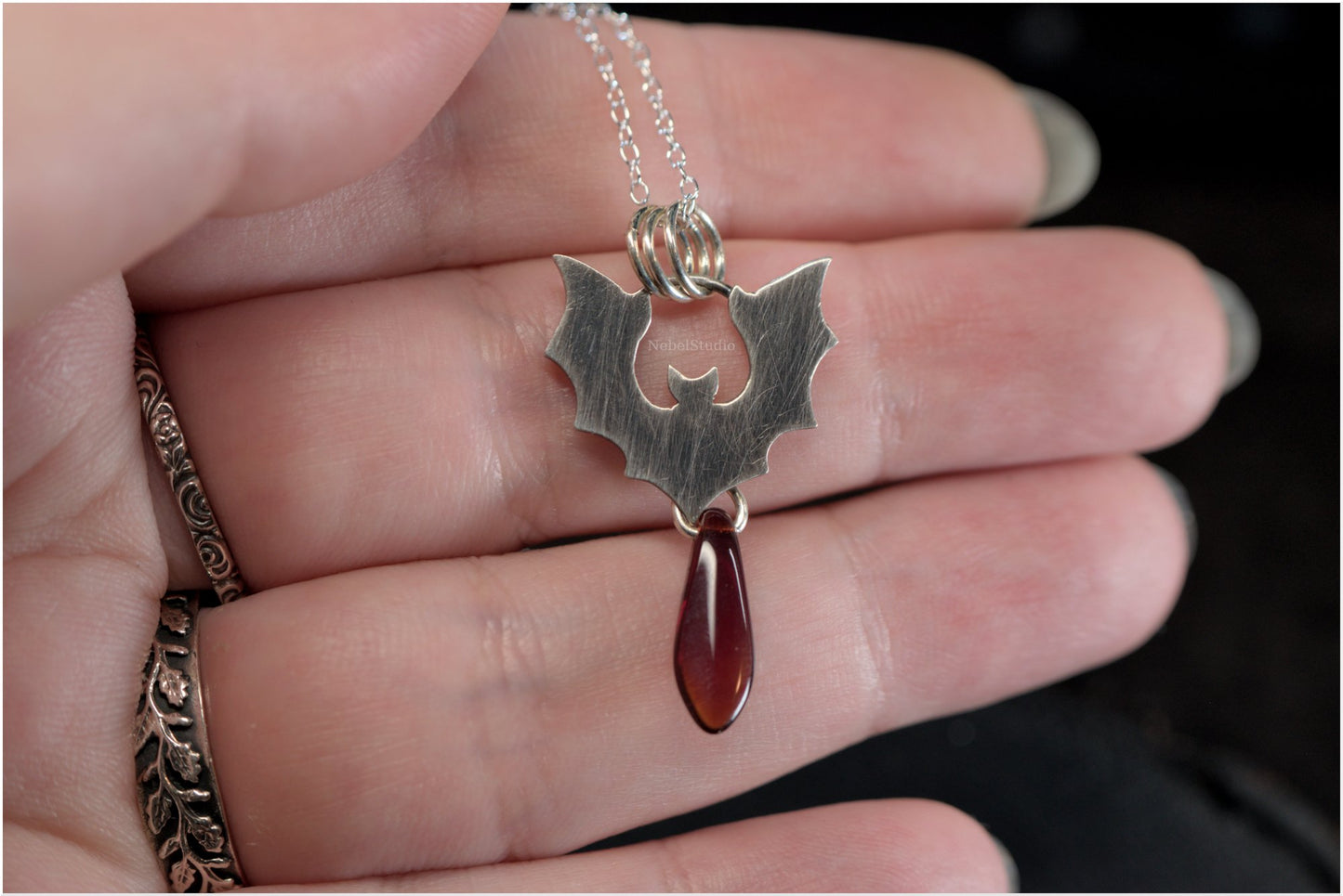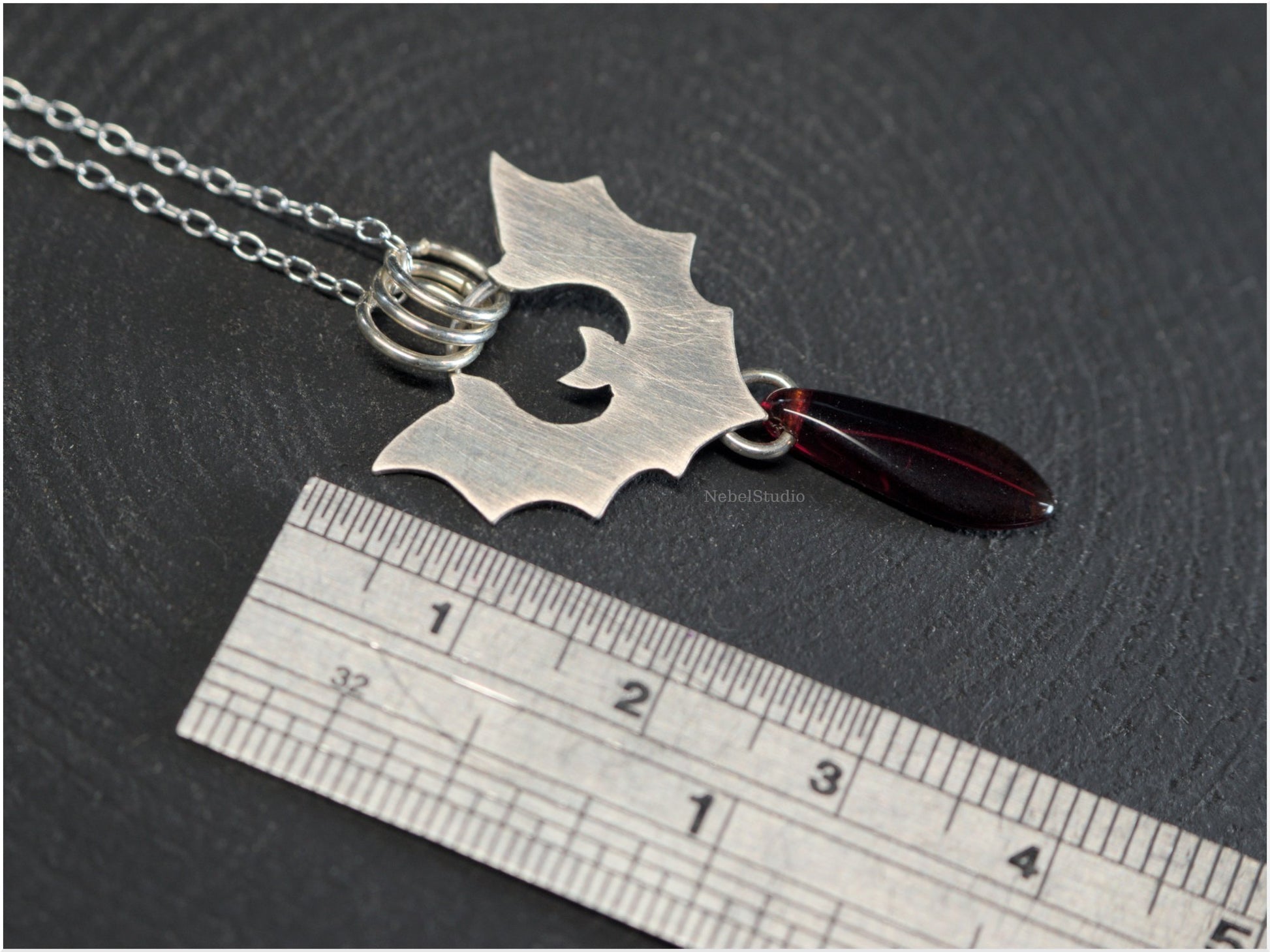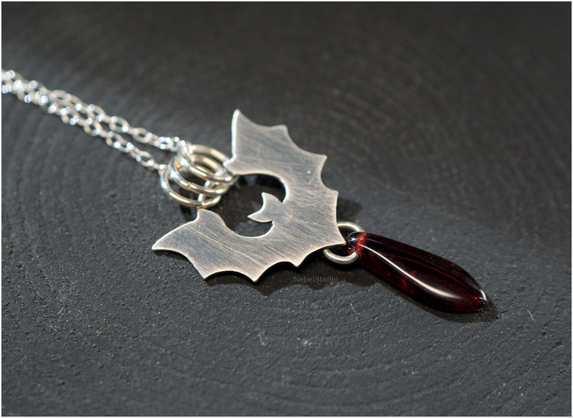 Bat-shaped pendant, openworked by hand in 925 sterling silver, with a matte finish and patina. It represents the silhouette of a bat with its wings open and pointing upwards. Attached to the thread that joins the wings, at the top, there are three rings to be able to pass the pendant through a chain or cord to hang it. From the bottom of the bat hangs an elongated drop of garnet-coloured Czech crystal.