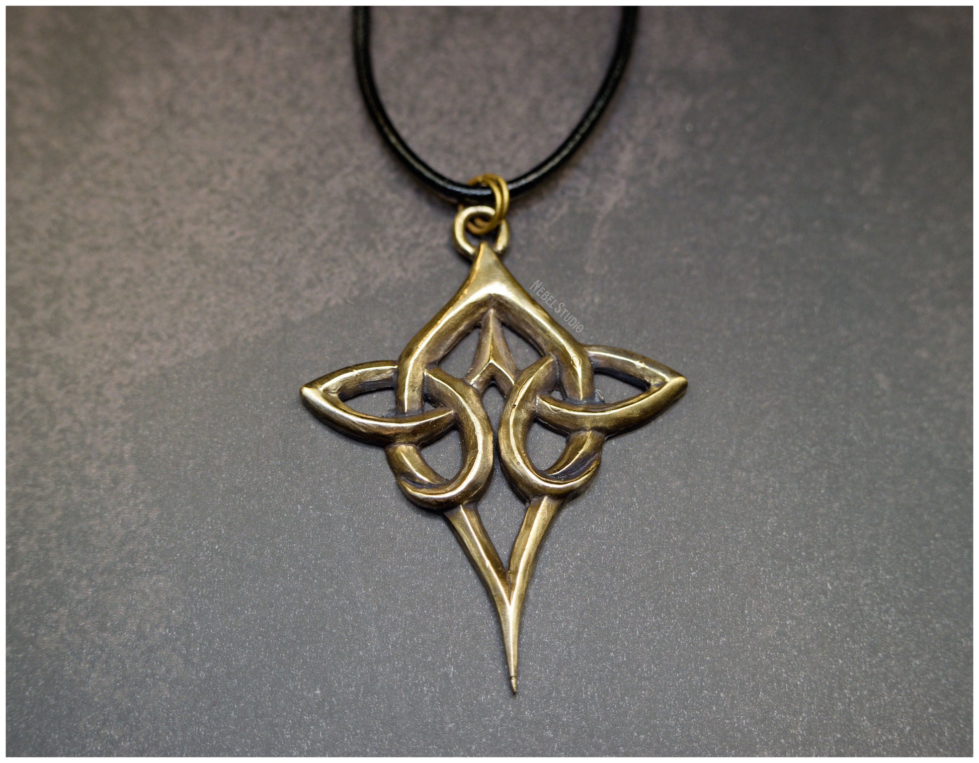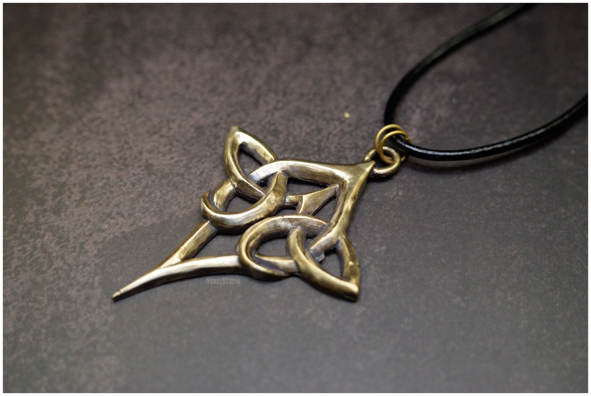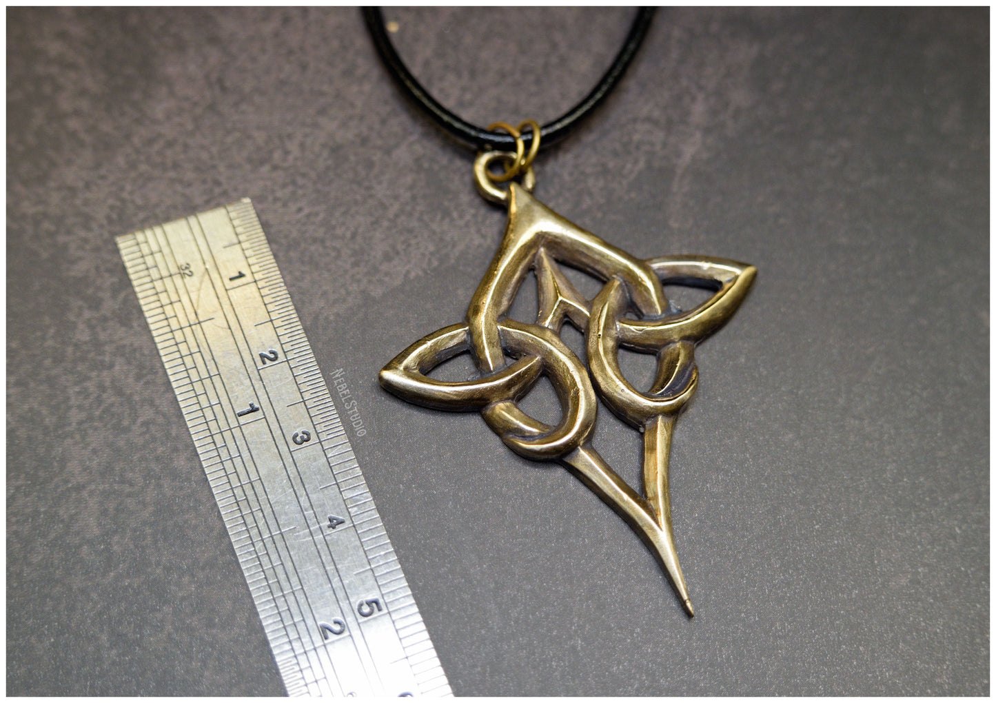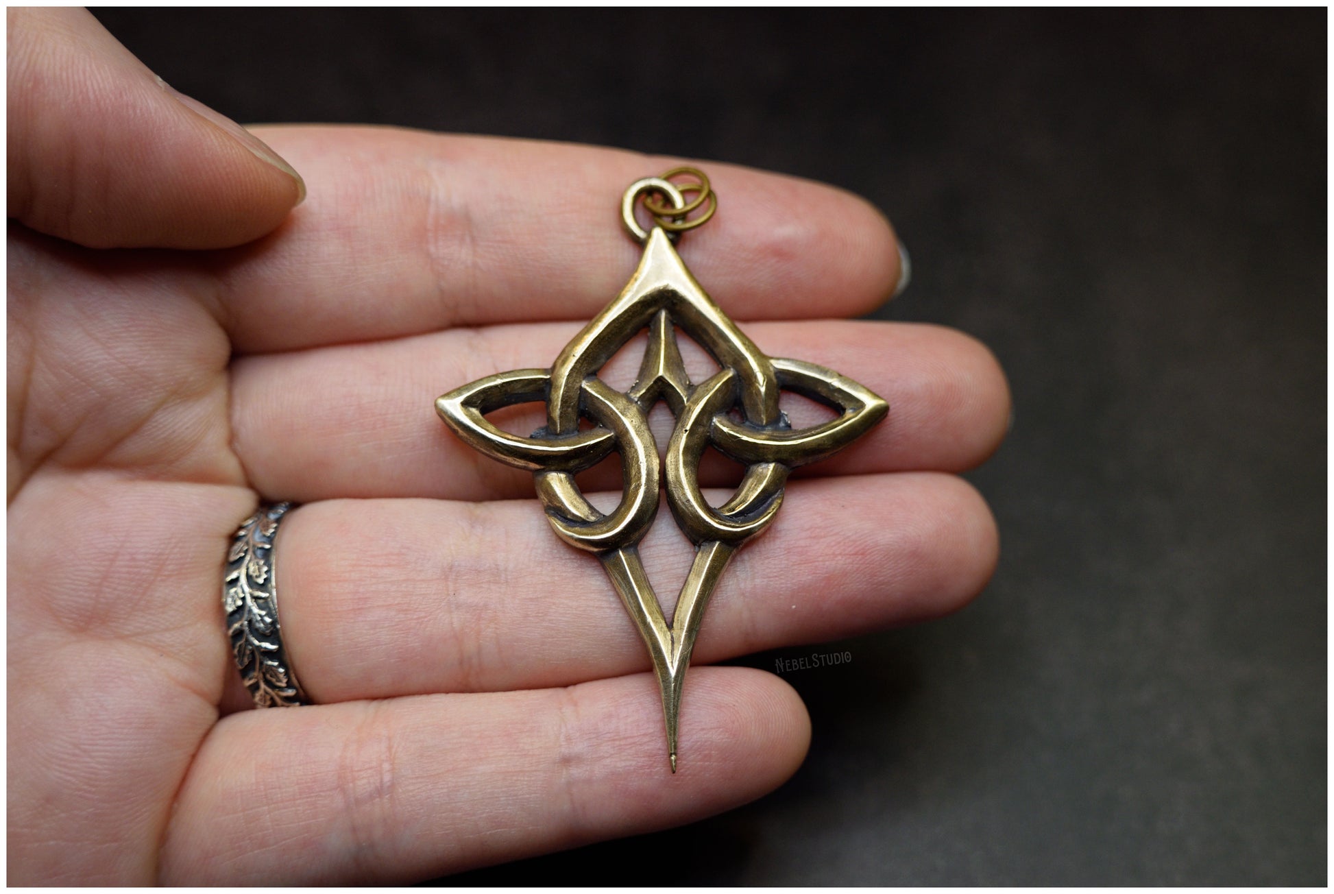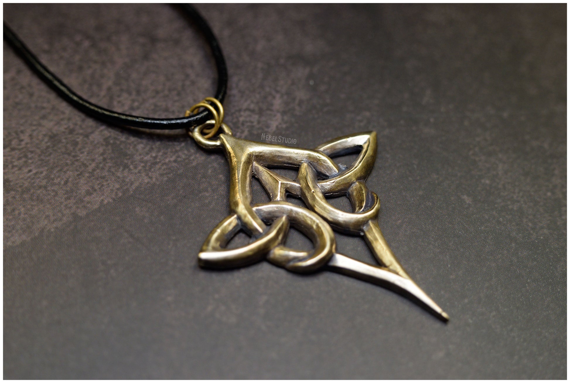 The pendant is reminiscent of the shape of a spearhead. That is why we have dedicated it to Scáthach, the Scottish warrior maiden who taught CúChulainn, legendary hero of the Uster, the art of combat and gave him Gáe Bulg's spear and is also the protector of blacksmiths and goldsmiths. They are made to order.