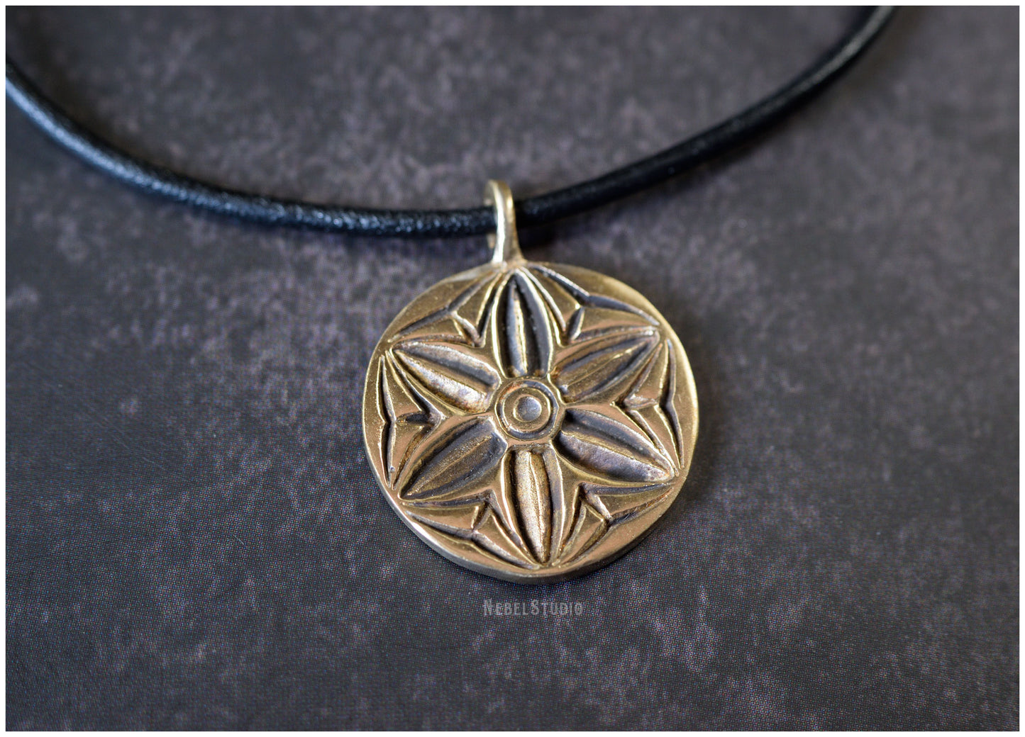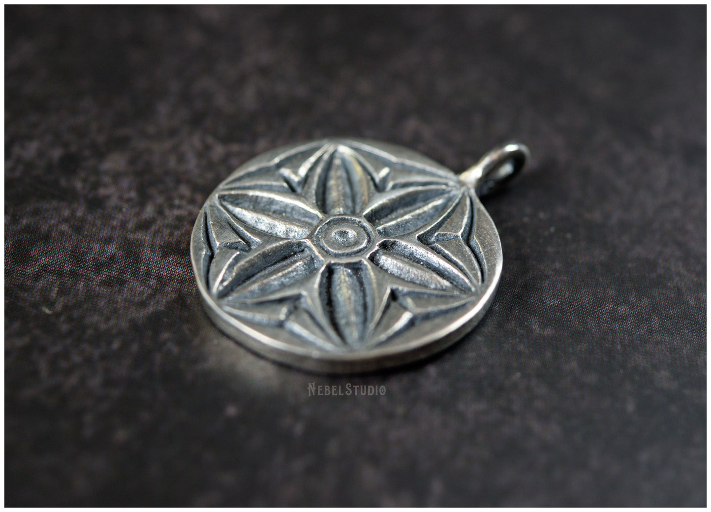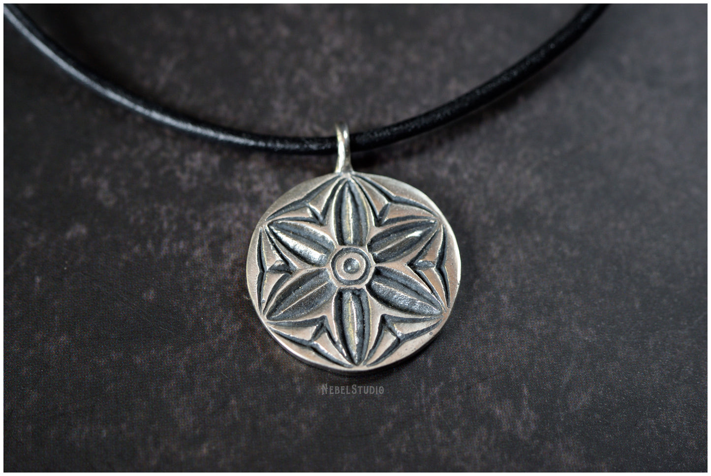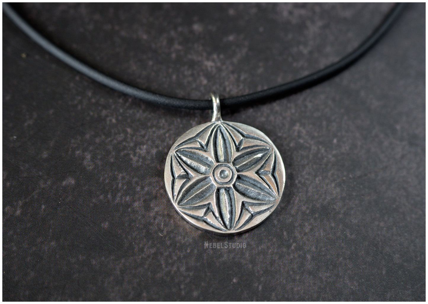 925 sterling silver or bronze pendant with engraved hexafoil, six-petal flower, motif also known as "mark of witch "or" daisy wheel ".