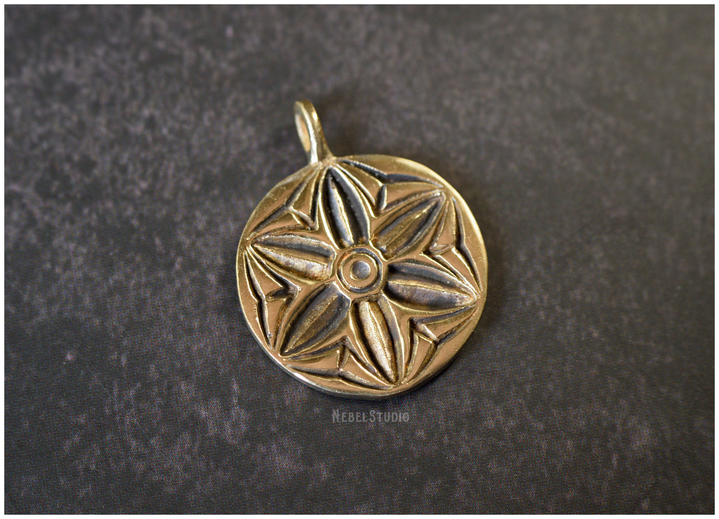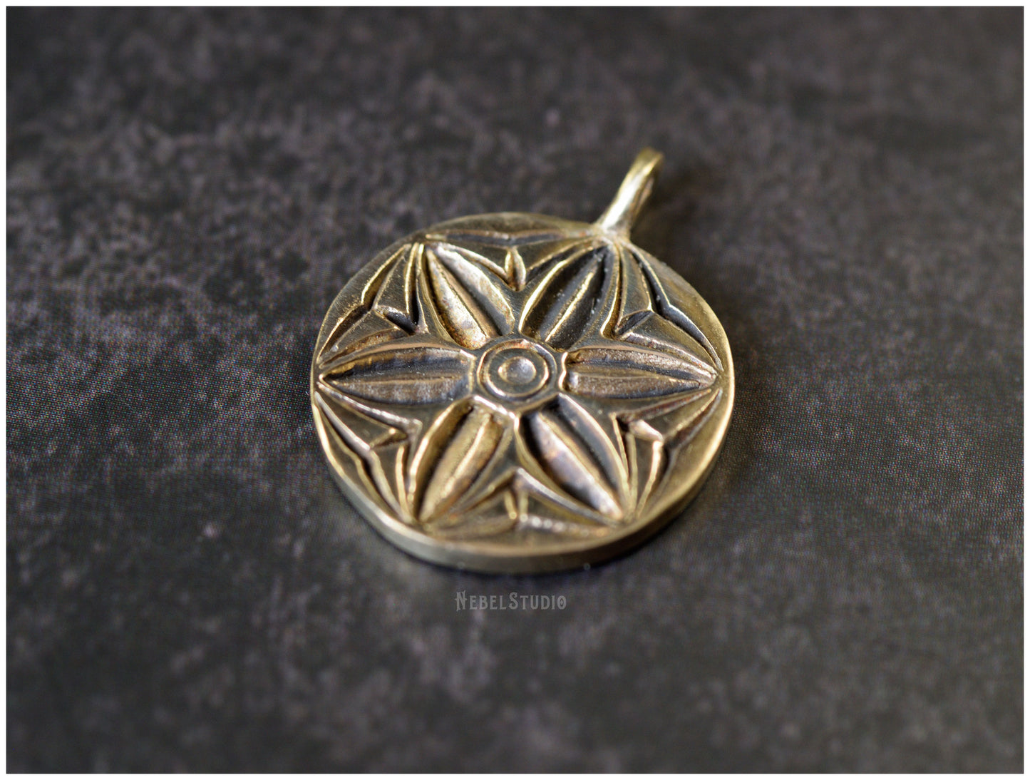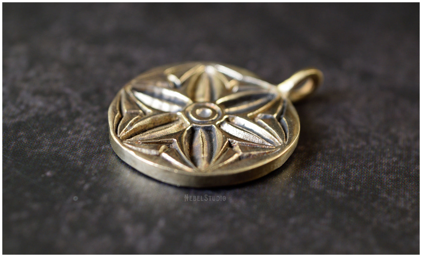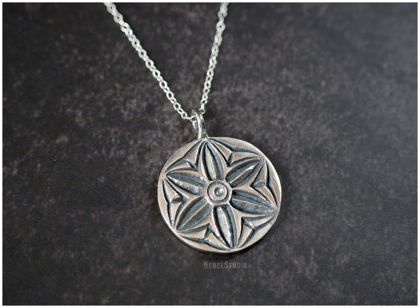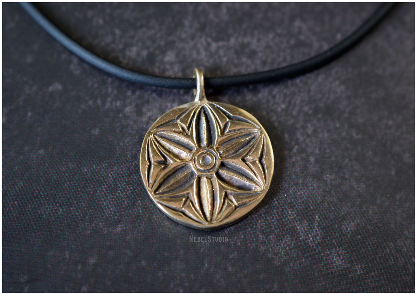 925 sterling silver or bronze pendant with engraved hexafoil, six-petal flower, motif also known as "mark of witch "or" daisy wheel ".
