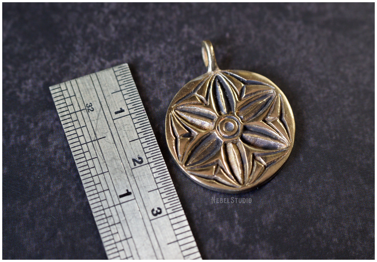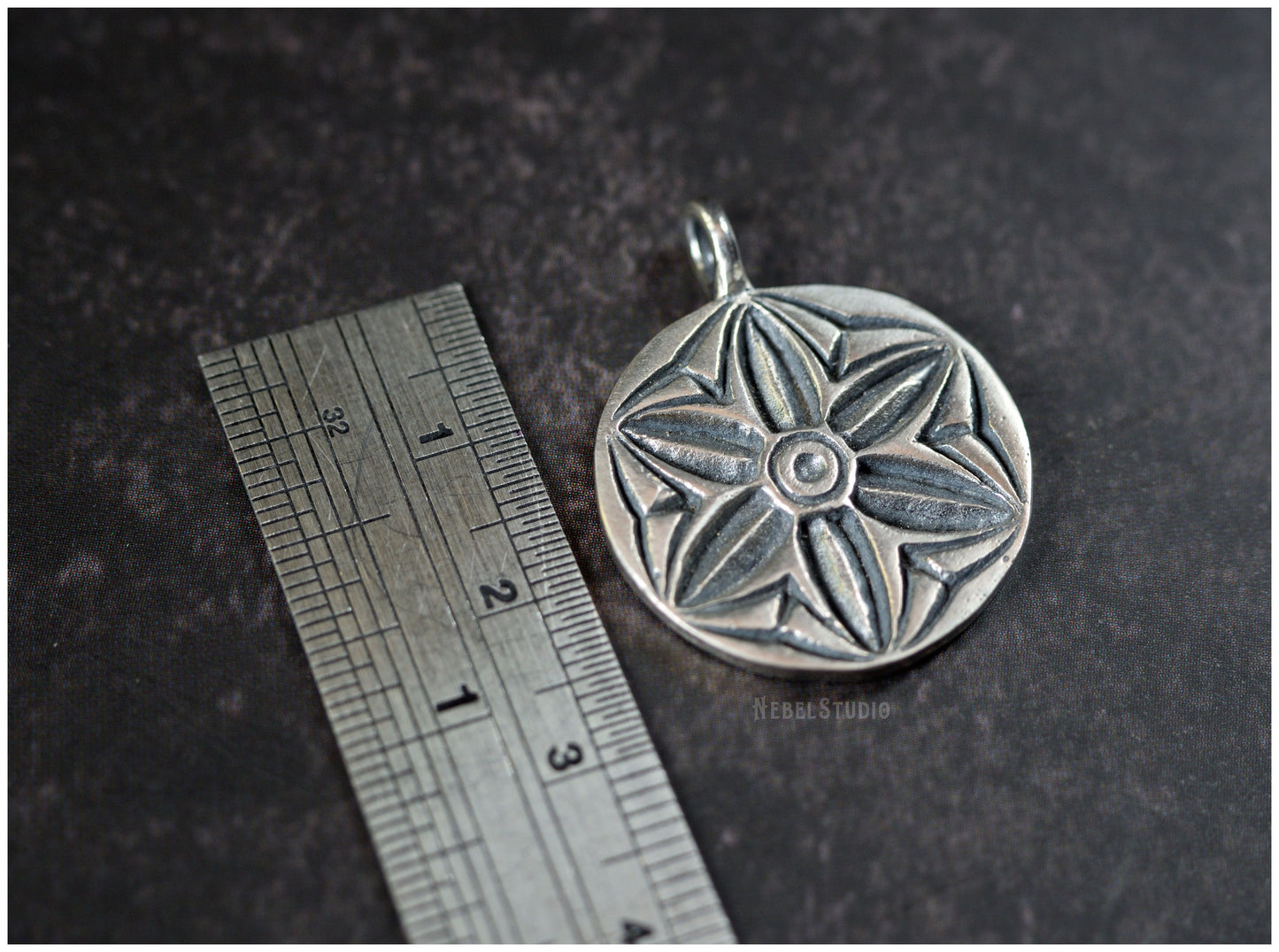 It measures 2.5cm in diameter, counting the ring it measures 3cm high. You can get only the pendant or the pendant with a 50cm black leather cord and silver clasp. The silver version can also be purchased with a 50cm long 925 silver chain. The price varies depending on the option.