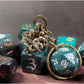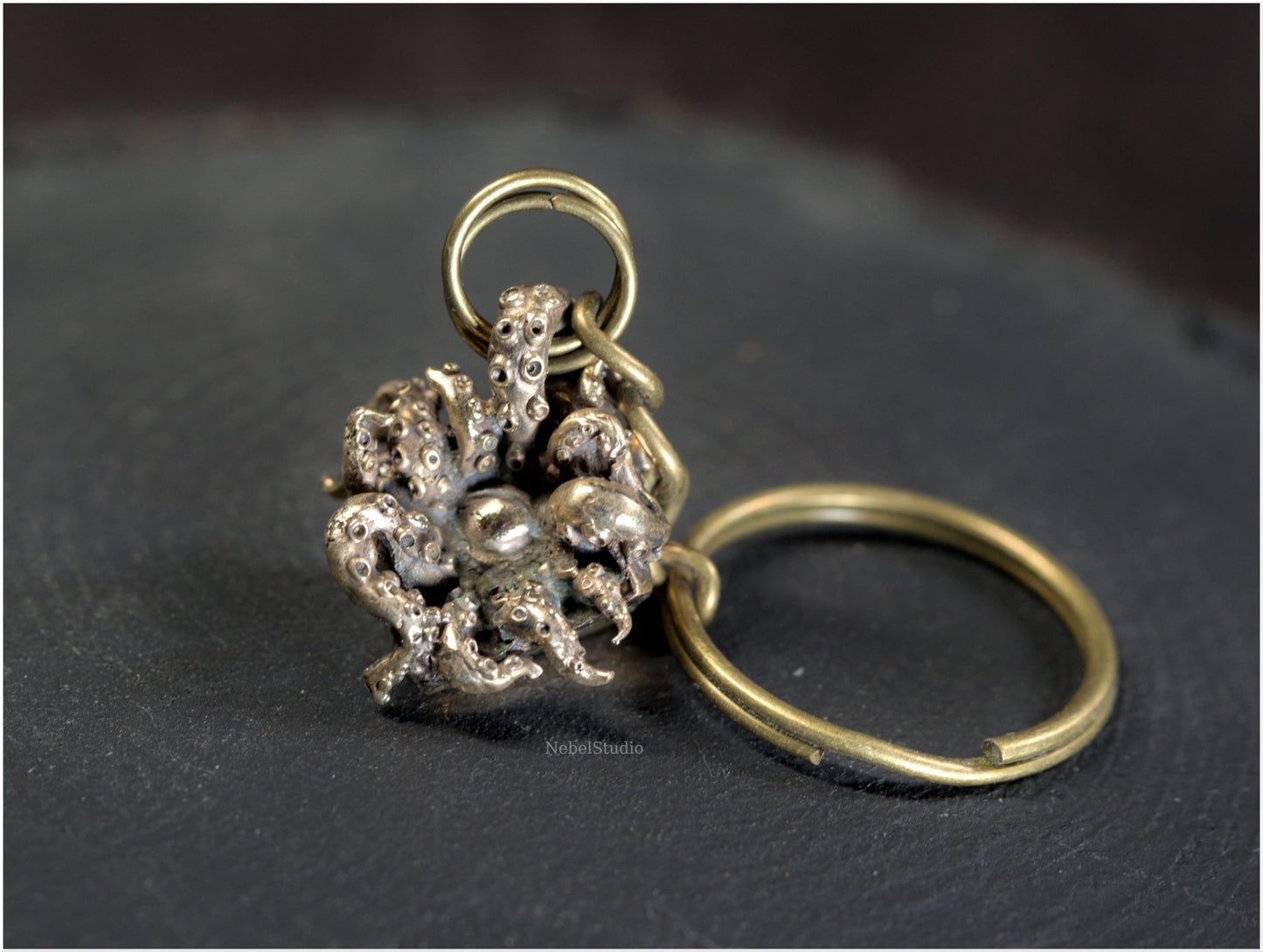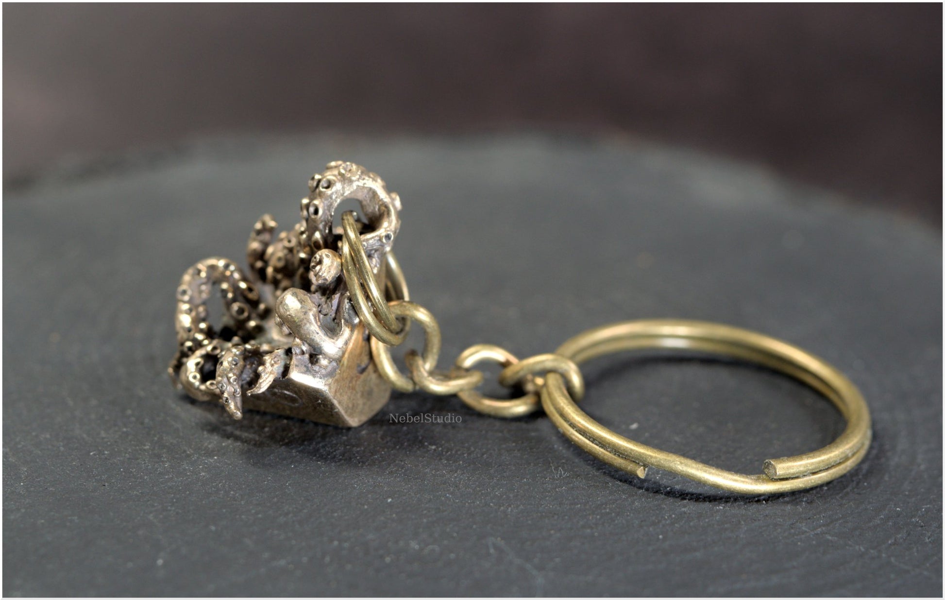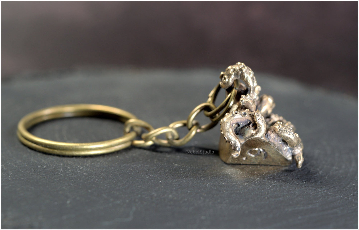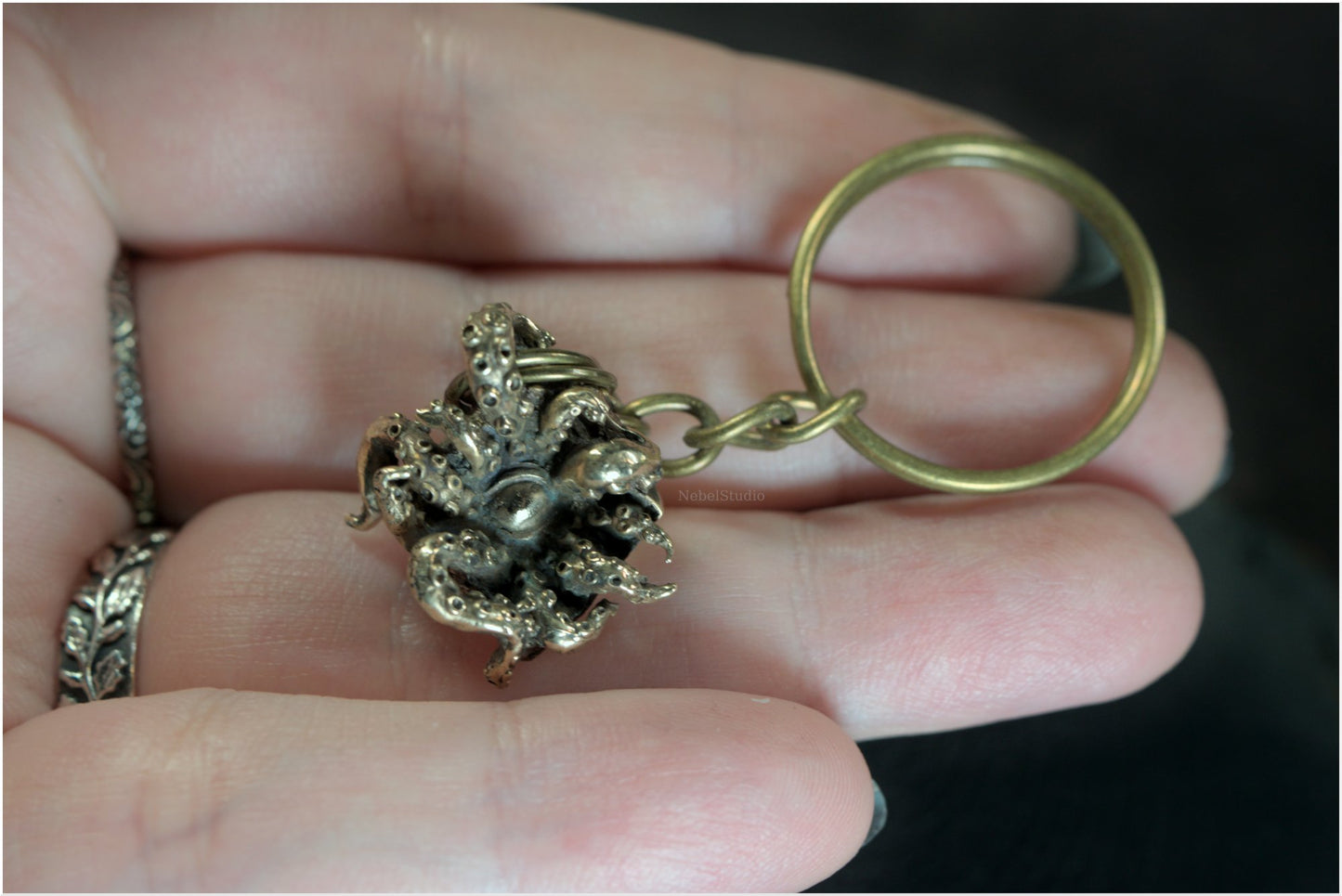 Bronze keychain that, on one side, is a ten-sided dice and, on the other side, a creature with ten tentacles and a single eye emerges from inside of the dice itself.
