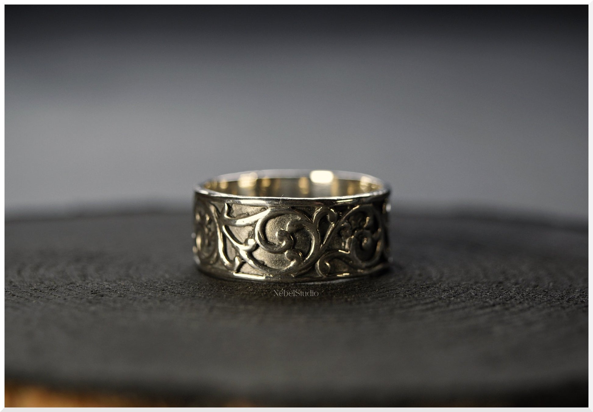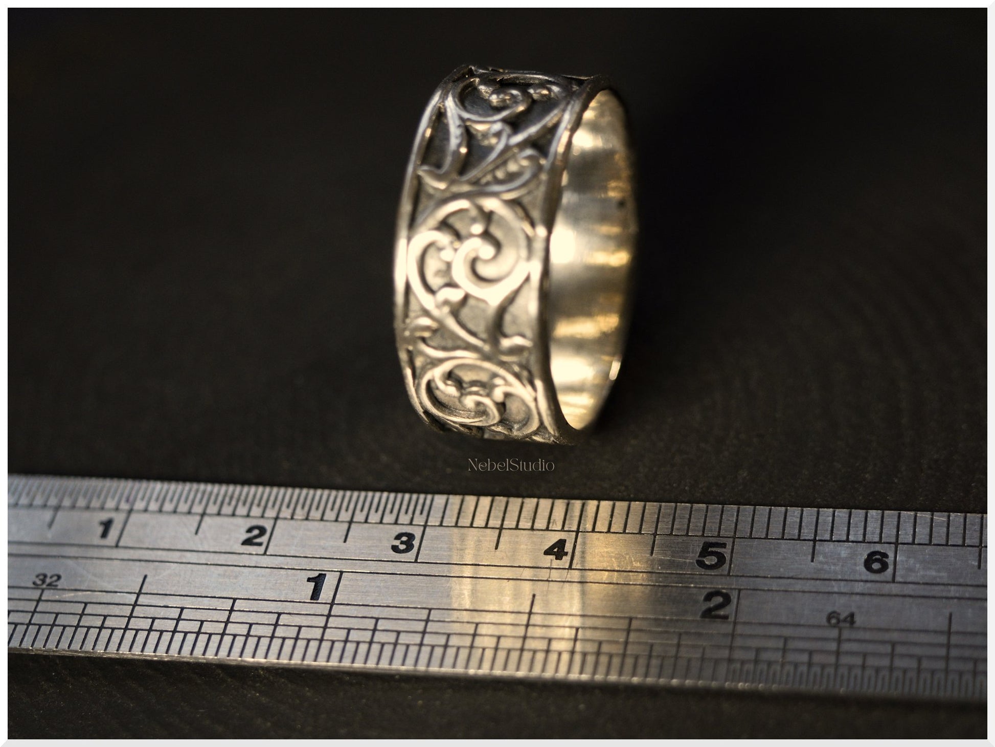 This is a bronze ring. It is a wide, flat band style ring, with a filigree engraving of acanthus leaves.
