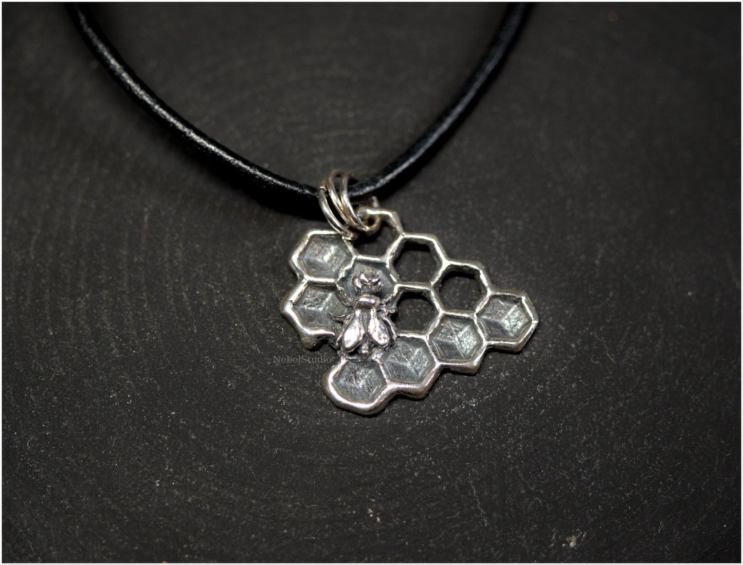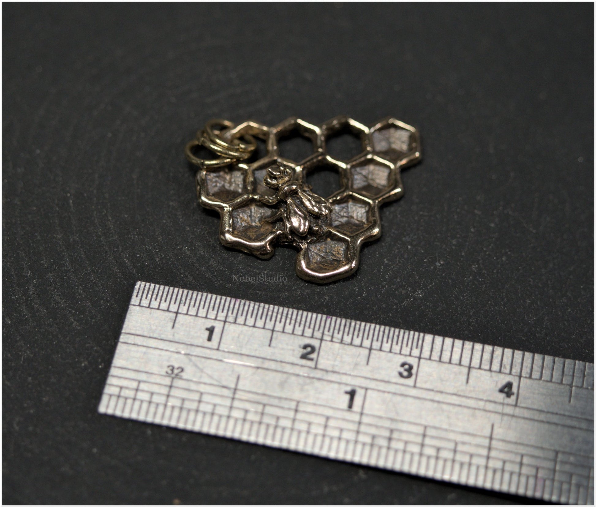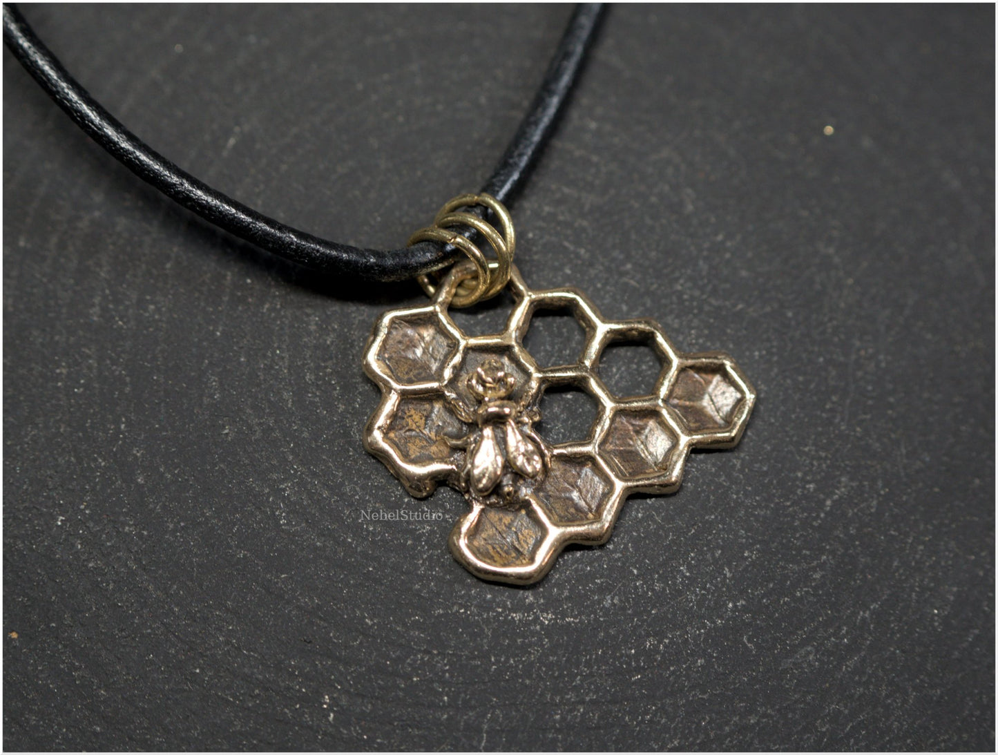 "Apis" significa abeja en latín. La base del colgante está hecha a partir de cera natural de abeja, fundida a metal. La abeja está tallada a mano, también en cera, y mide menos de 1cm. El colgante se sujeta mediante tres argollas que pasan a través de una de las celdas abiertas.