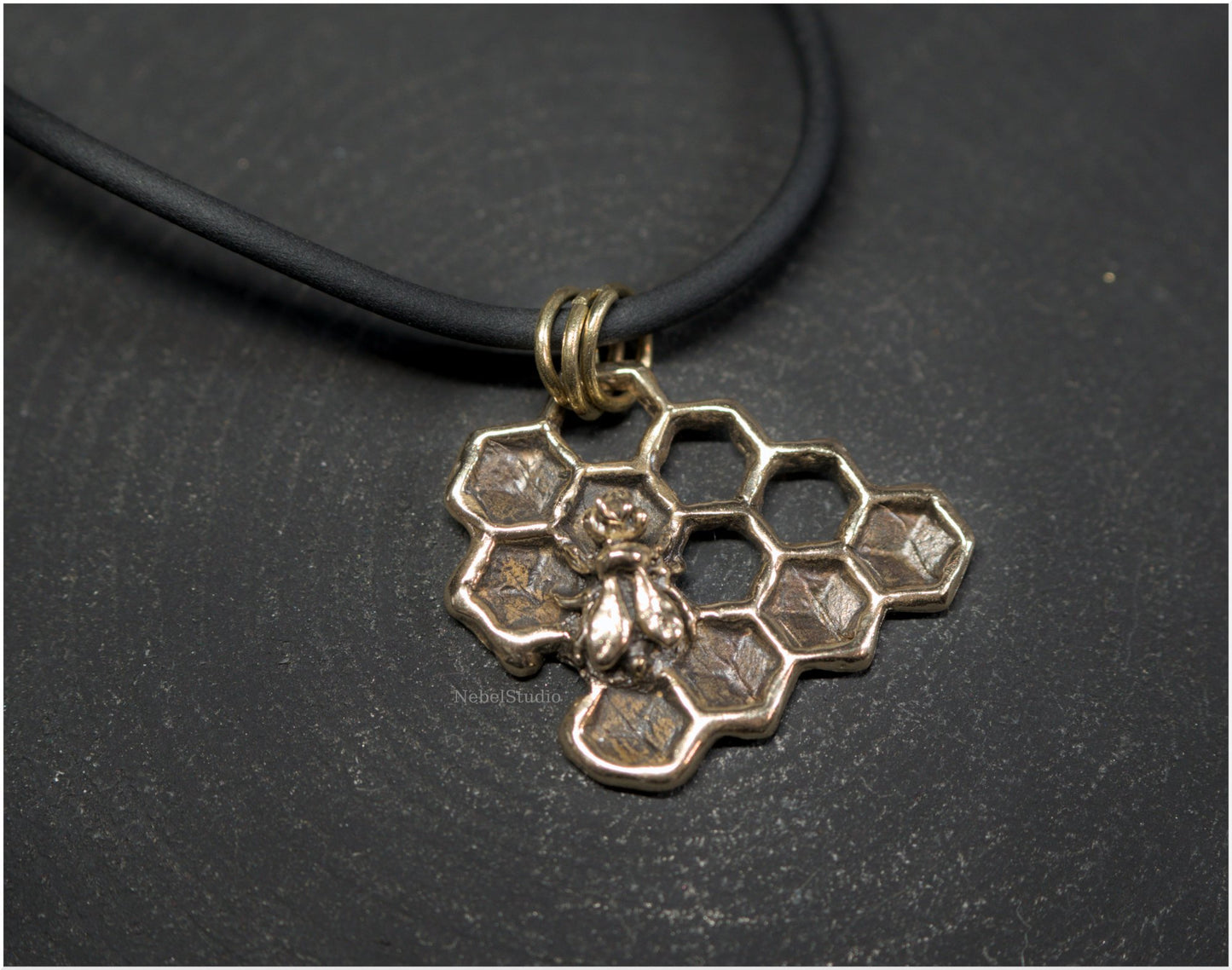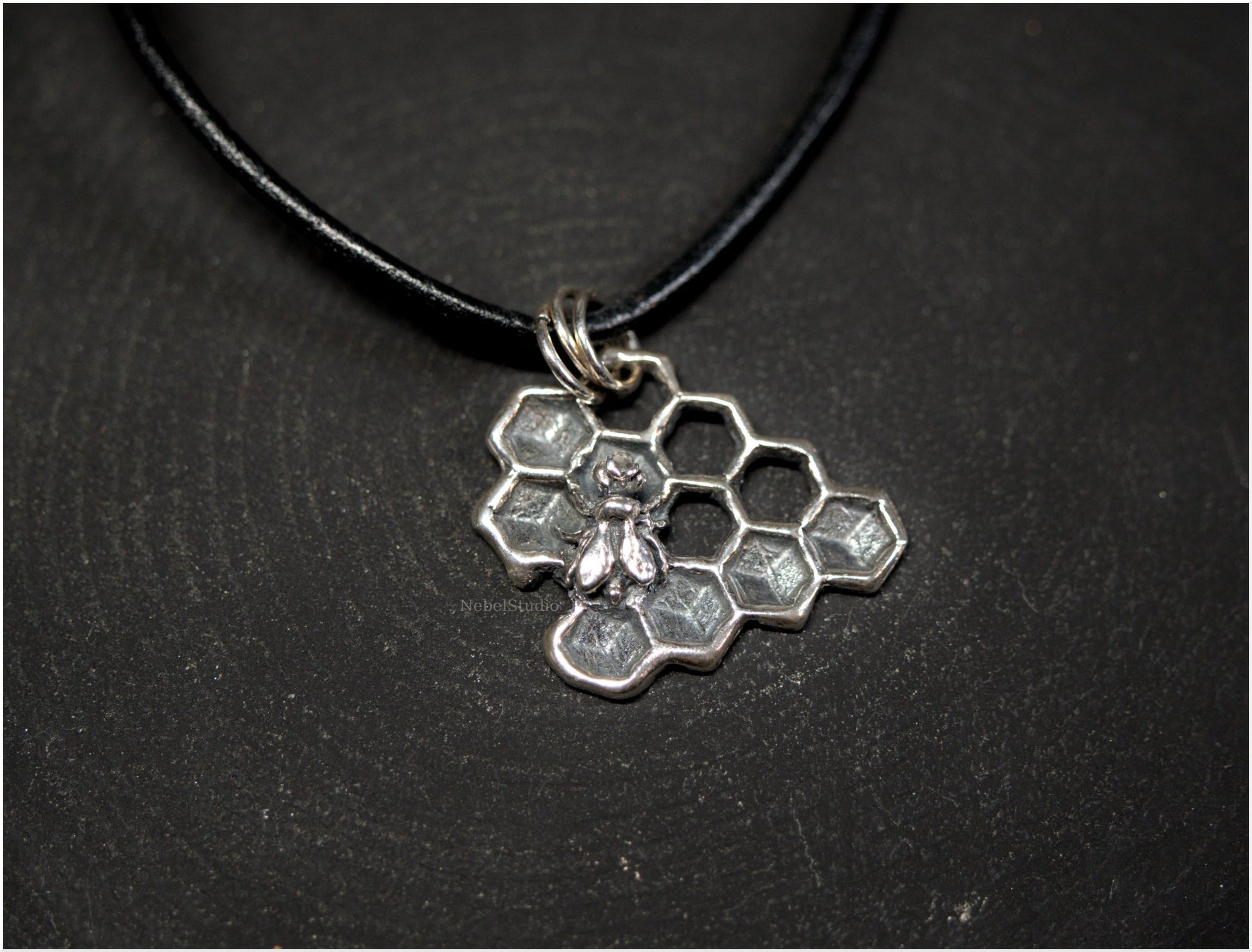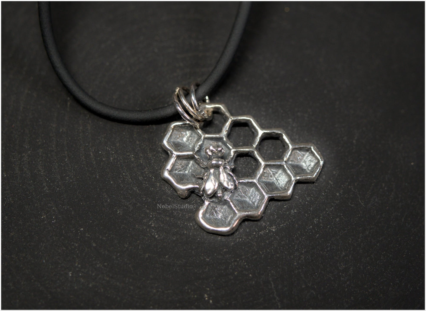 "Apis" significa abeja en latín. La base del colgante está hecha a partir de cera natural de abeja, fundida a metal. La abeja está tallada a mano, también en cera, y mide menos de 1cm. El colgante se sujeta mediante tres argollas que pasan a través de una de las celdas abiertas.