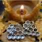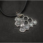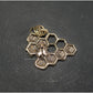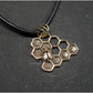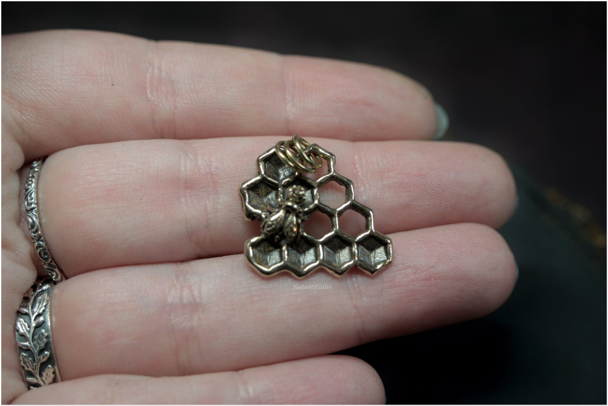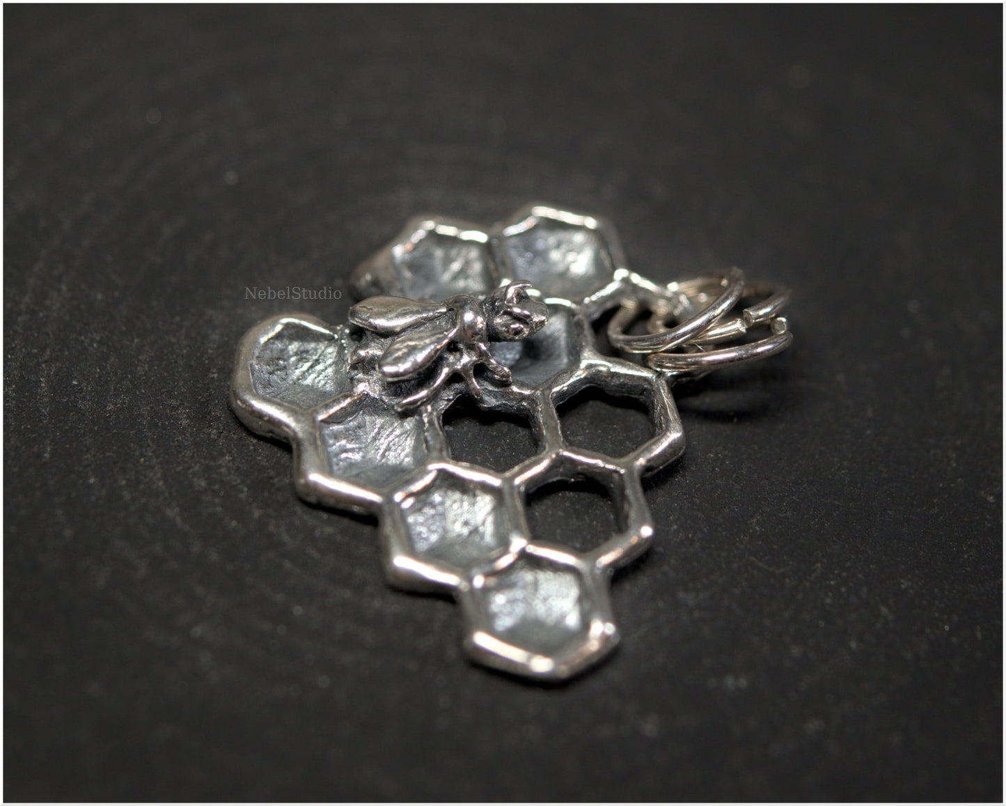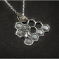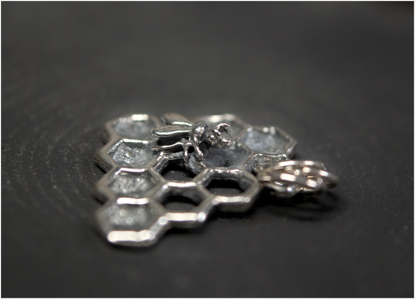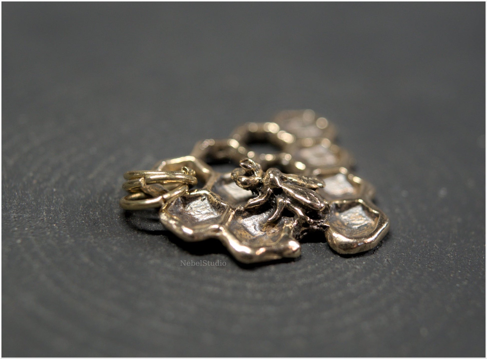 Colgante de plata de ley 925 o bronce en forma de celdas de panal de abeja, algunas abiertas y otras cerradas, con una pequeña abeja posada sobre las mismas.