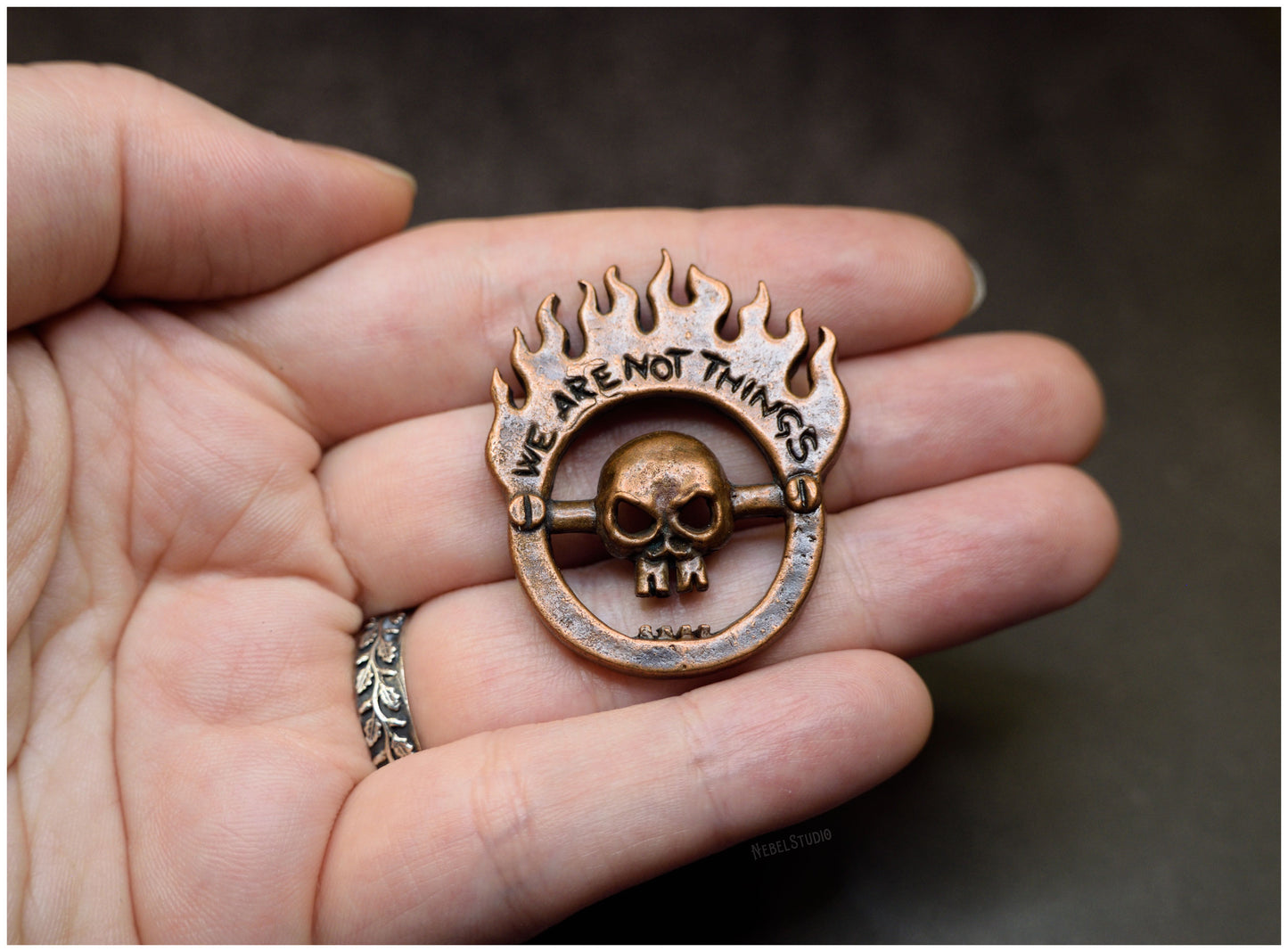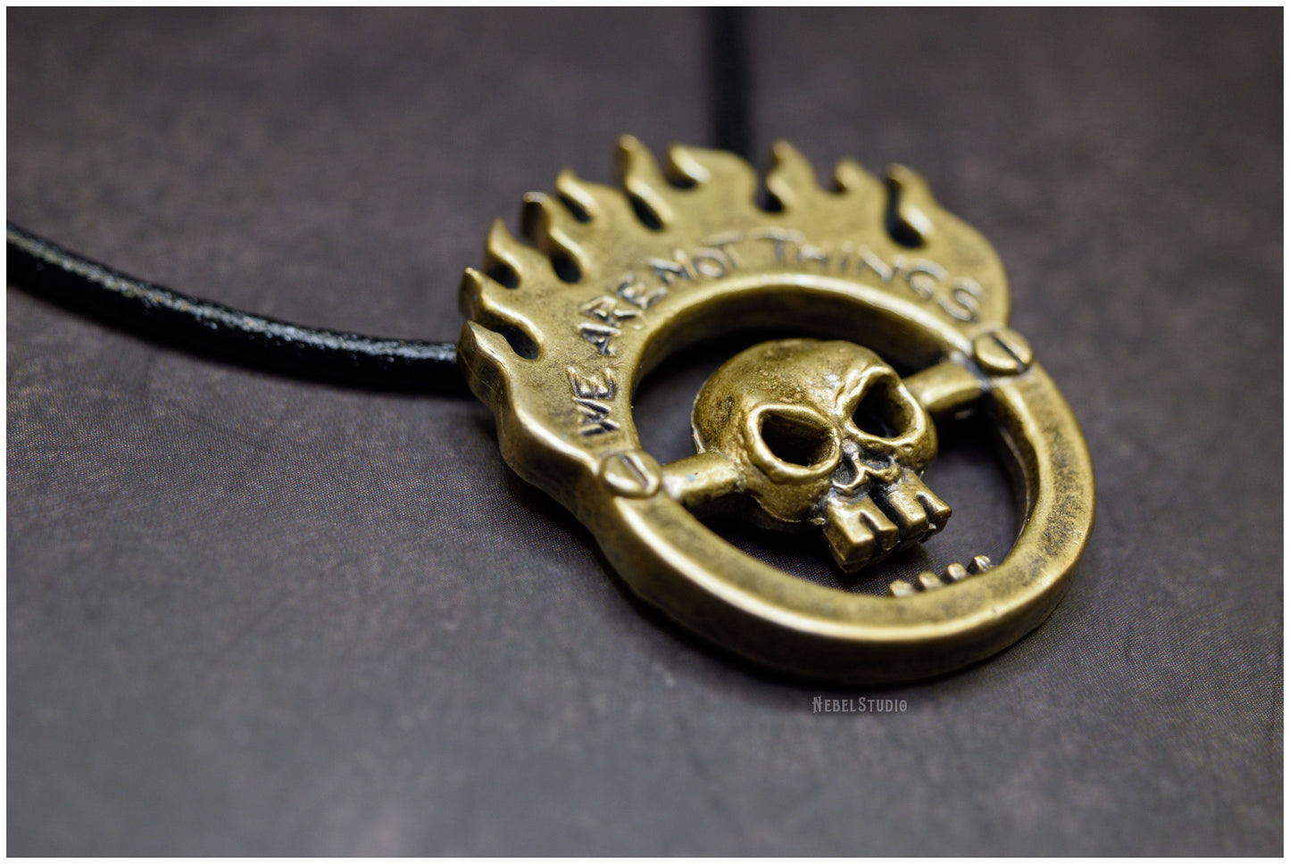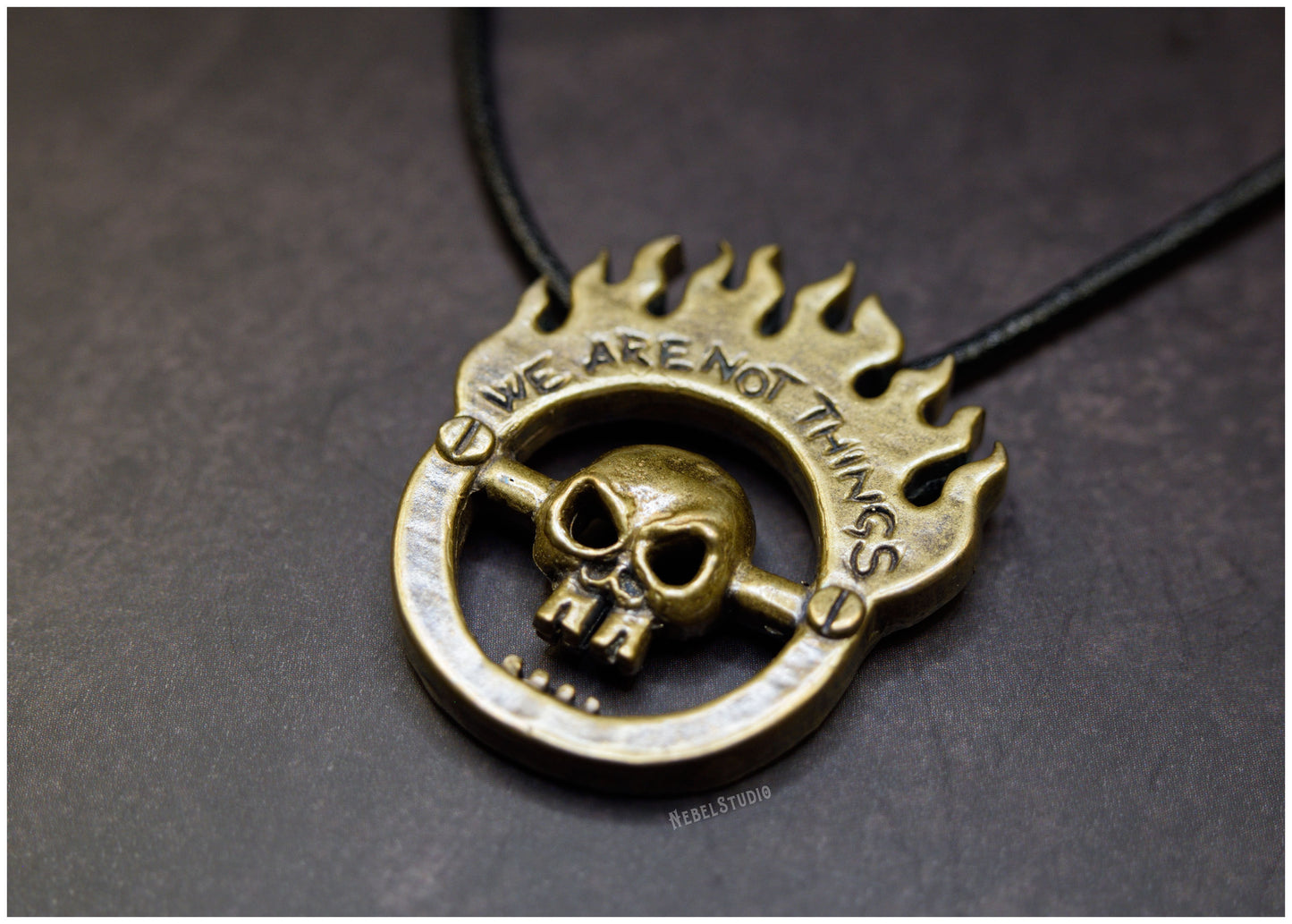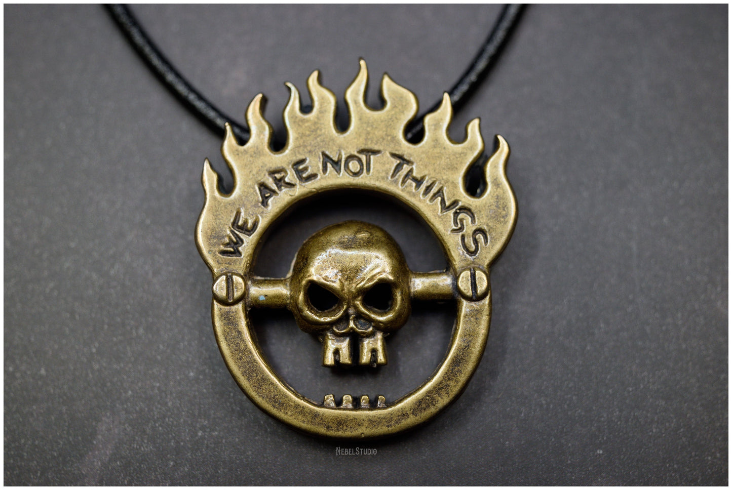 Colgante de bronce We are not things Mad Max Furiosa tributo Inspirado en la insignia del culto V8 de Mad Max Furia en la Carretera (Fury Road) he hecho mi propia versión a modo de colgante. En él se puede leer "We are not things" ("No somos cosas"), un mensaje poderoso e inspirador en muchos sentidos que aparece en la película.