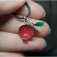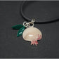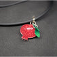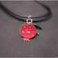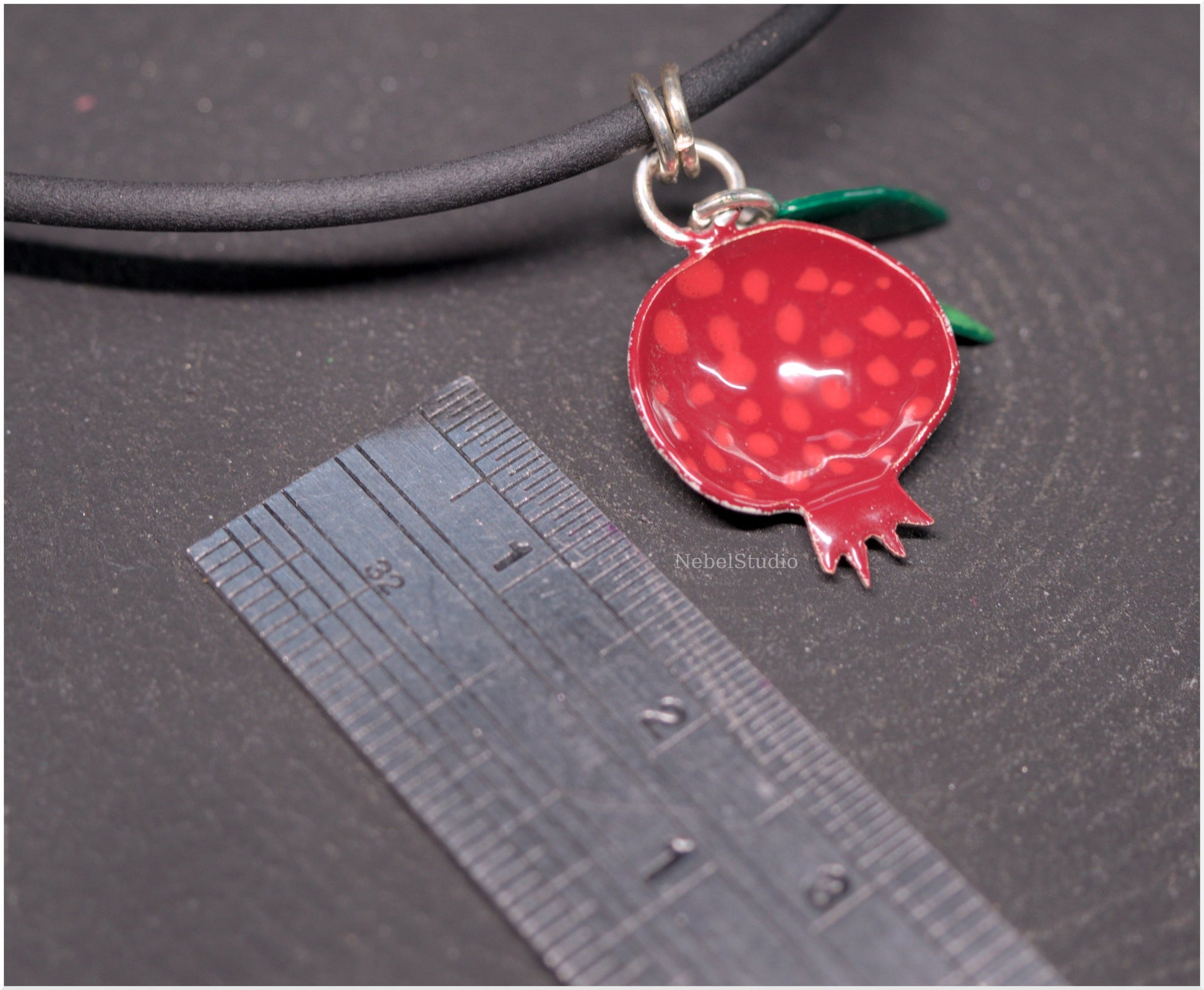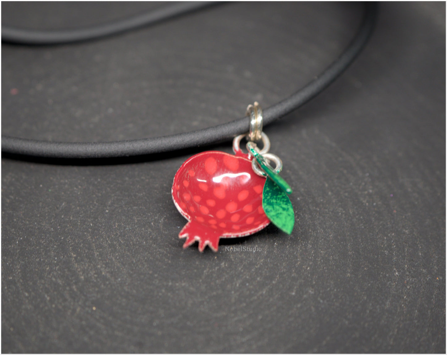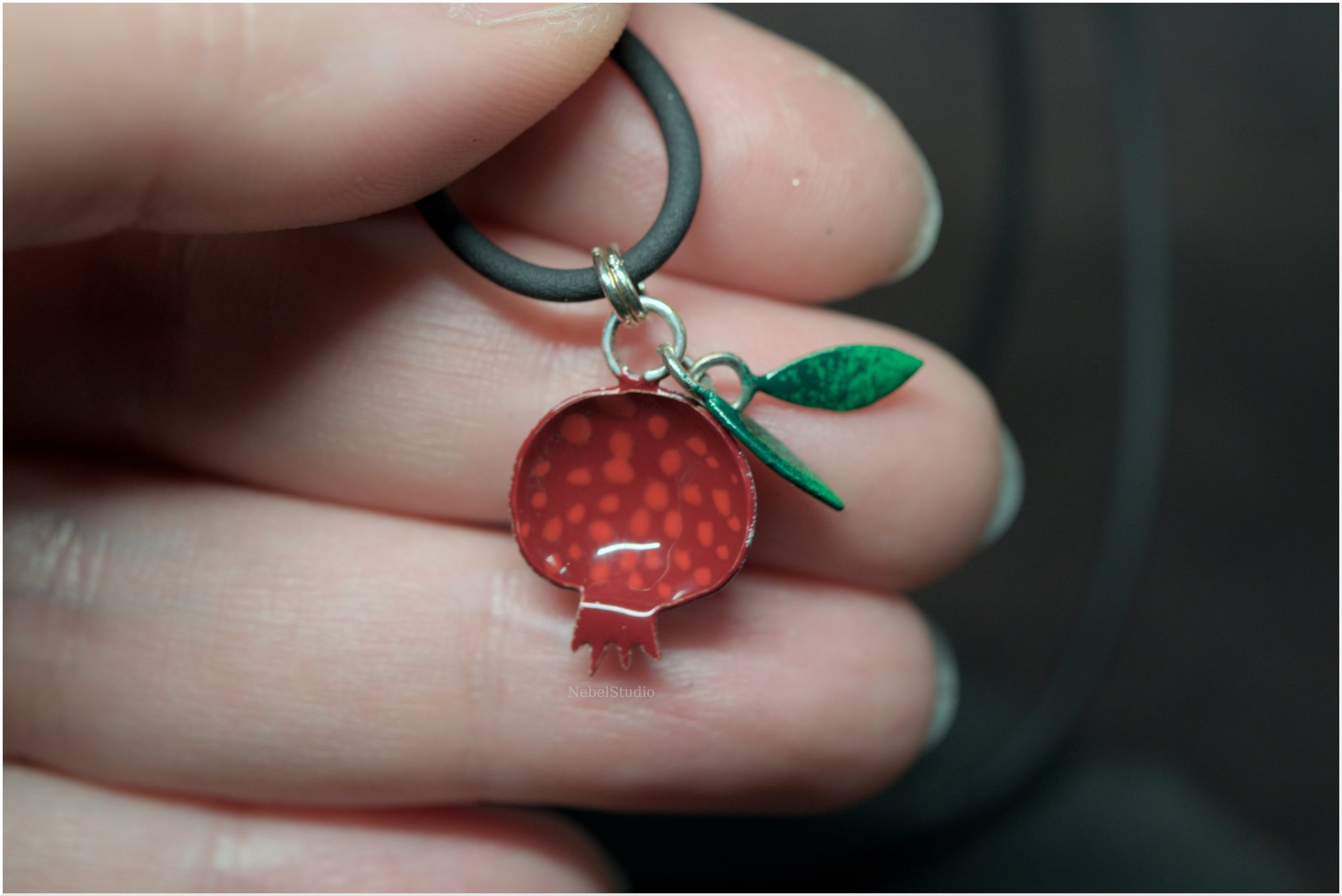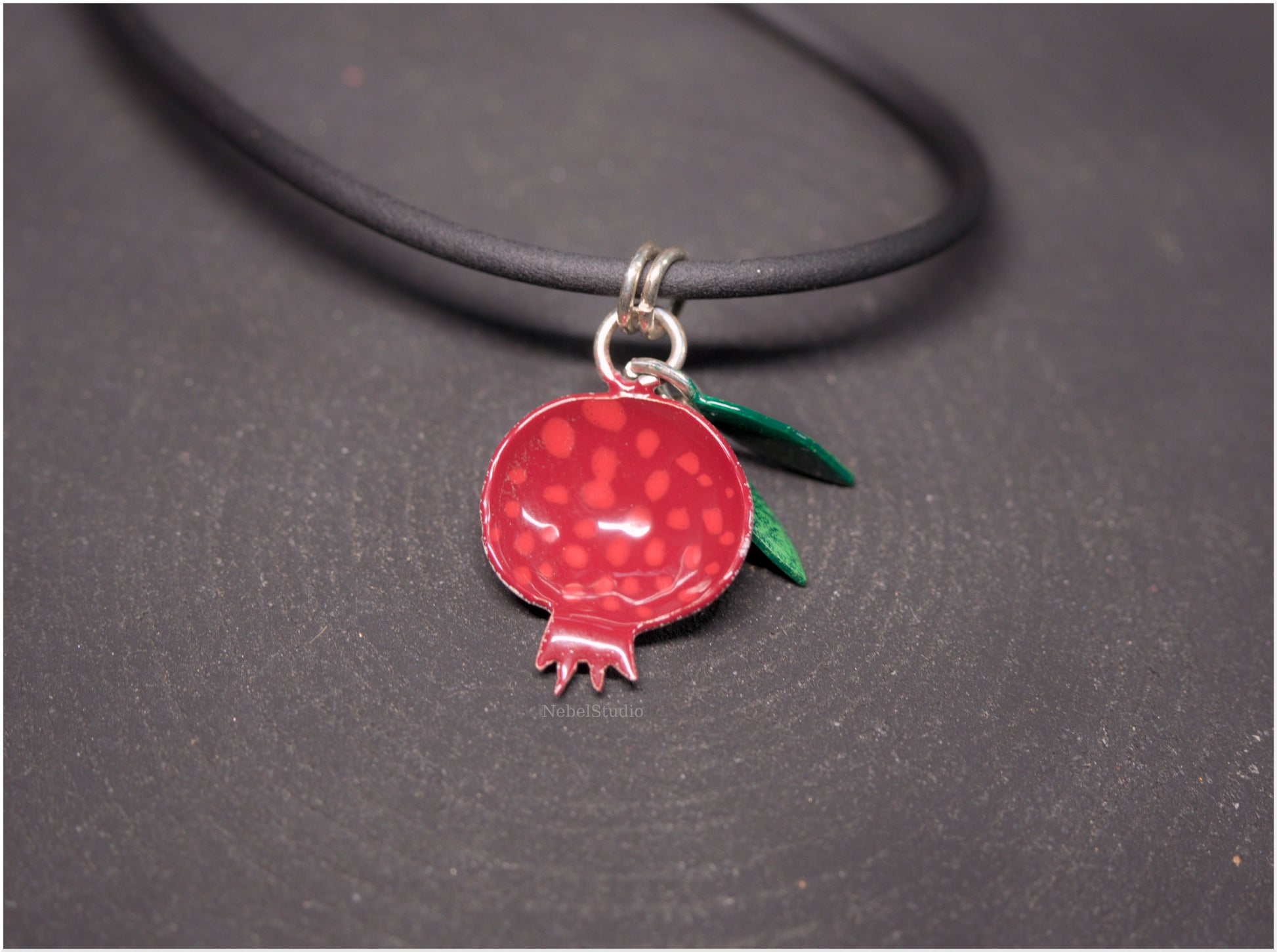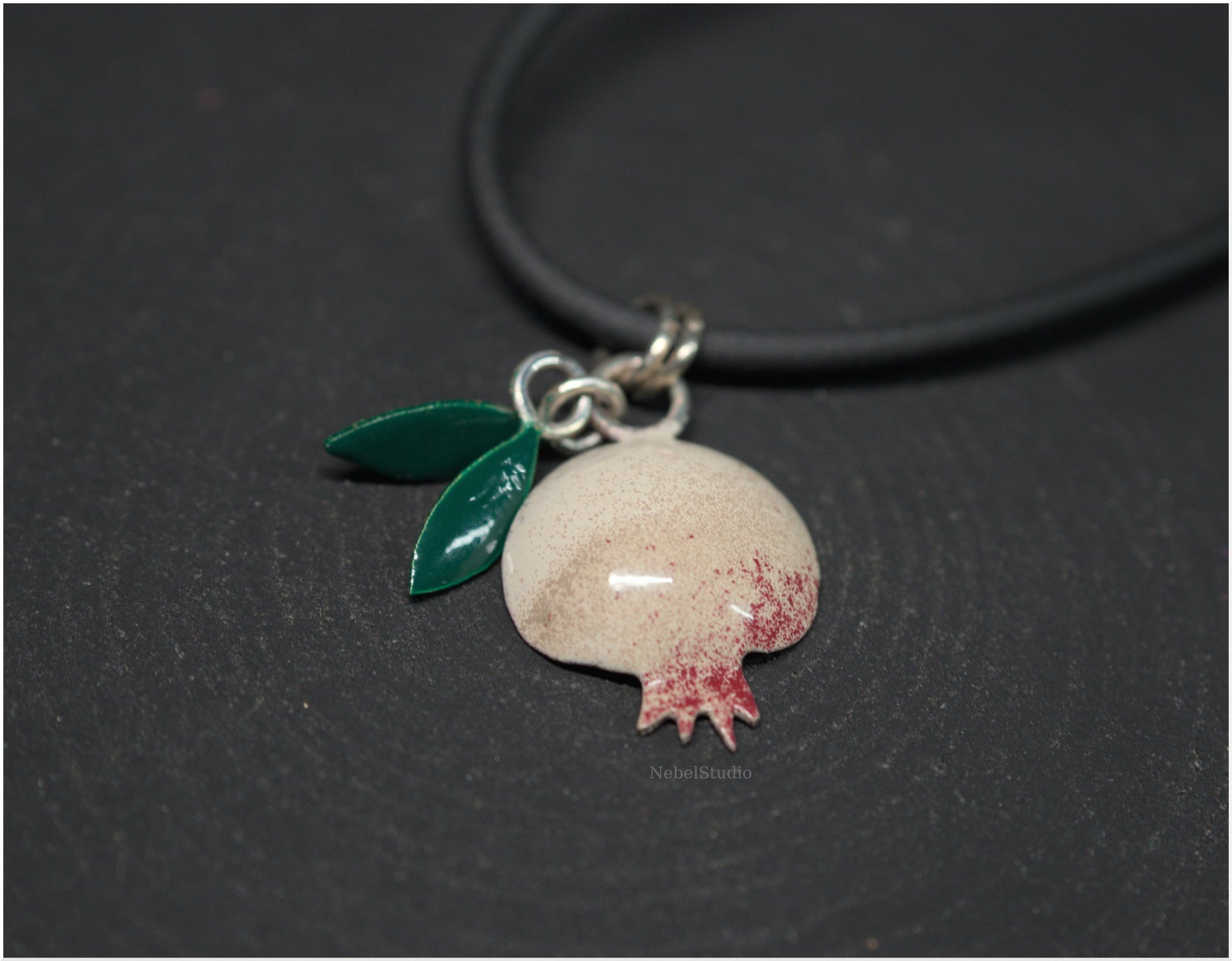 Colgate calado a mano en plancha de cobre en forma de media granada con dos pequeñas hojas verdes. Está esmaltado, por ambos lados, con esmaltes de baja temperatura. La fruta es roja por la parte interior y color beige por el exterior con difuminados en marrón y granate; las hojas en tonos verdes. Todo hecho a mano.