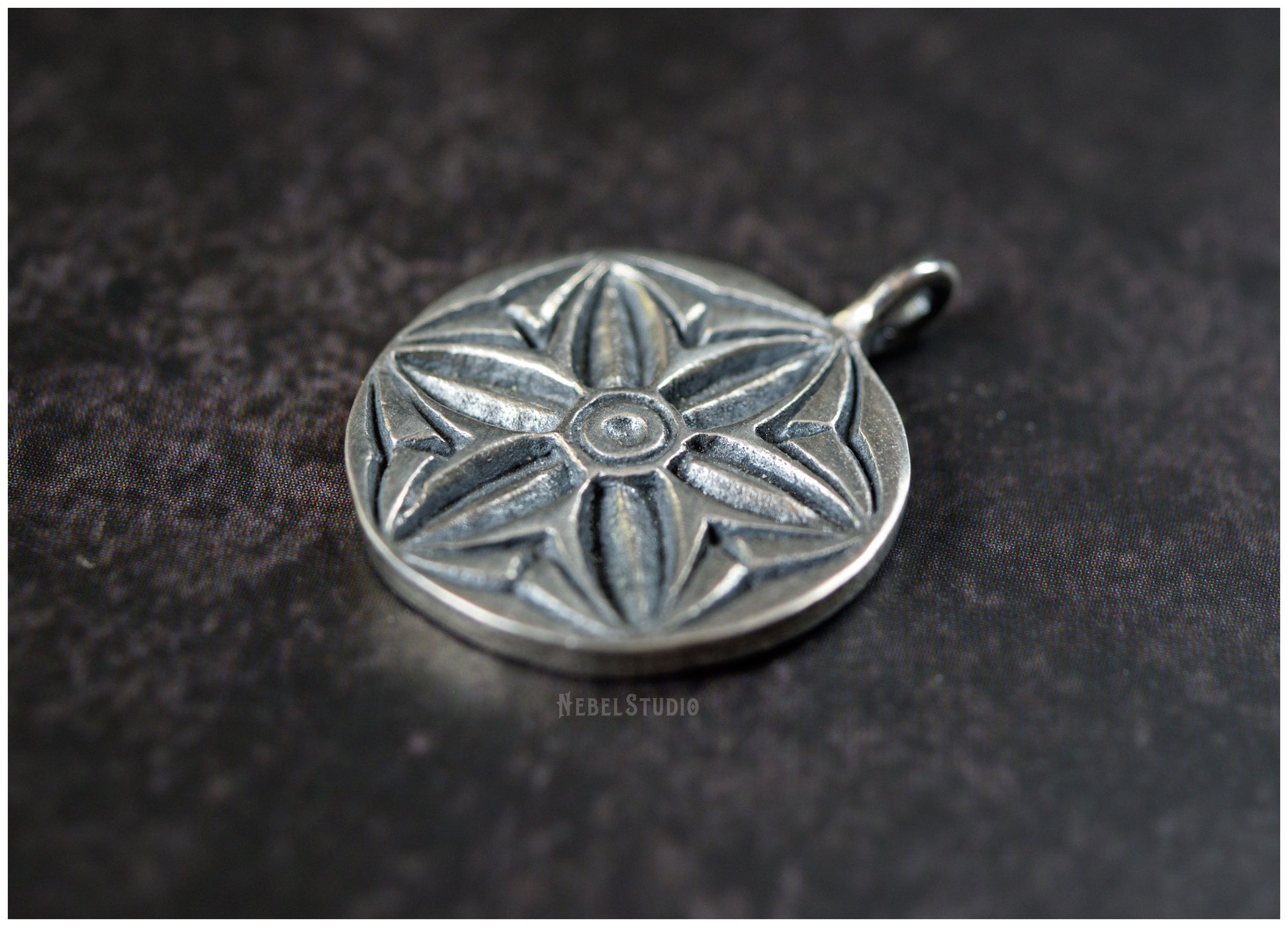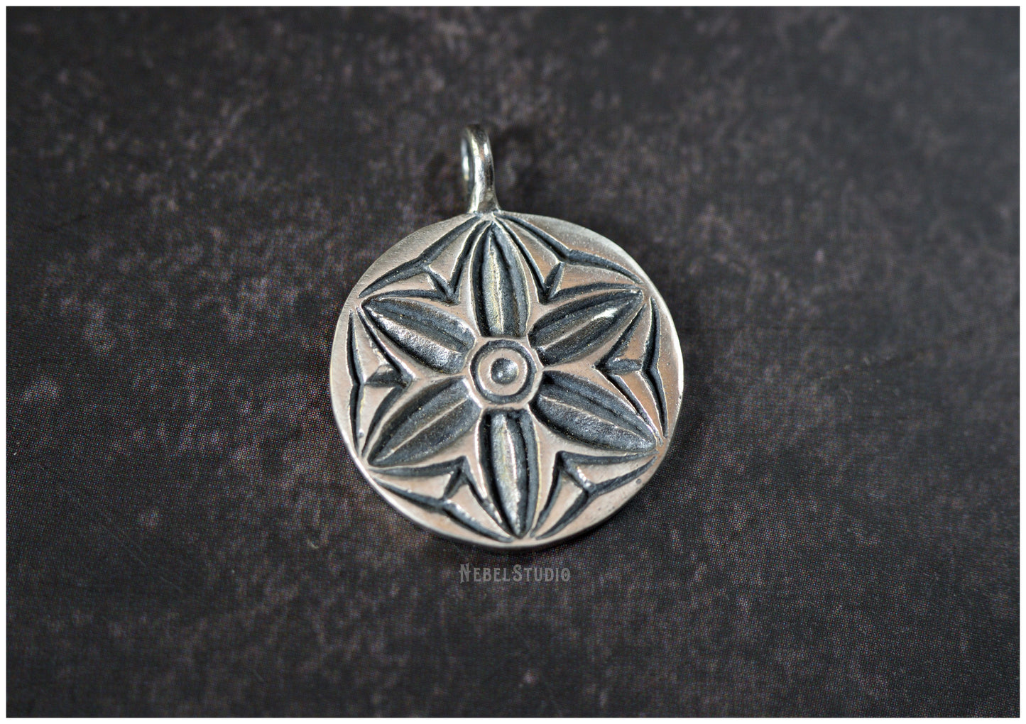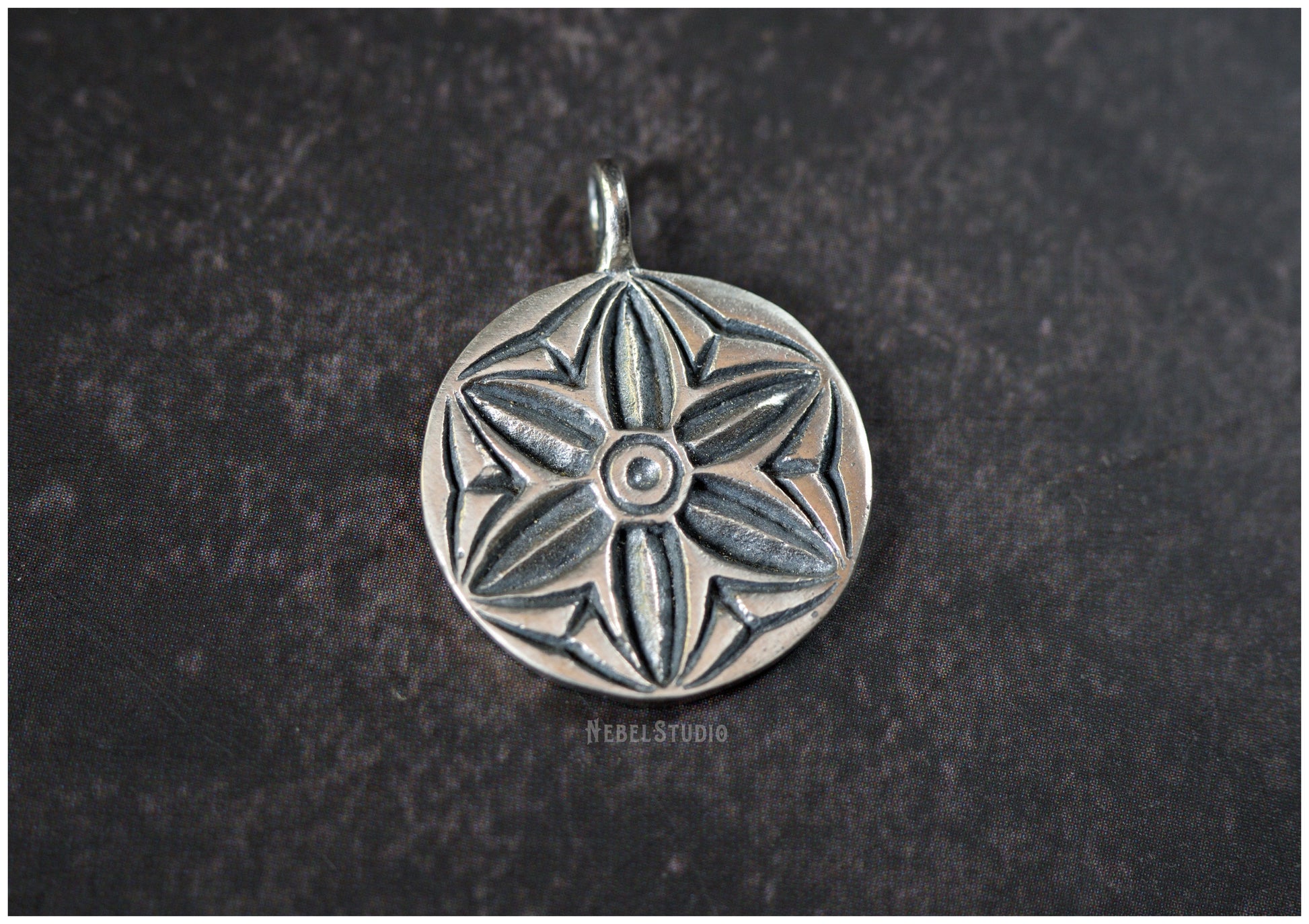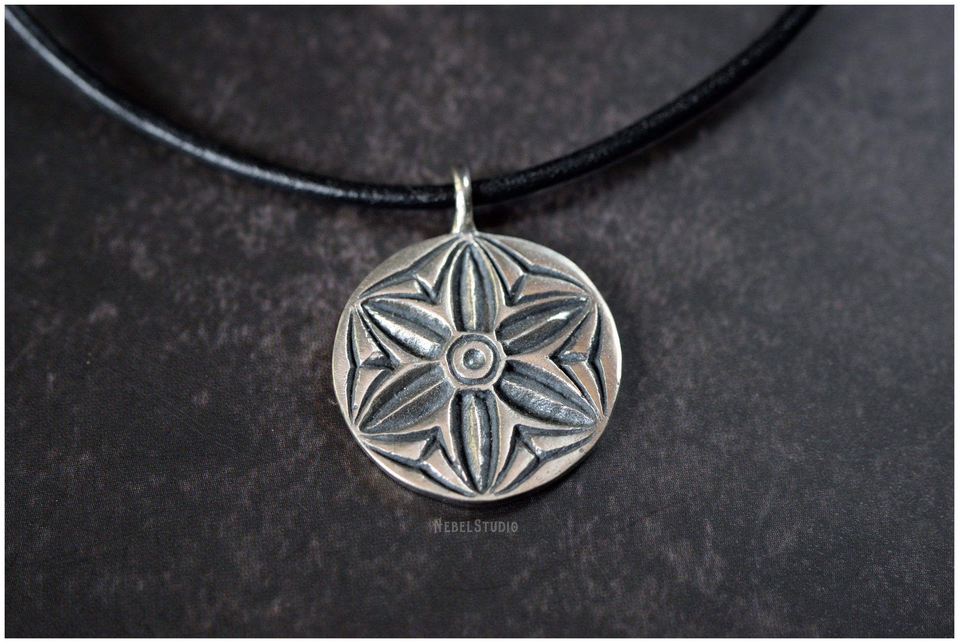 Colgante de plata de ley 925 o bronce con motivo grabado de roseta hexapétala, flor de seis pétalos, también conocida como "marca de bruja" o "daisy wheel" en inglés.