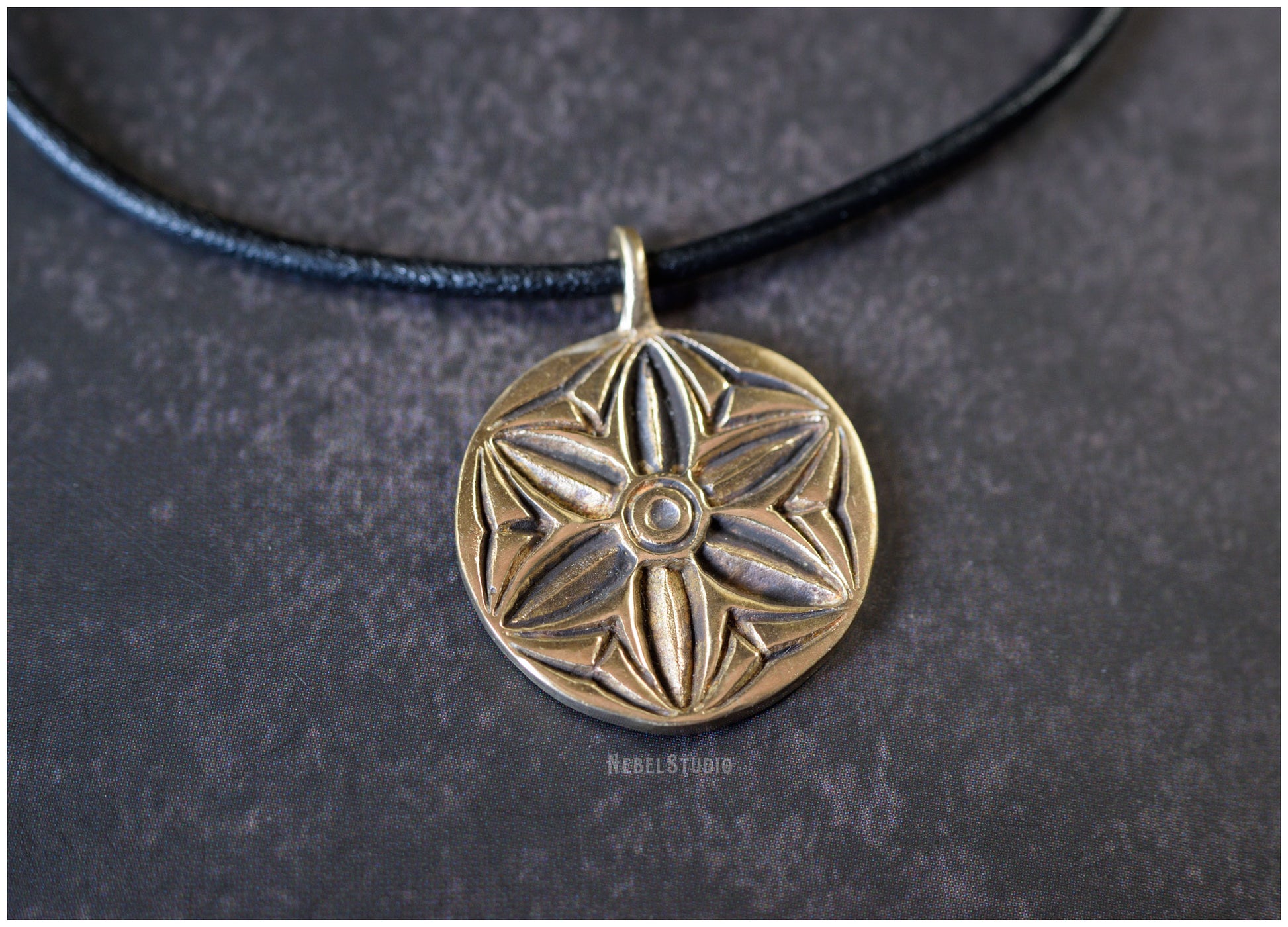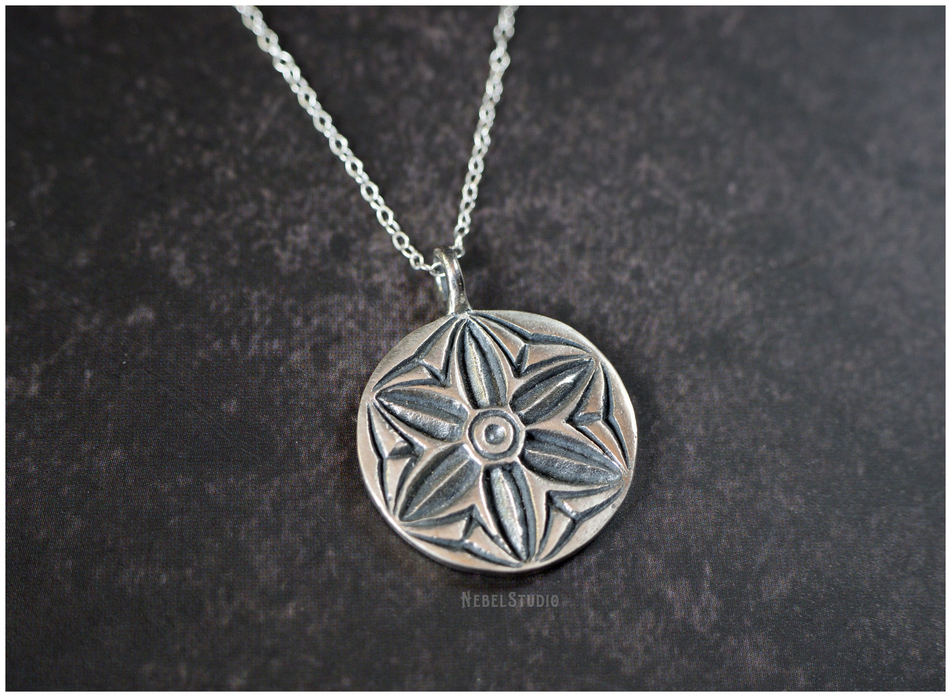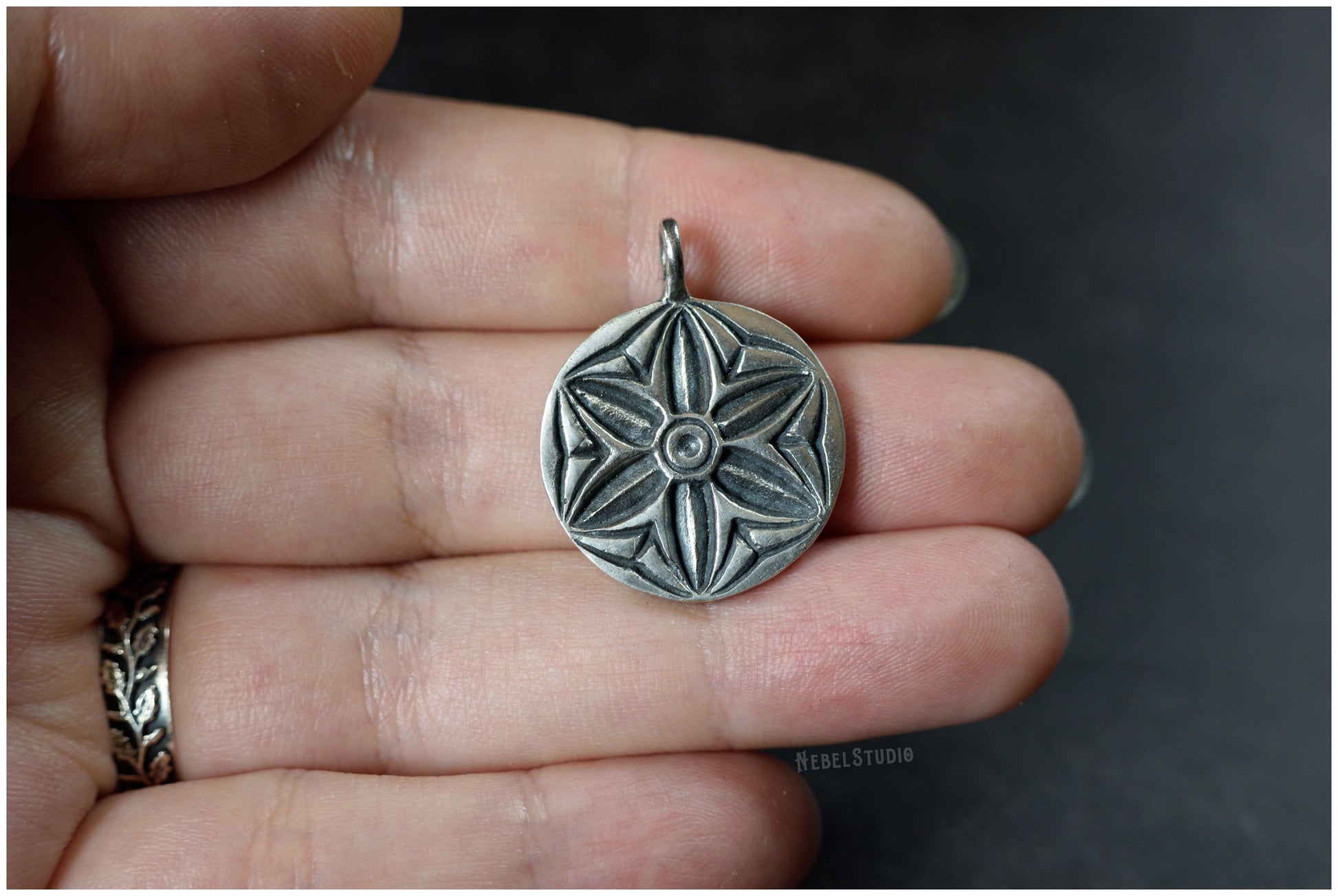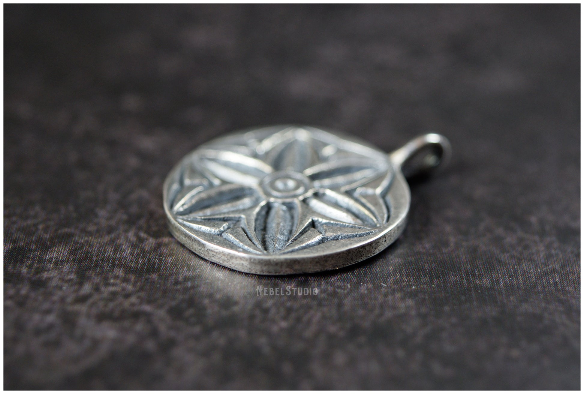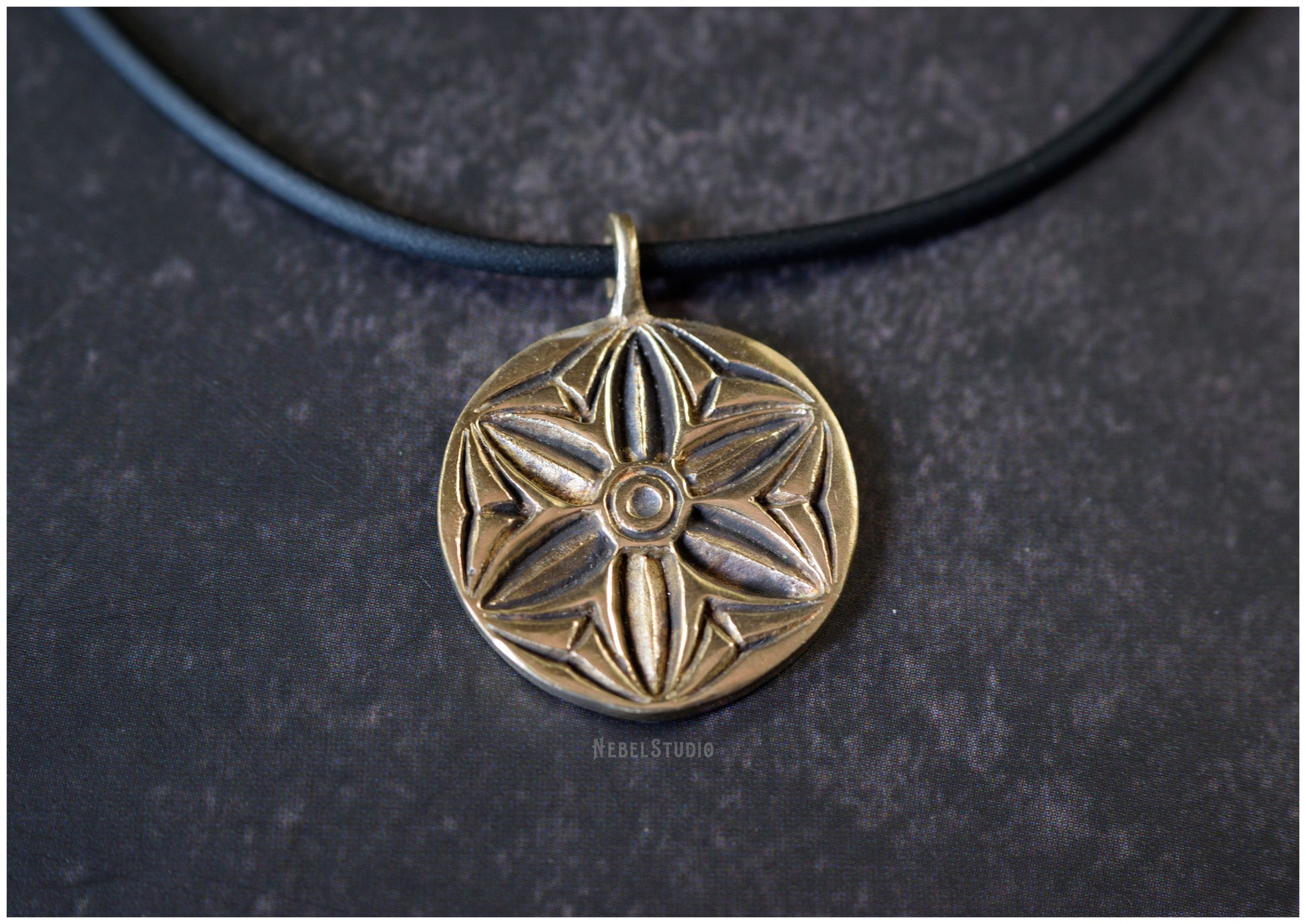 Colgante de plata de ley 925 o bronce con motivo grabado de roseta hexapétala, flor de seis pétalos, también conocida como "marca de bruja" o "daisy wheel" en inglés.