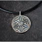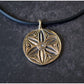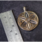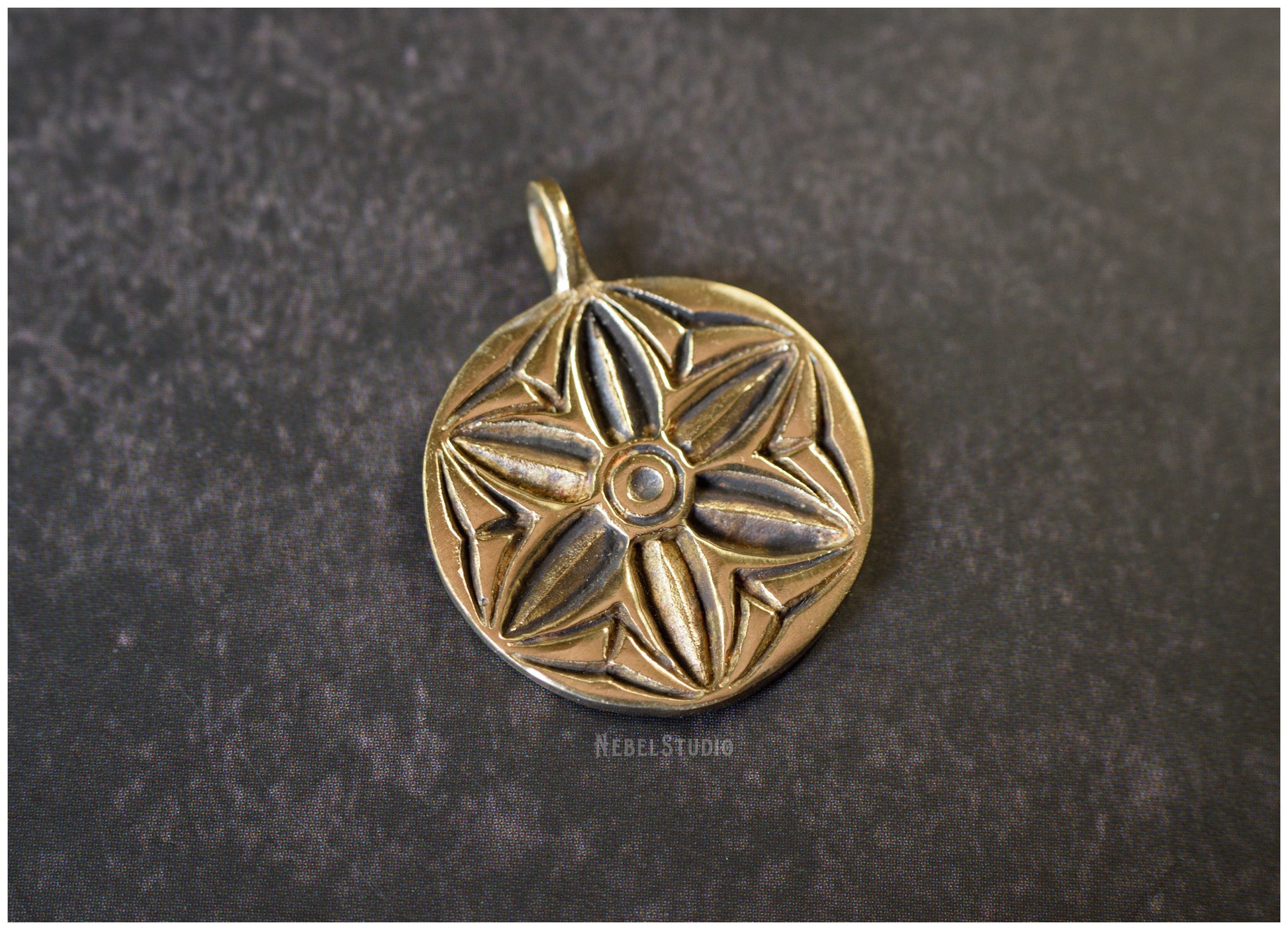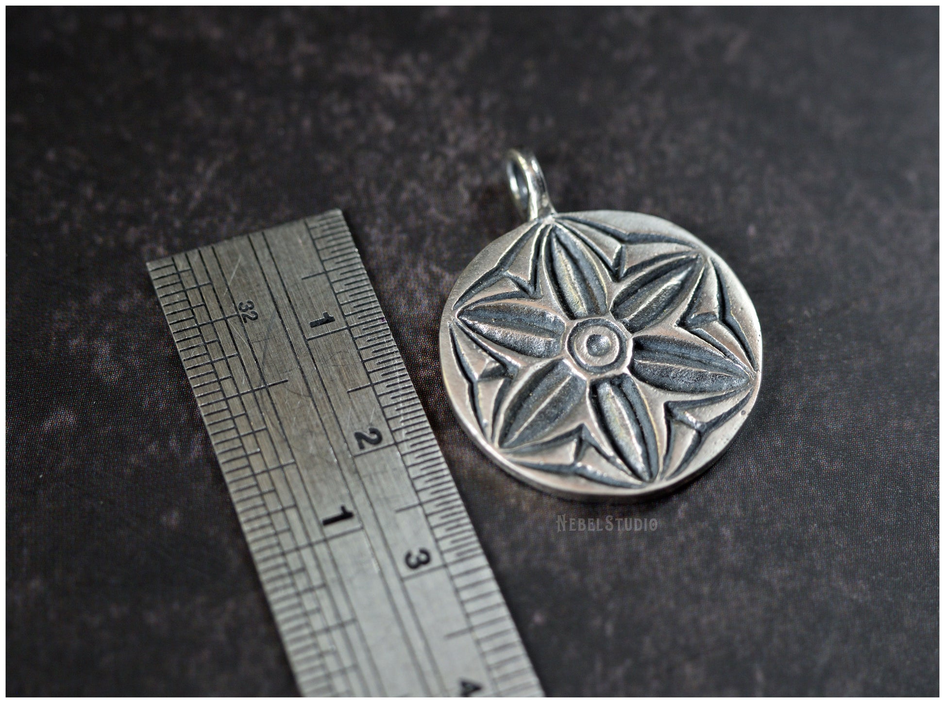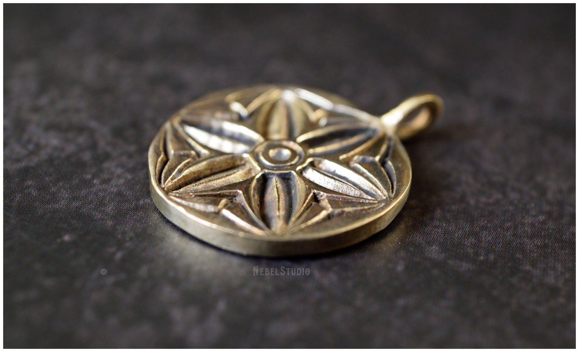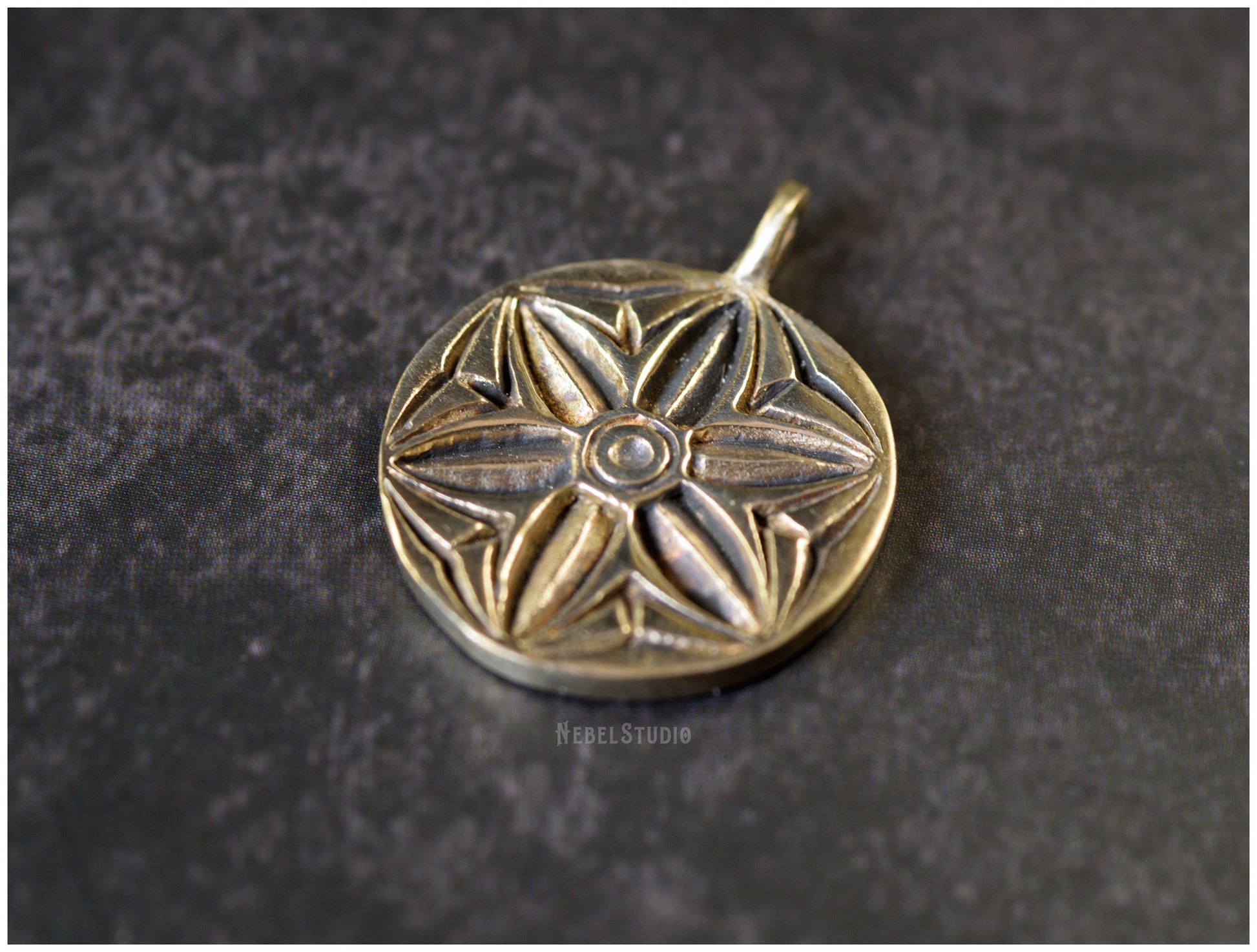 Colgante de plata de ley 925 o bronce con motivo grabado de roseta hexapétala, flor de seis pétalos, también conocida como "marca de bruja" o "daisy wheel" en inglés.