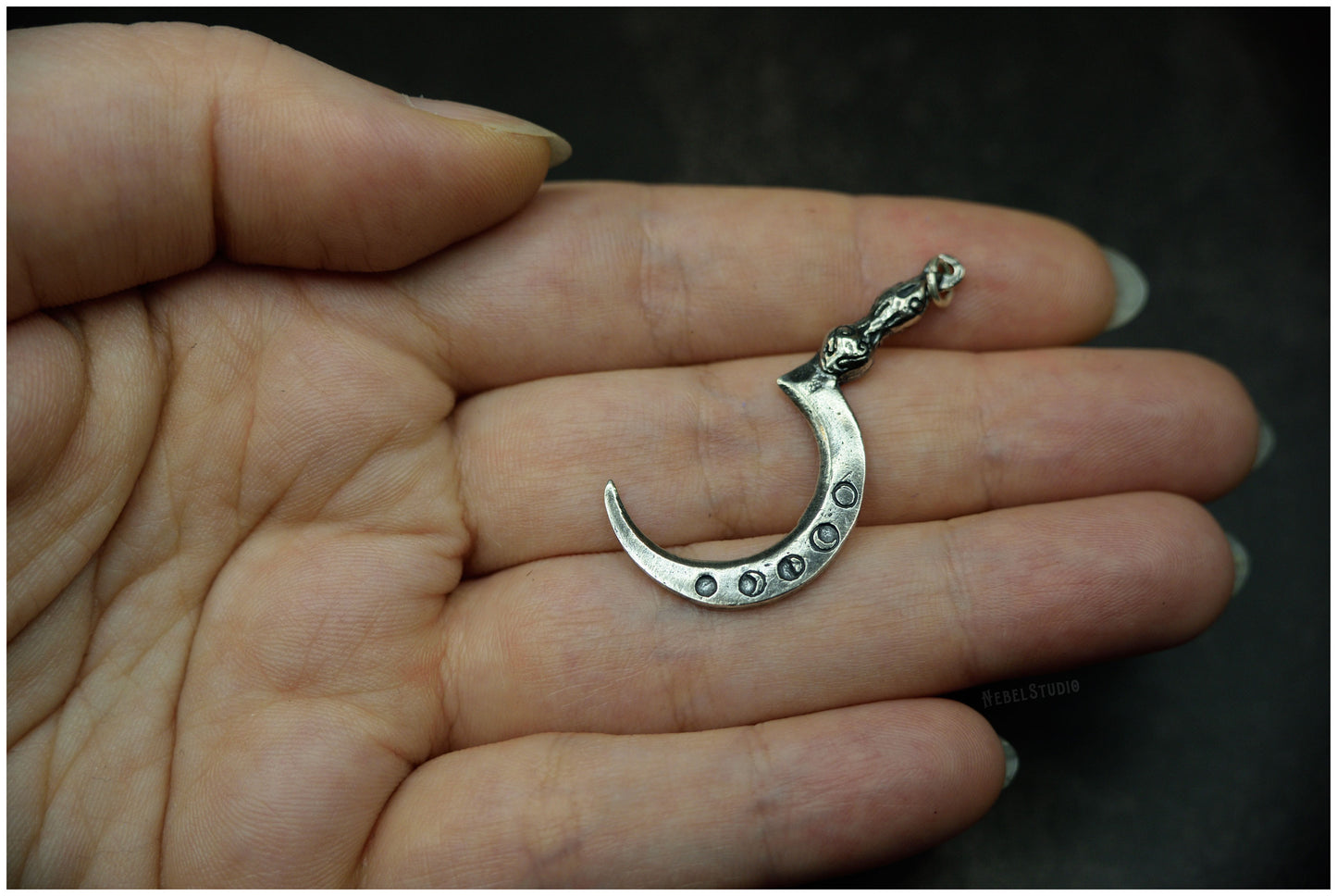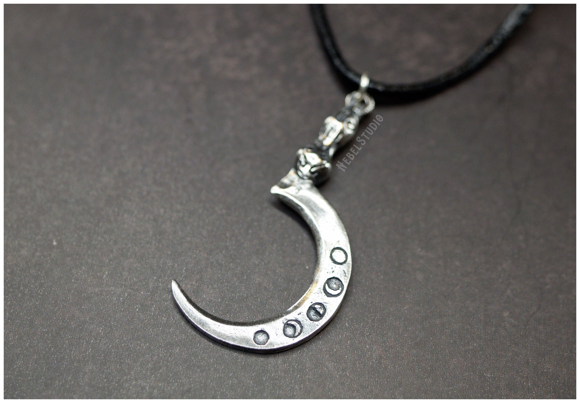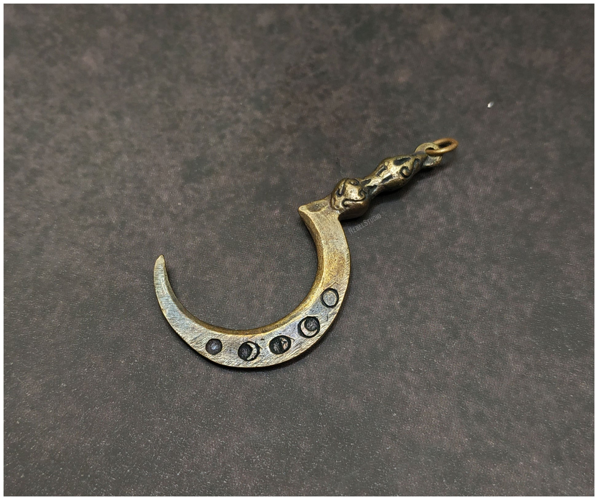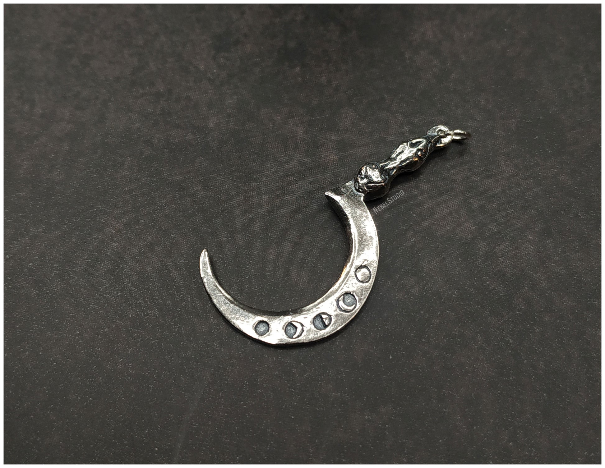 Colgante de plata de ley 925 o bronce en forma de hoz. Mide 4,5cm aprox. de largo y representa un boline con el mango trabajado y las fases de la luna grabadas en la hoja (por ambos lados). El acabado es brillante con pátina para realzar los detalles.