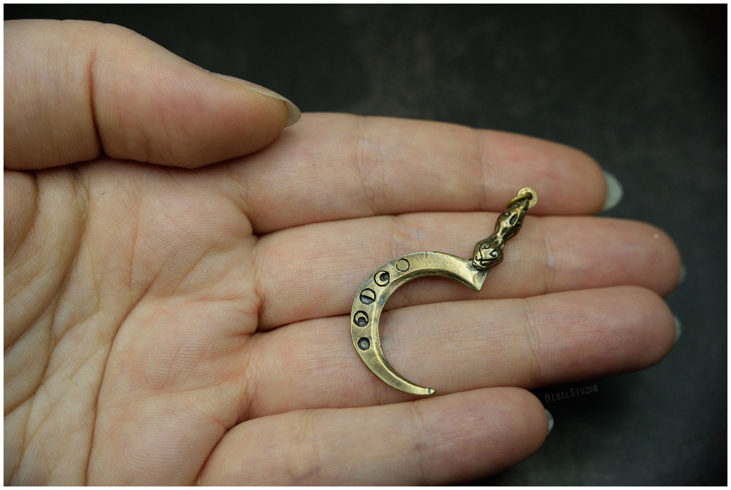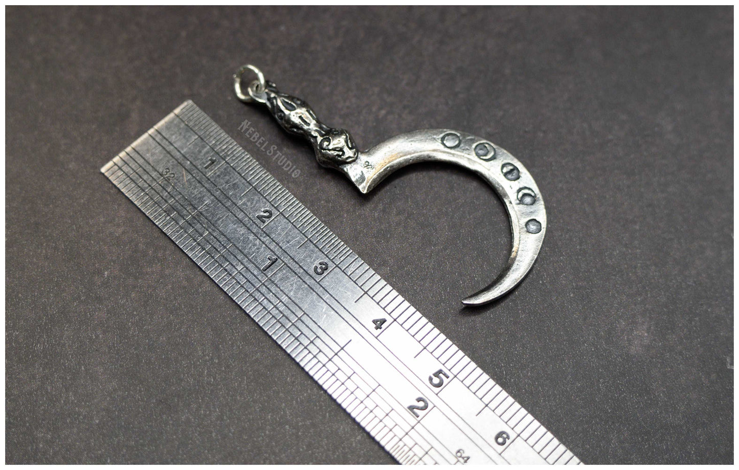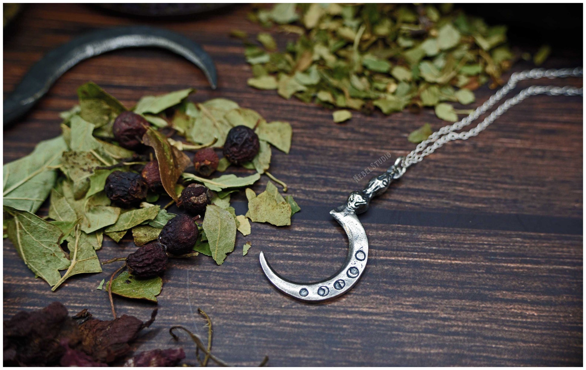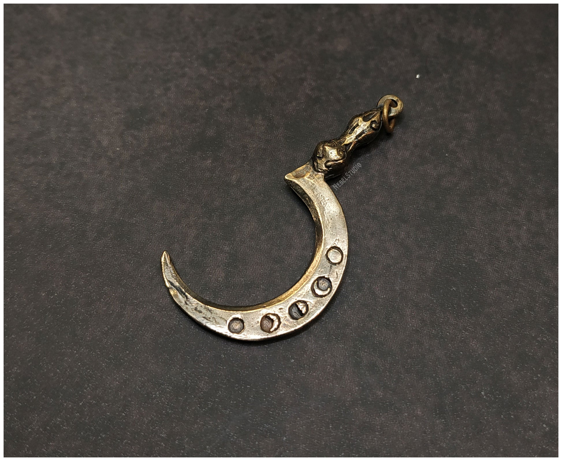 Colgante de plata de ley 925 o bronce en forma de hoz. Mide 4,5cm aprox. de largo y representa un boline con el mango trabajado y las fases de la luna grabadas en la hoja (por ambos lados). El acabado es brillante con pátina para realzar los detalles.