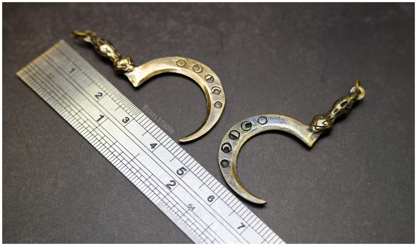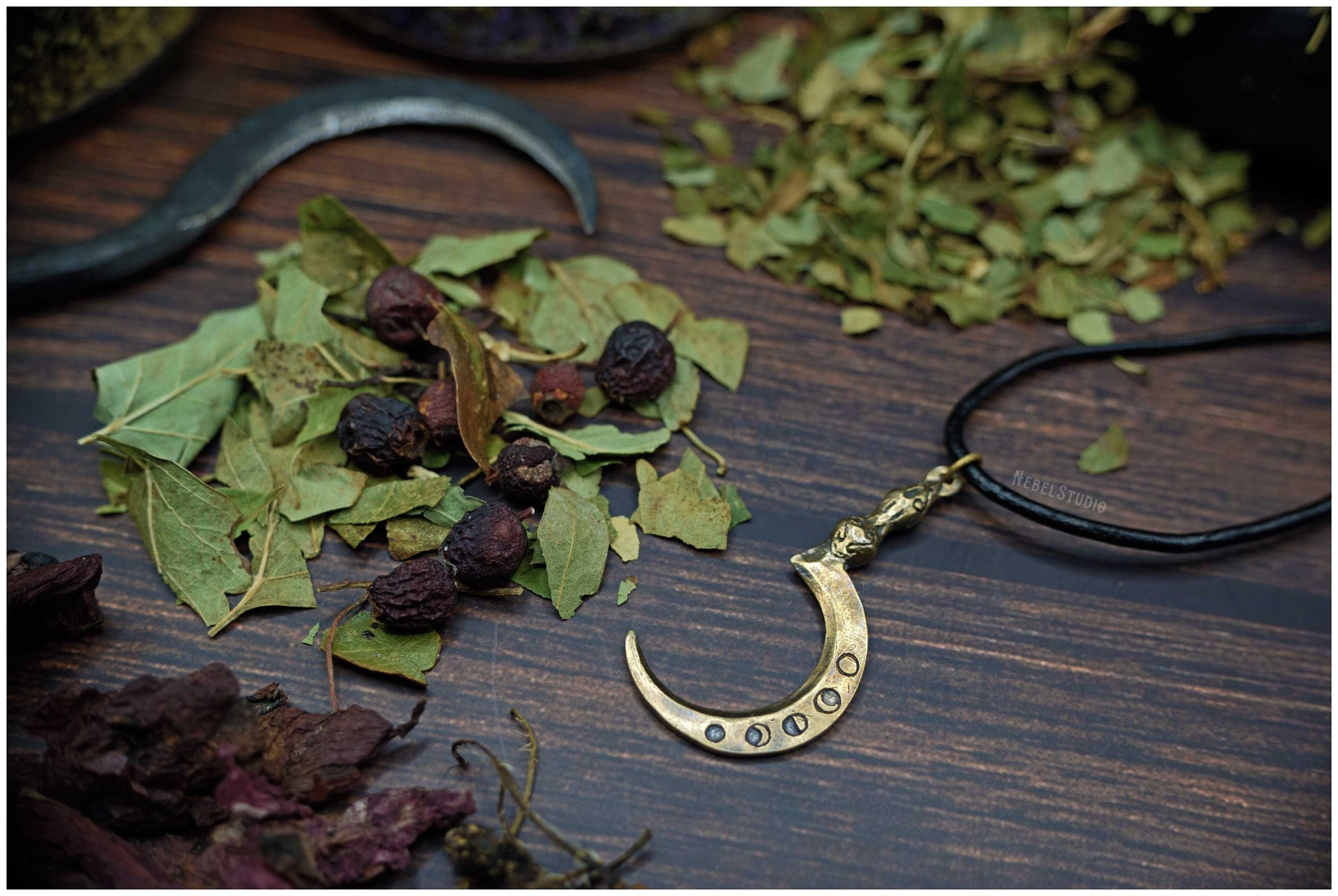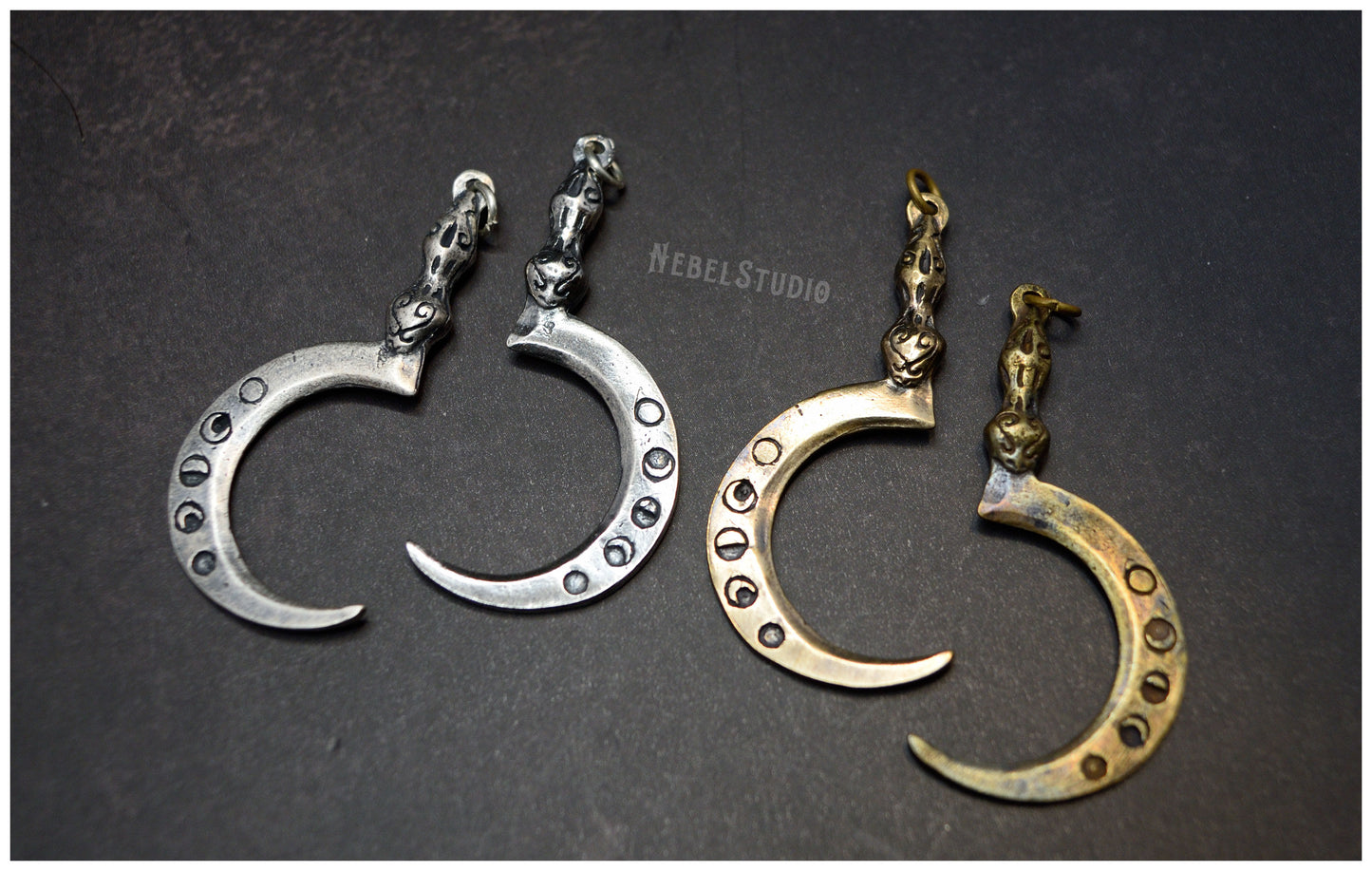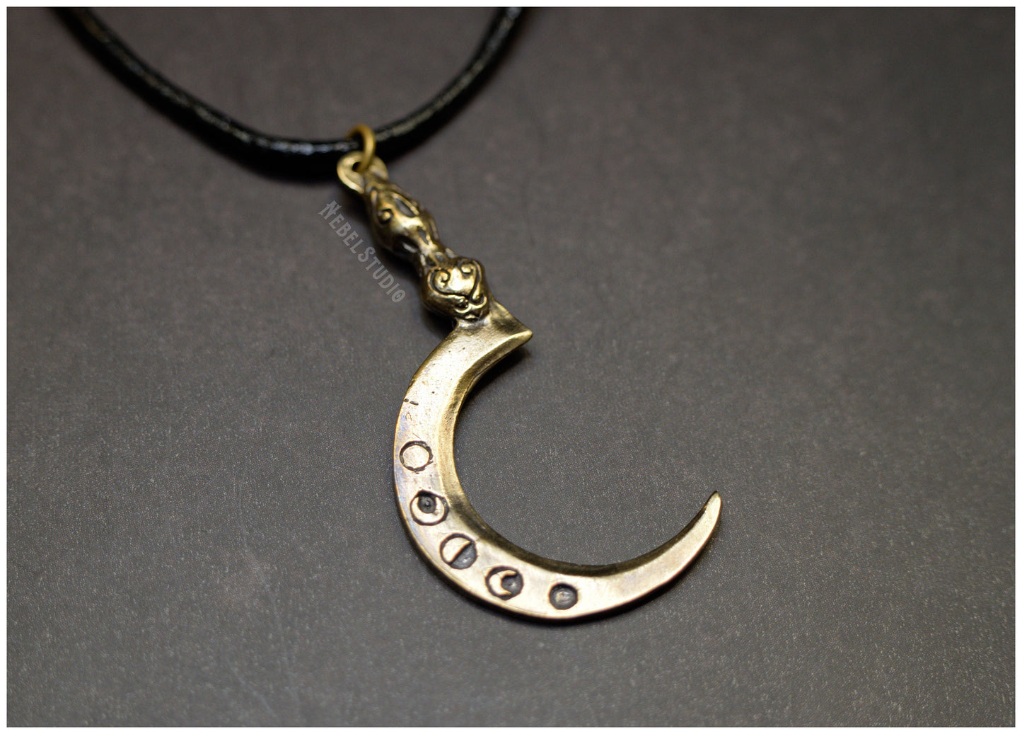 Colgante de plata de ley 925 o bronce en forma de hoz. Mide 4,5cm aprox. de largo y representa un boline con el mango trabajado y las fases de la luna grabadas en la hoja (por ambos lados). El acabado es brillante con pátina para realzar los detalles.