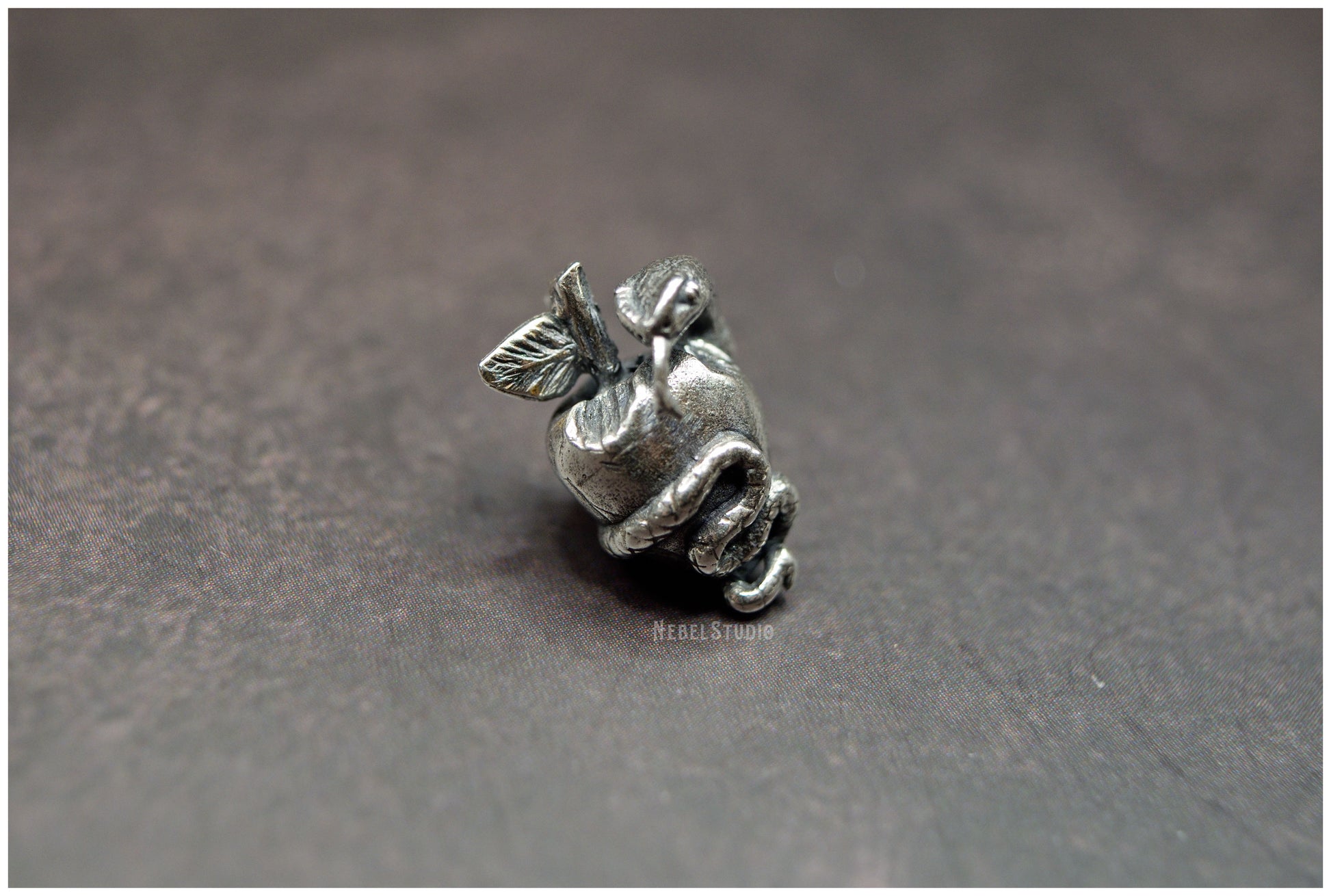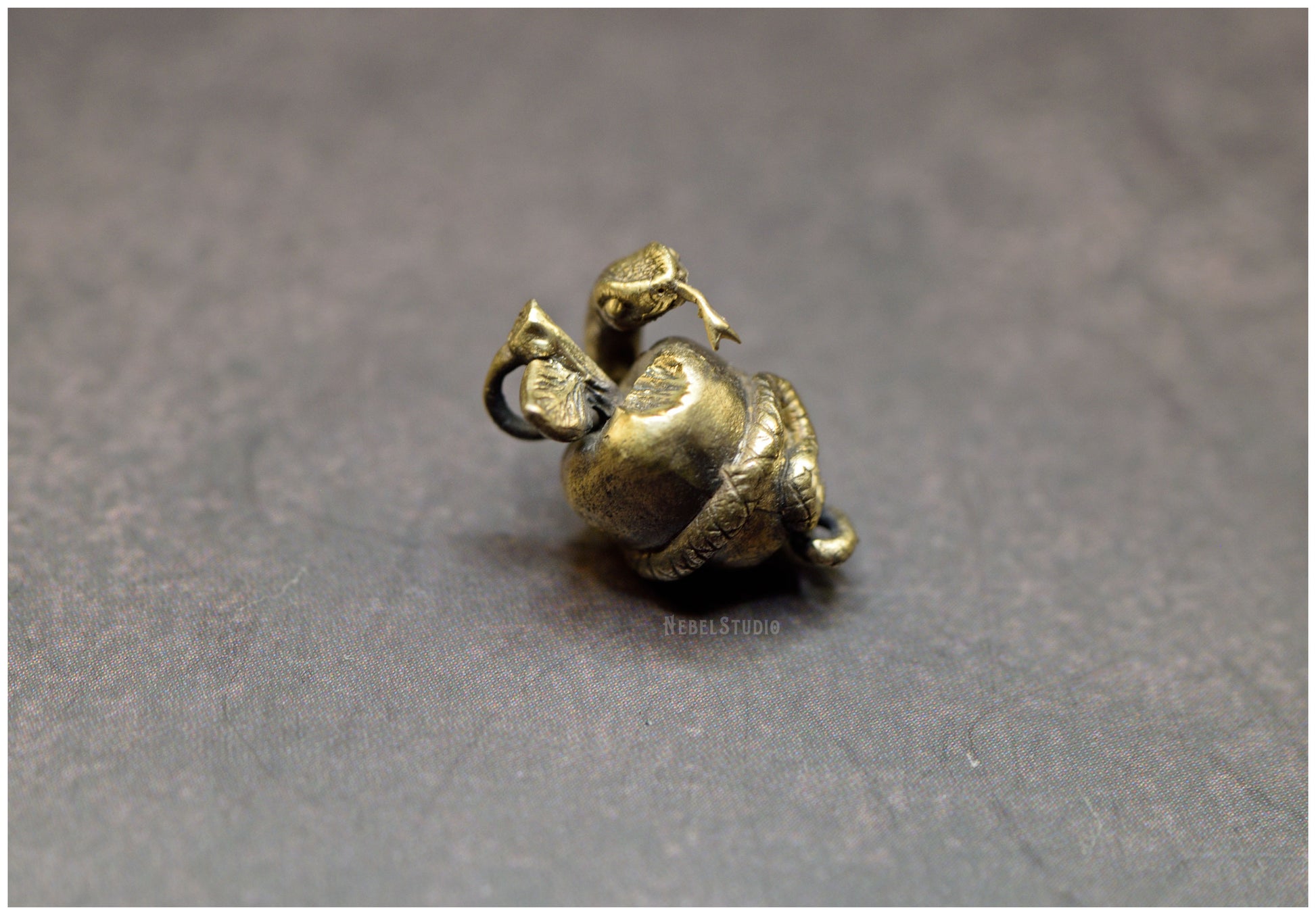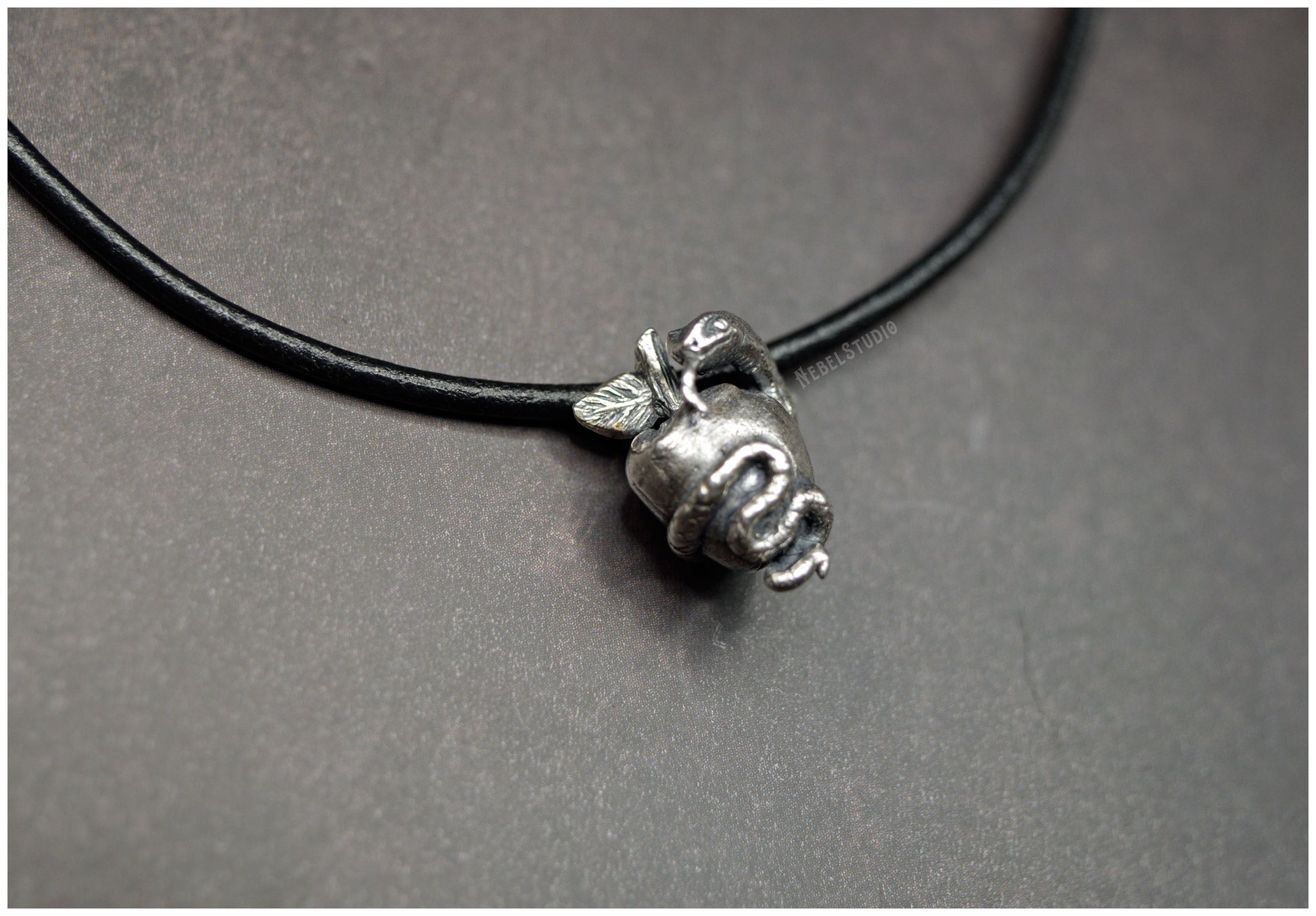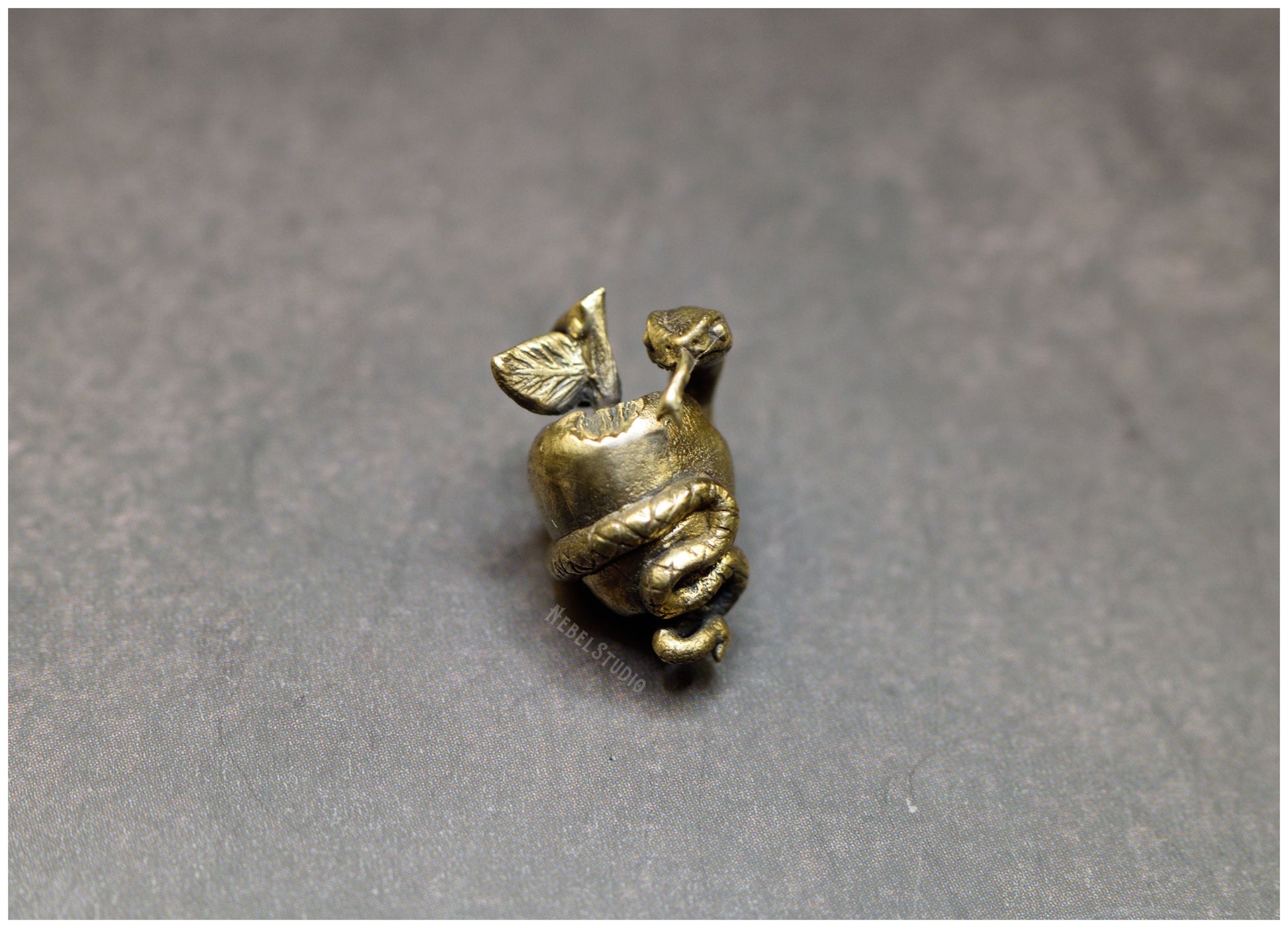 Colgante de bronce o plata 925, macizo, en forma de manzana con una sonriente serpiente enroscada en ella. Se puede adquirir solo o con cordón de cuero negro o caucho de 50cm de largo con cierre de plata. Para la versión en plata también disponible con cadena. El precio varía según la opción. Se hace por encargo.