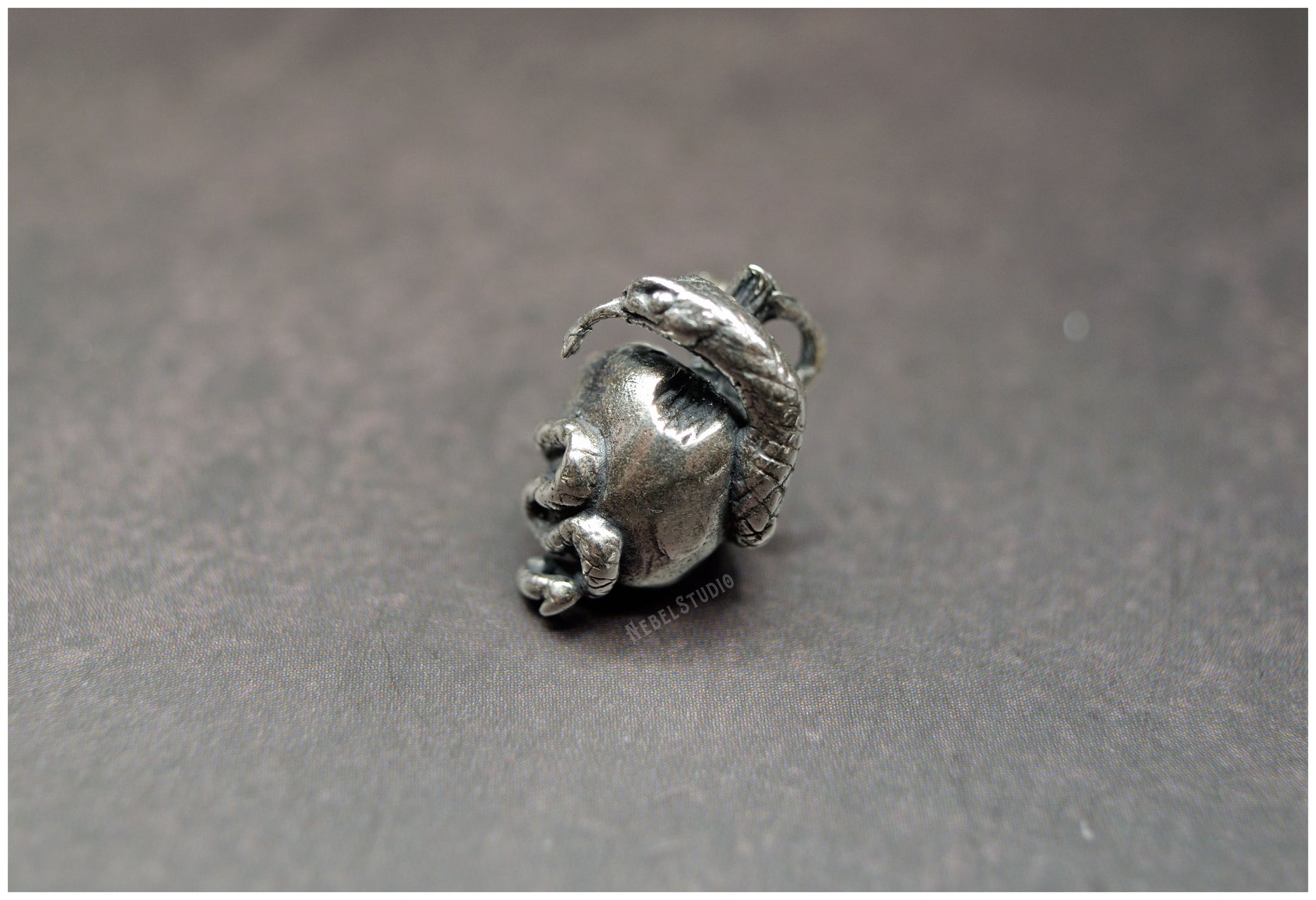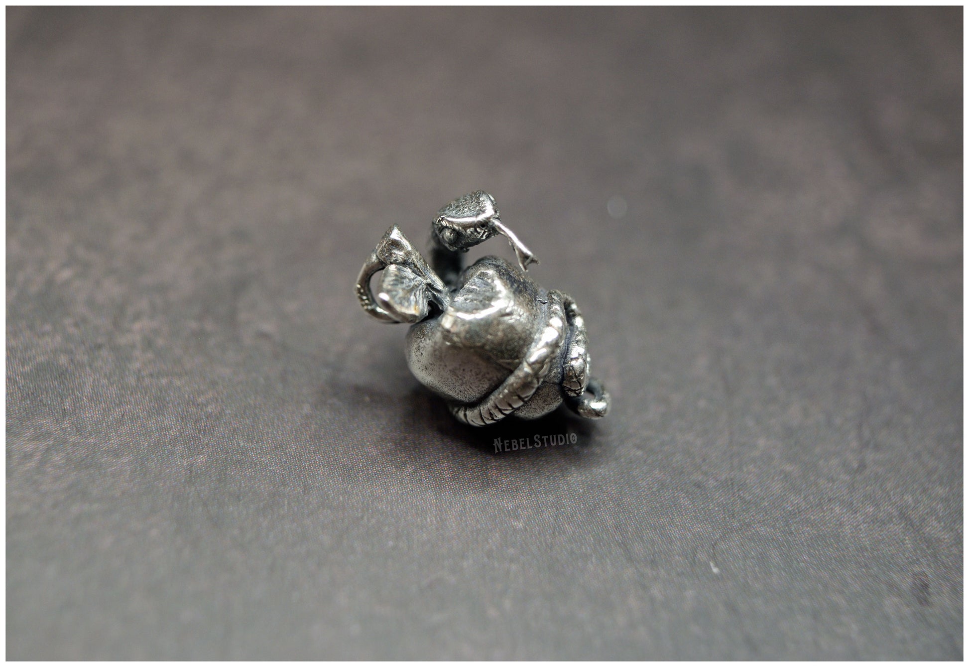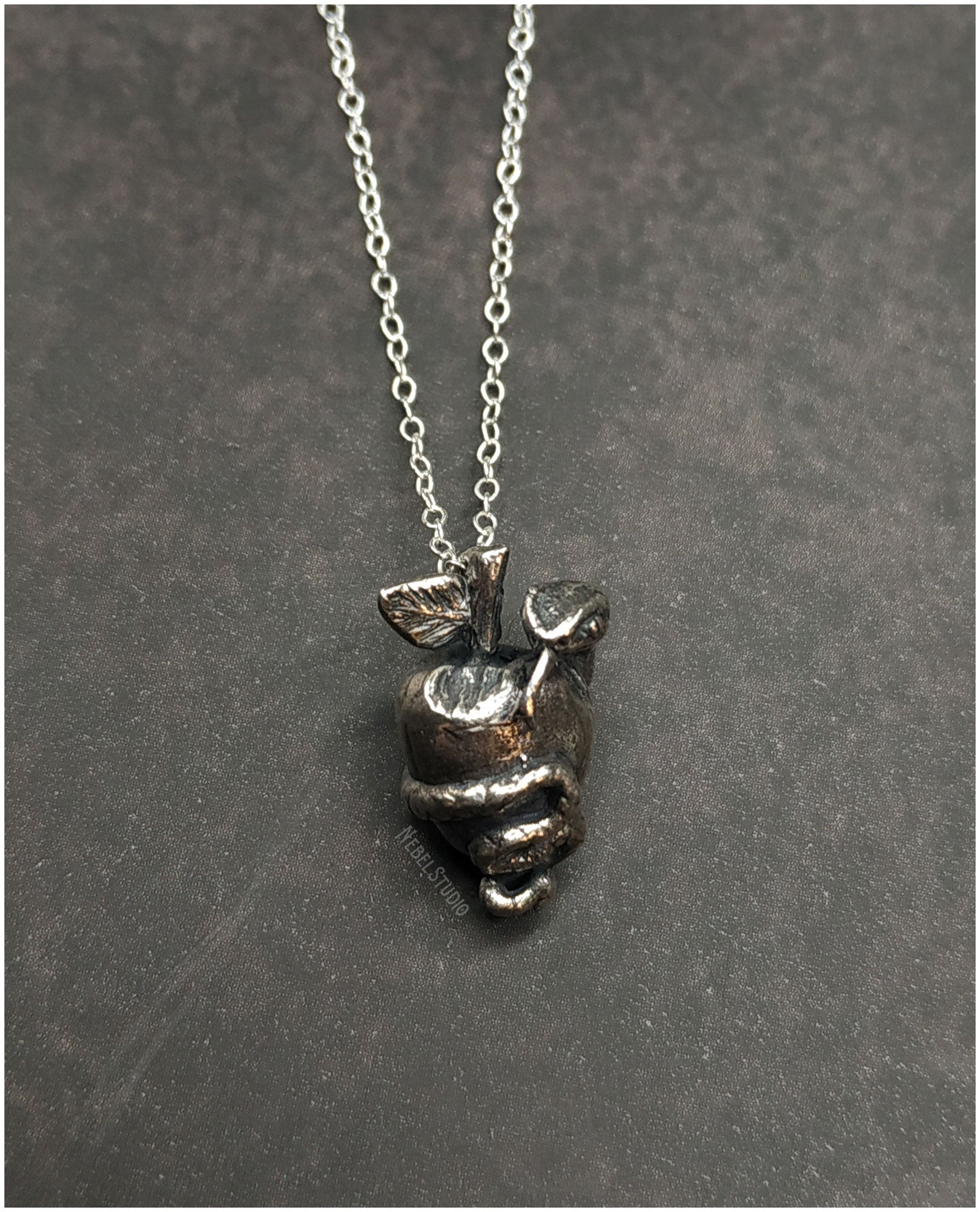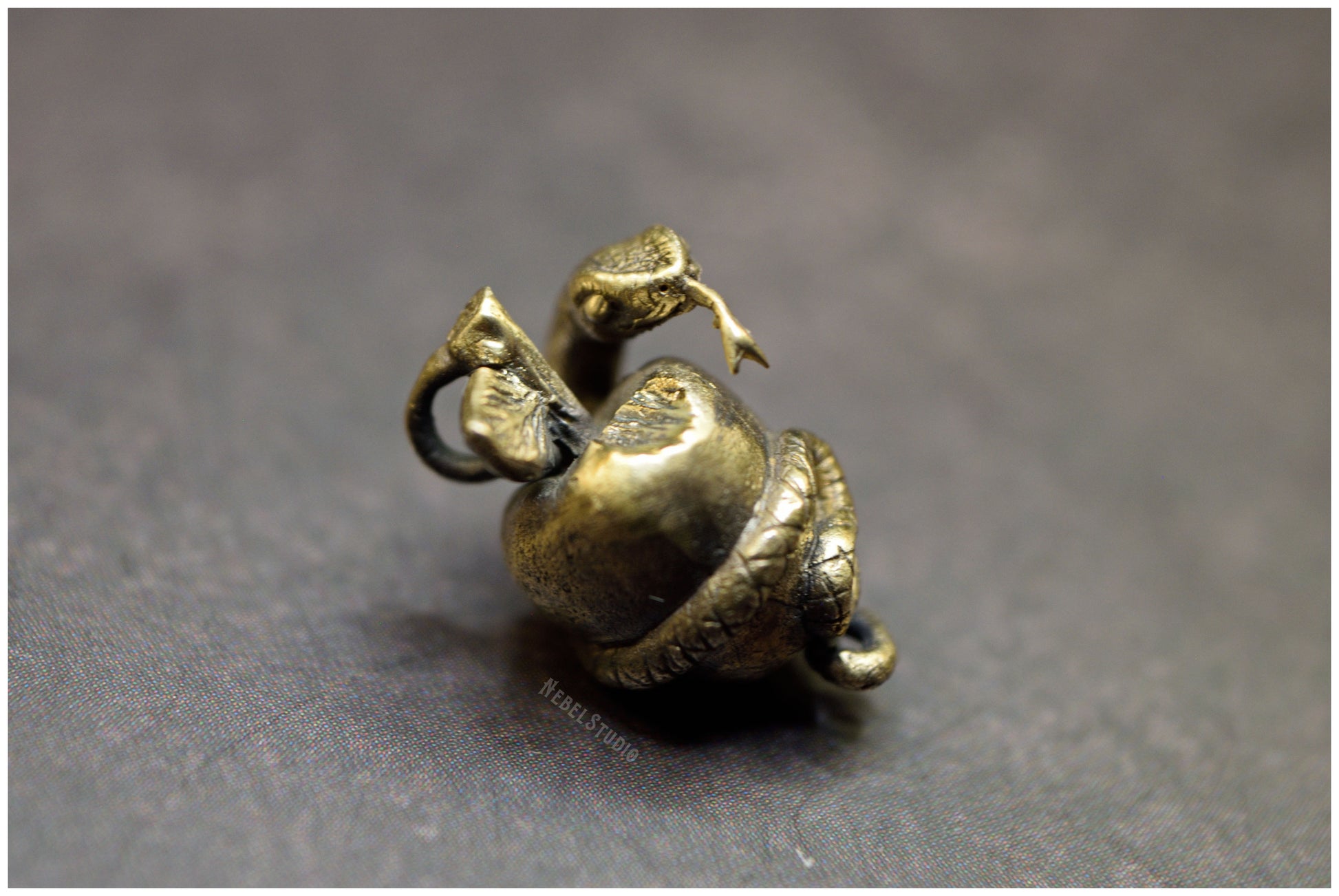 Colgante de bronce o plata 925, macizo, en forma de manzana con una sonriente serpiente enroscada en ella. Se puede adquirir solo o con cordón de cuero negro o caucho de 50cm de largo con cierre de plata. Para la versión en plata también disponible con cadena. El precio varía según la opción. Se hace por encargo.