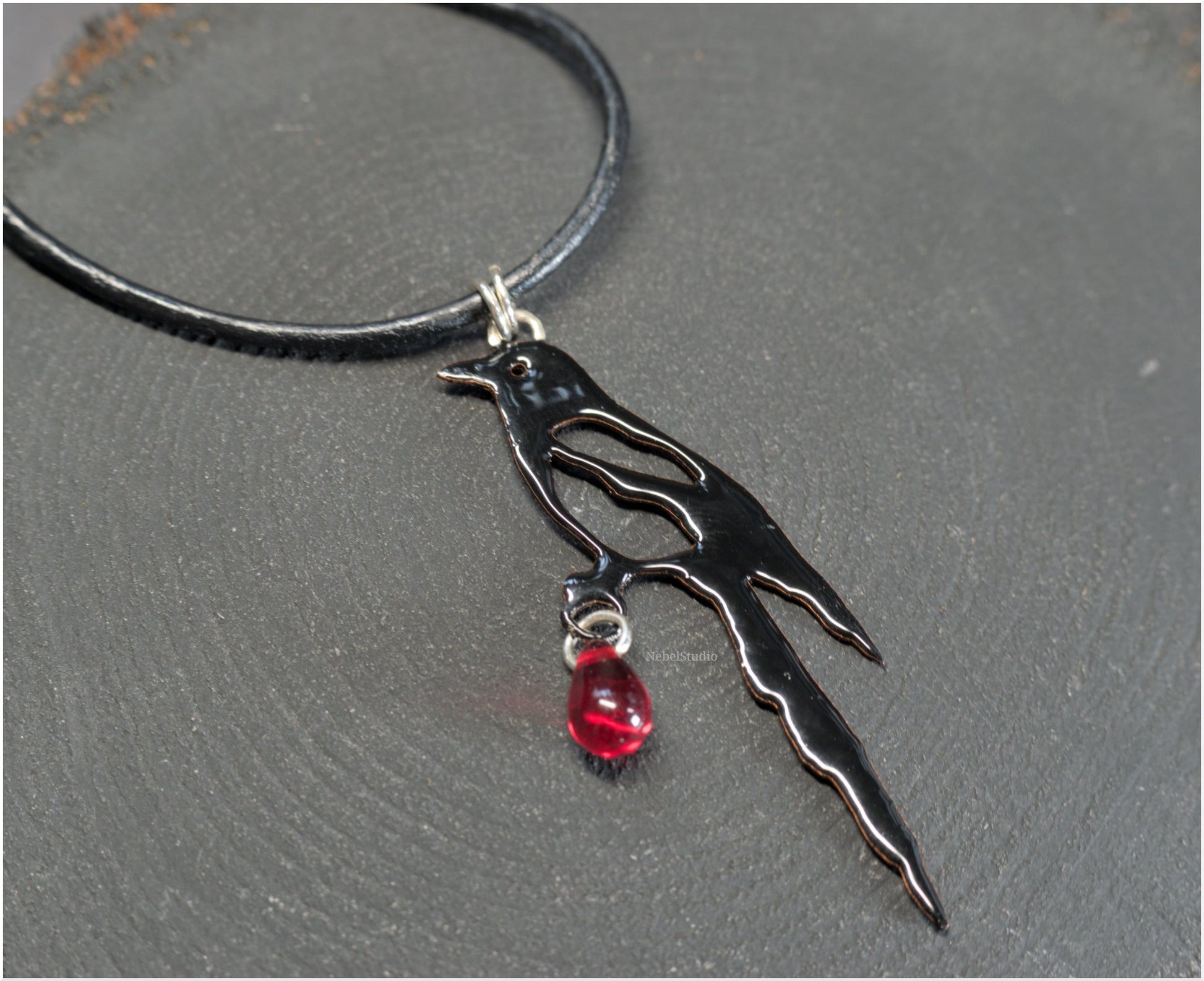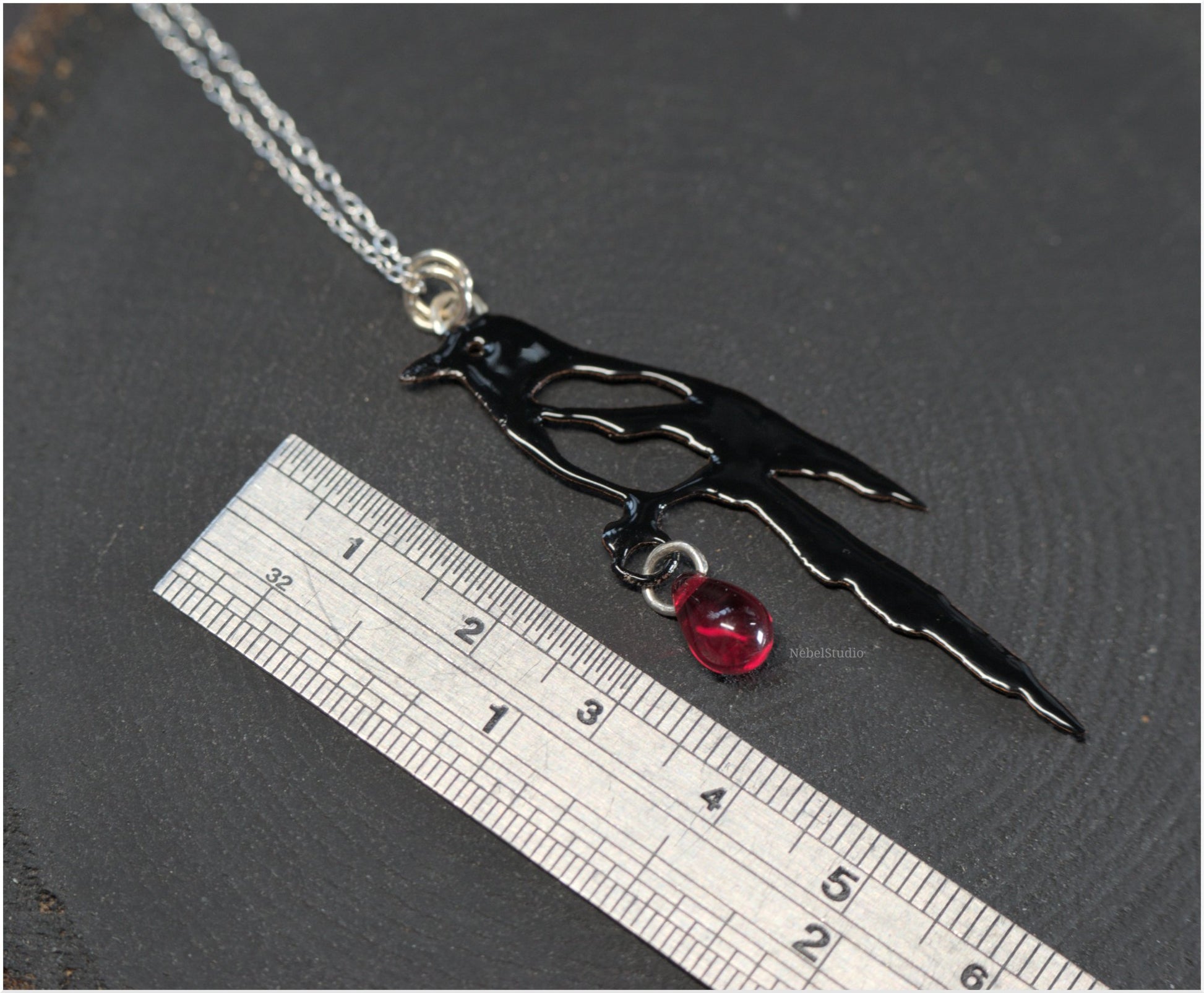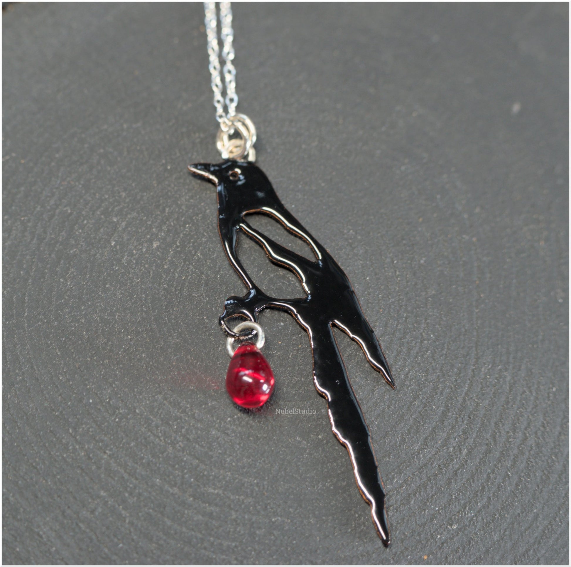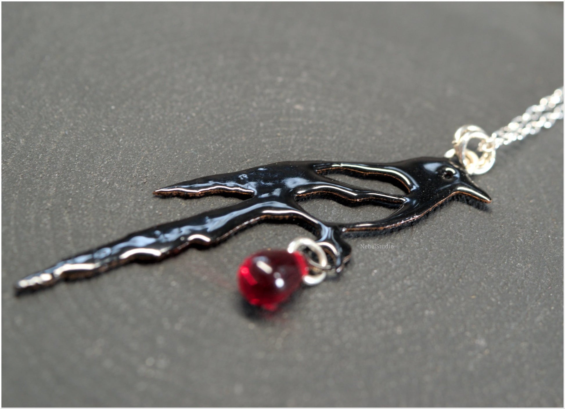 Colgante y pendientes a juego, en metal esmaltado en negro por ambas caras, en forma de silueta de urraca. El ave está posada, de perfil y las partes blancas del plumaje están caladas con sierra, de forma que quedan huecas en la silueta. De las patas cuelga una lágrima de cristal checo de color rojo oscuro.