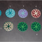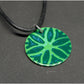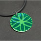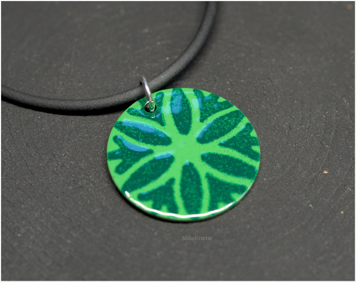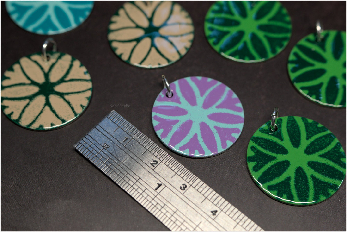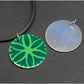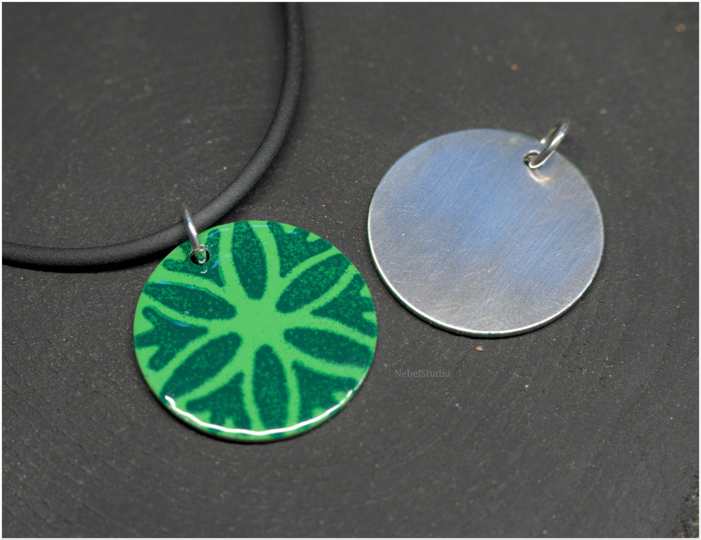 Cada colgante mide 2,5 cm de diámetro. Están disponibles solos, con cordón de caucho o cuero de 50cm, negro, con cierres de plata.