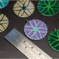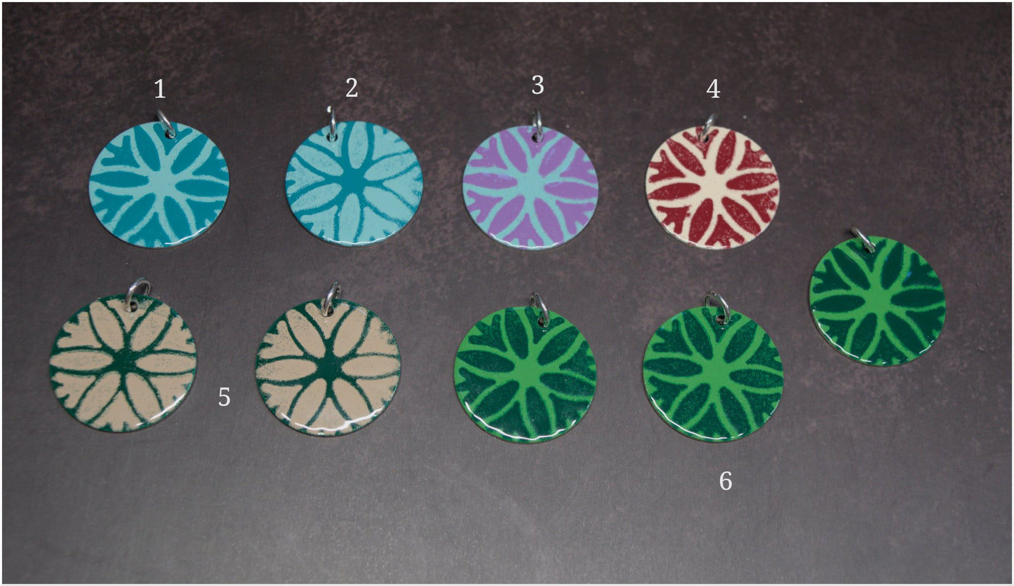Piezas de acero, estilo medalla. Están esmaltadas en distintos colores con motivos que se inspiran en hexapétalas, también conocidas como Flor de Agua.