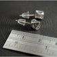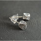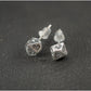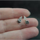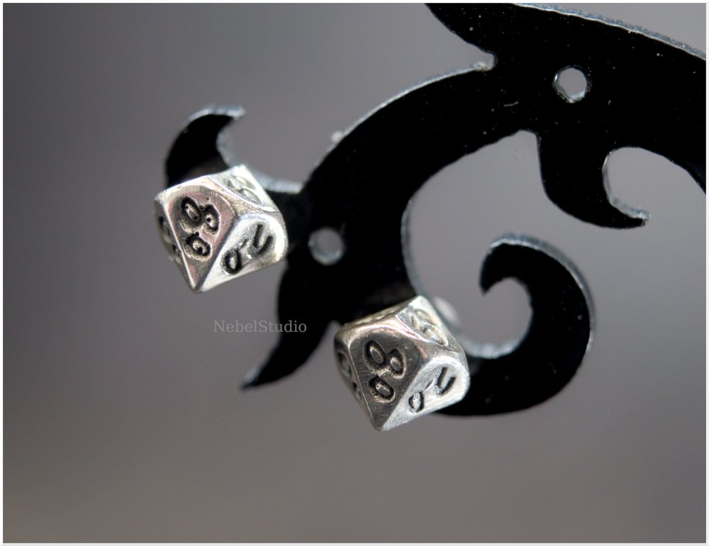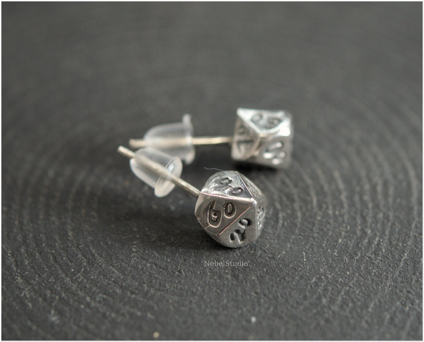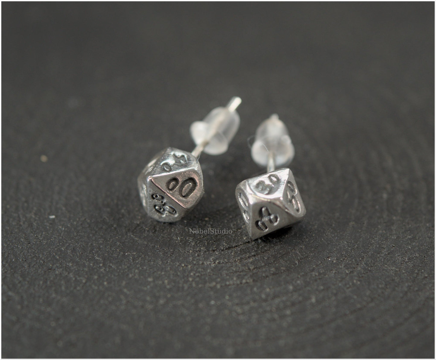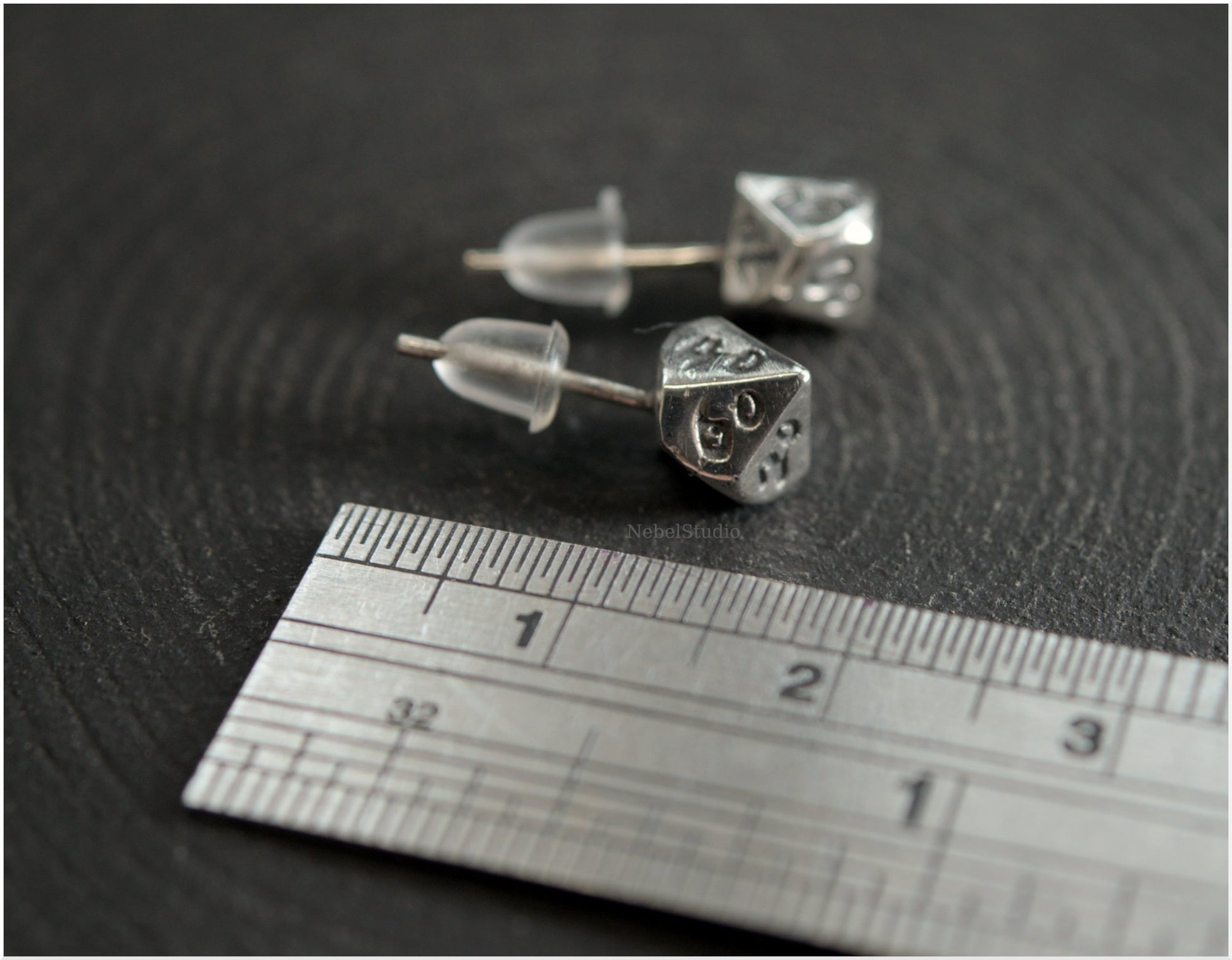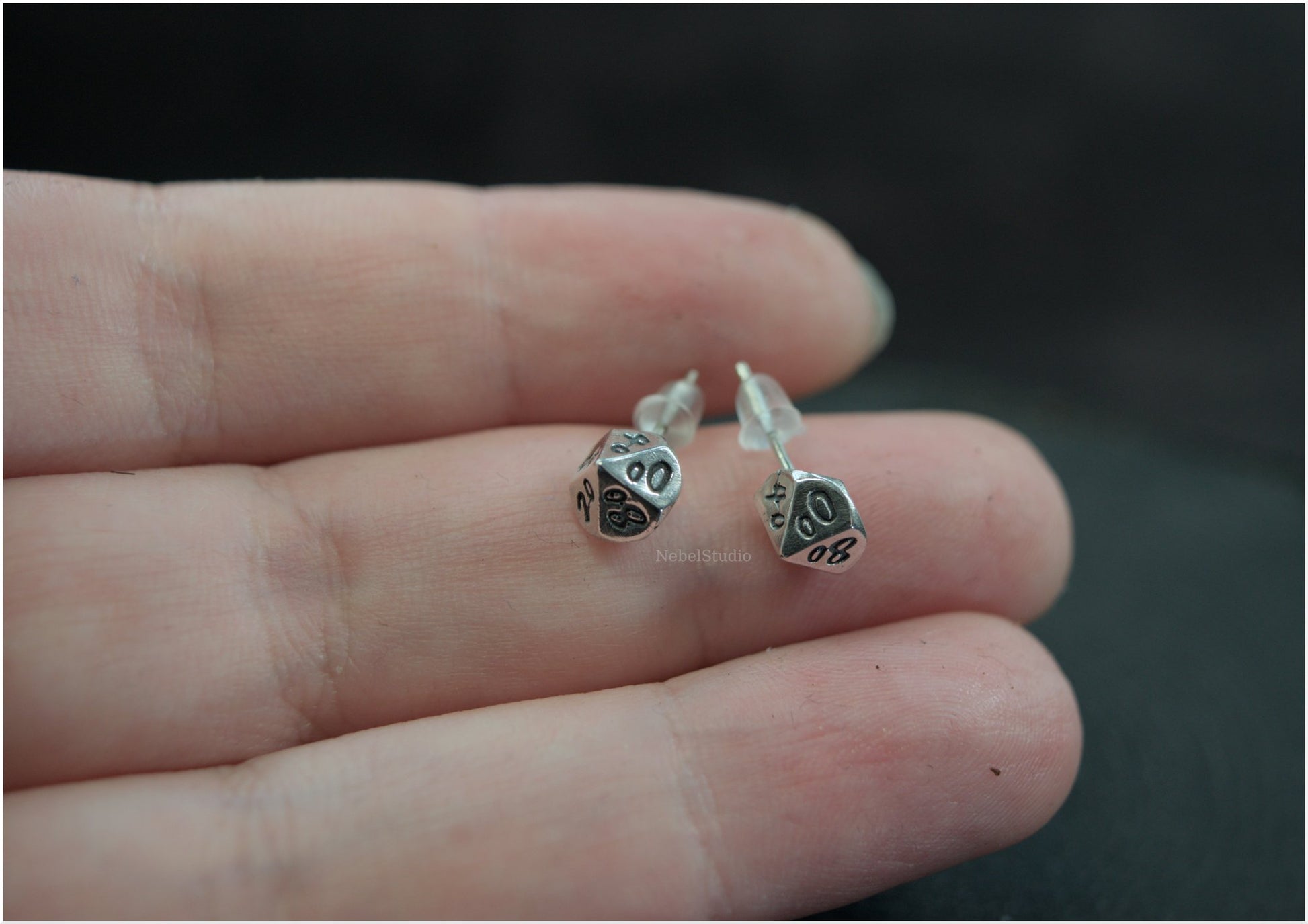 Pendientes de plata en forma de dado de diez caras por decenas. Son de plata 925 maciza pero muy ligeros. Miden aproximandamente 1cm. Son de tipo perno, por lo que quedan pegados al lóbulo. El cierre es de silicona.