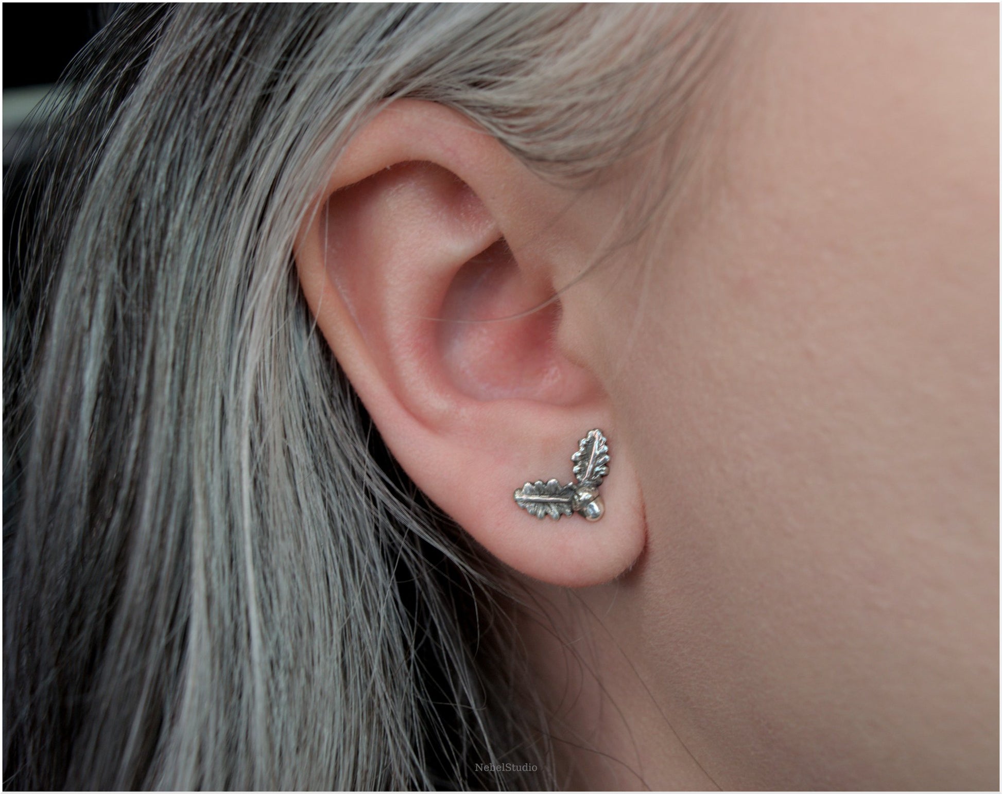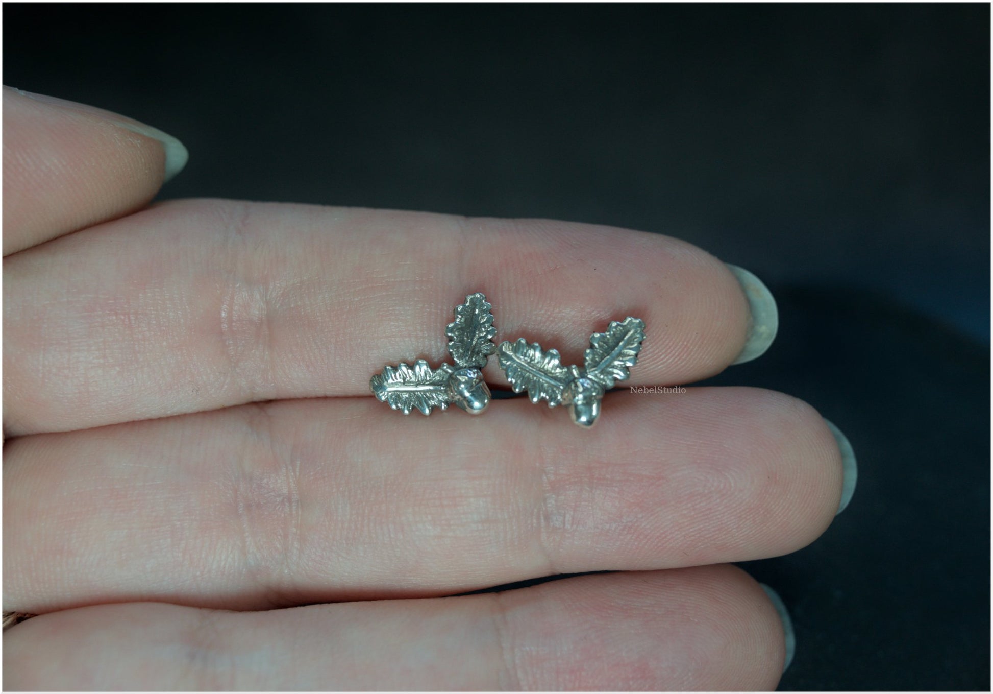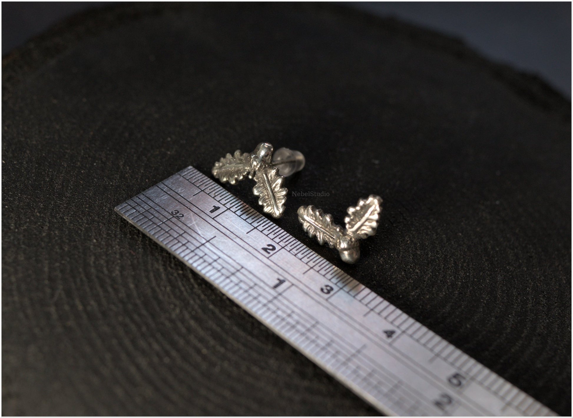 Pendientes de plata de ley 925, cuya forma representa dos hojas de roble que convergen en una pequeña bellota.