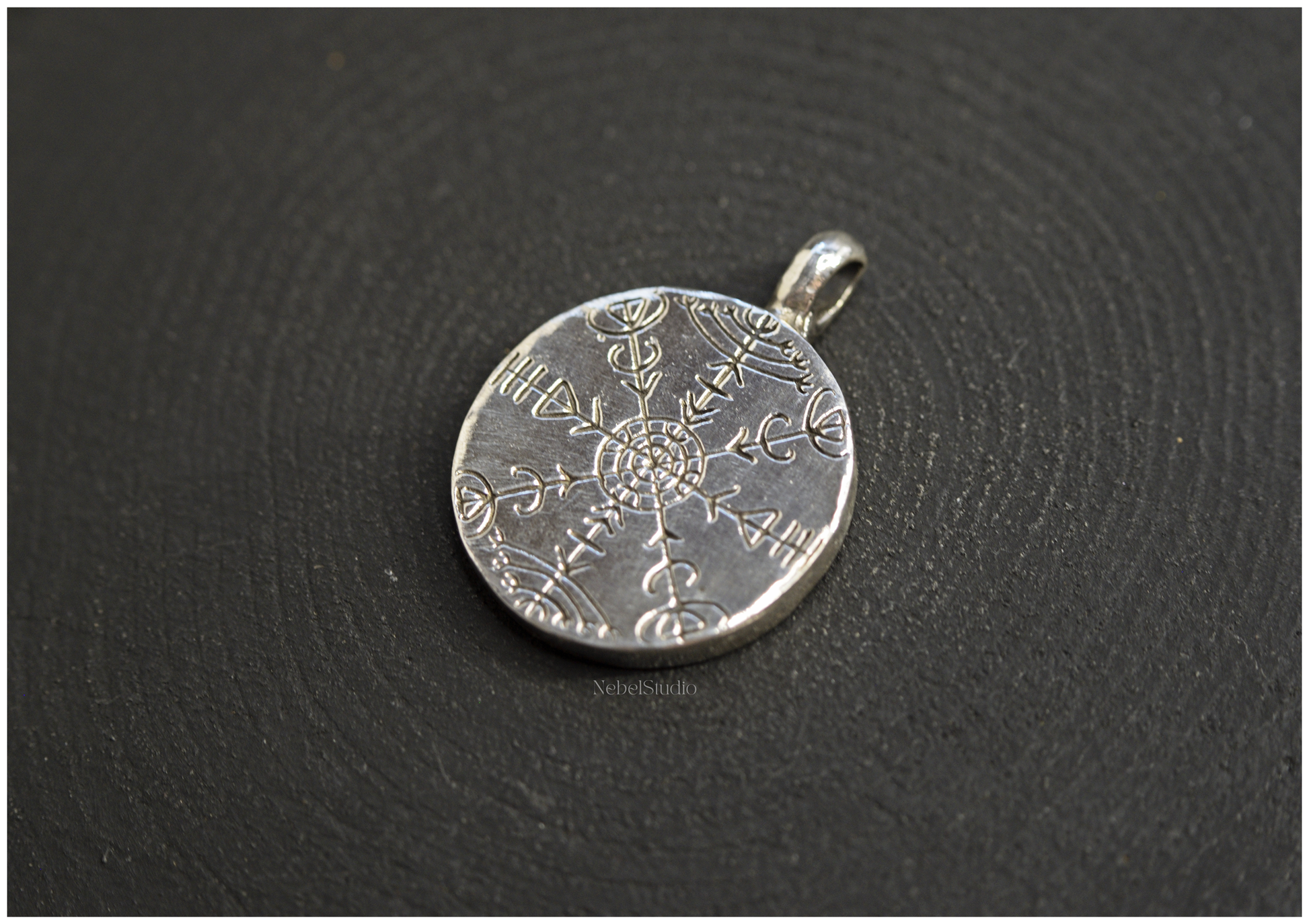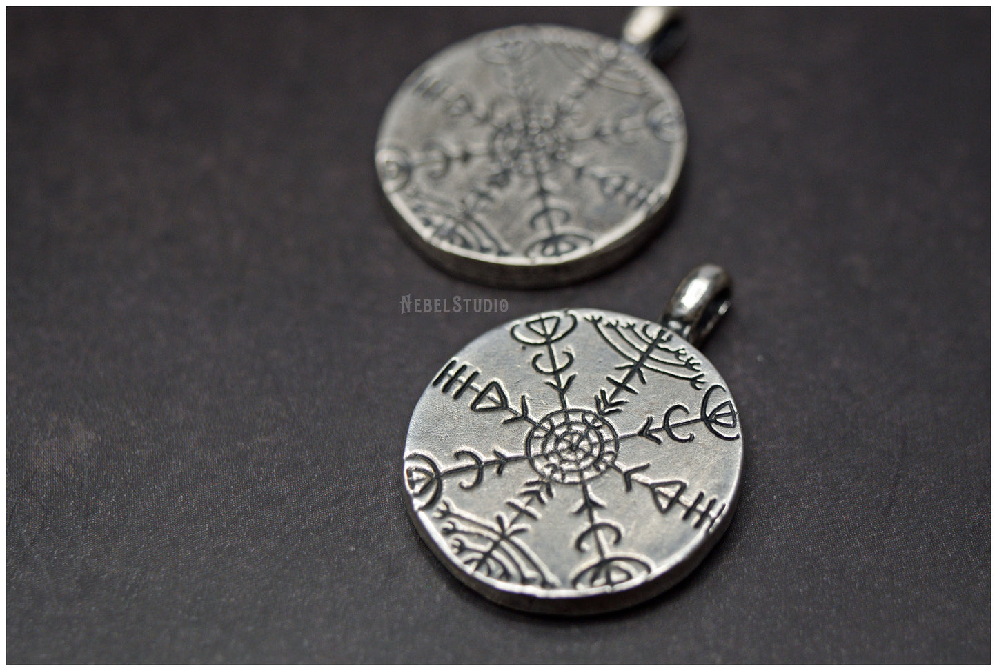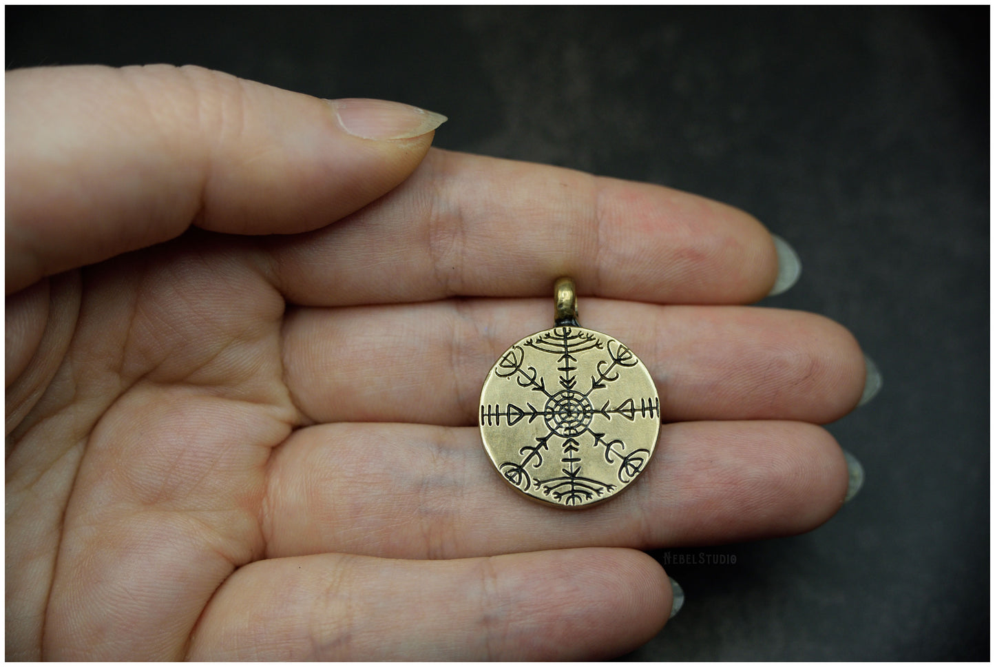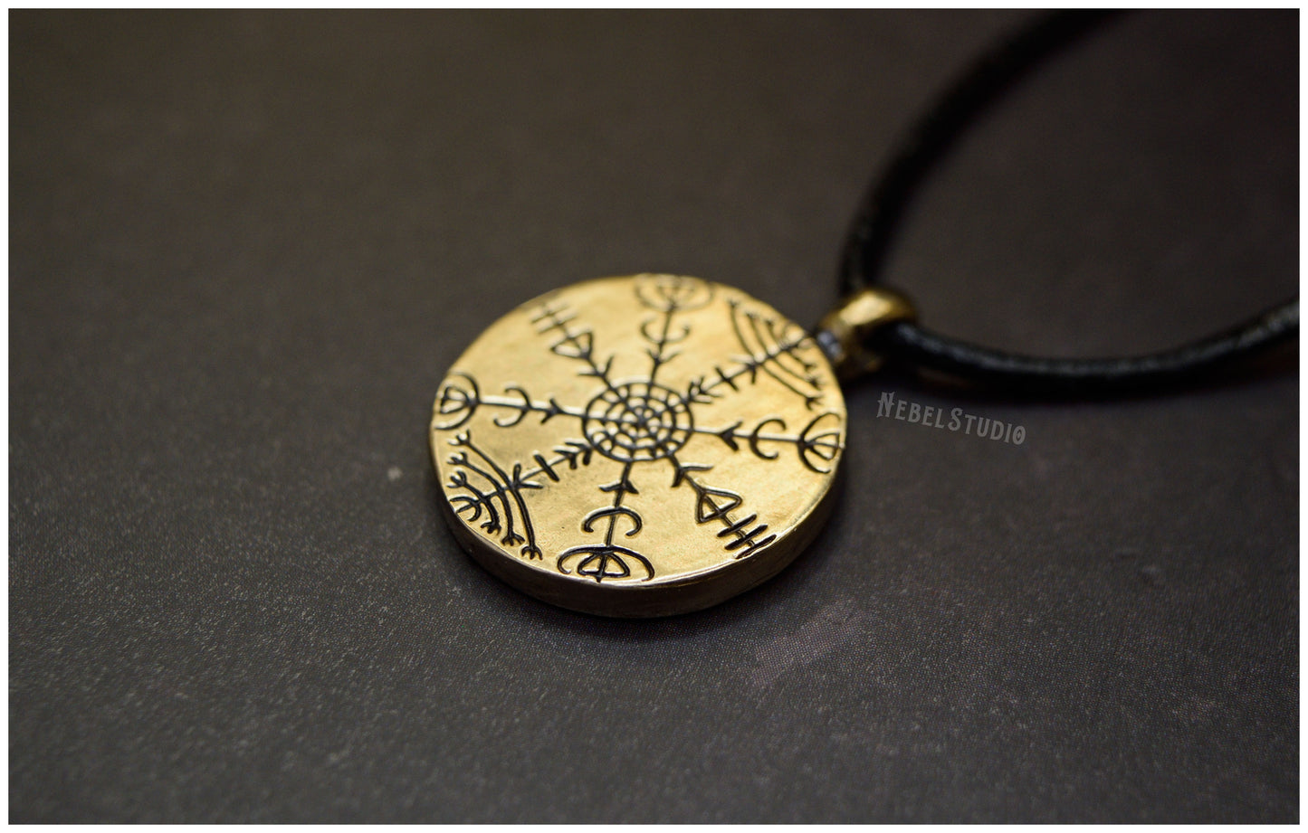 El símbolo que aparece en este colgante es un Veldismagn, es de origen islandés y su registro más antiguo que se conserva es en el Galdrabók (un grimorio islandés fechado alrededor del 1600) donde ser recogen distintos hechizos. Este es un hechizo de protección, no sólo para volver ilesos de los viajes por tierra o por mar, si no también contra enfermedades y magia negativa. Según la información del Museo de Hechicería y Brujería de Islandia, para activar su poder, había que grabarlo en lignito, colorearlo con sangre y llevarlo sobre el pecho. Pero el Veldismagn no es sólo un hechizo de protección, también es un hechizo de potenciación pues, literalmente, su nombre significa "el que aumenta el poder". El poder de quien lo porta.