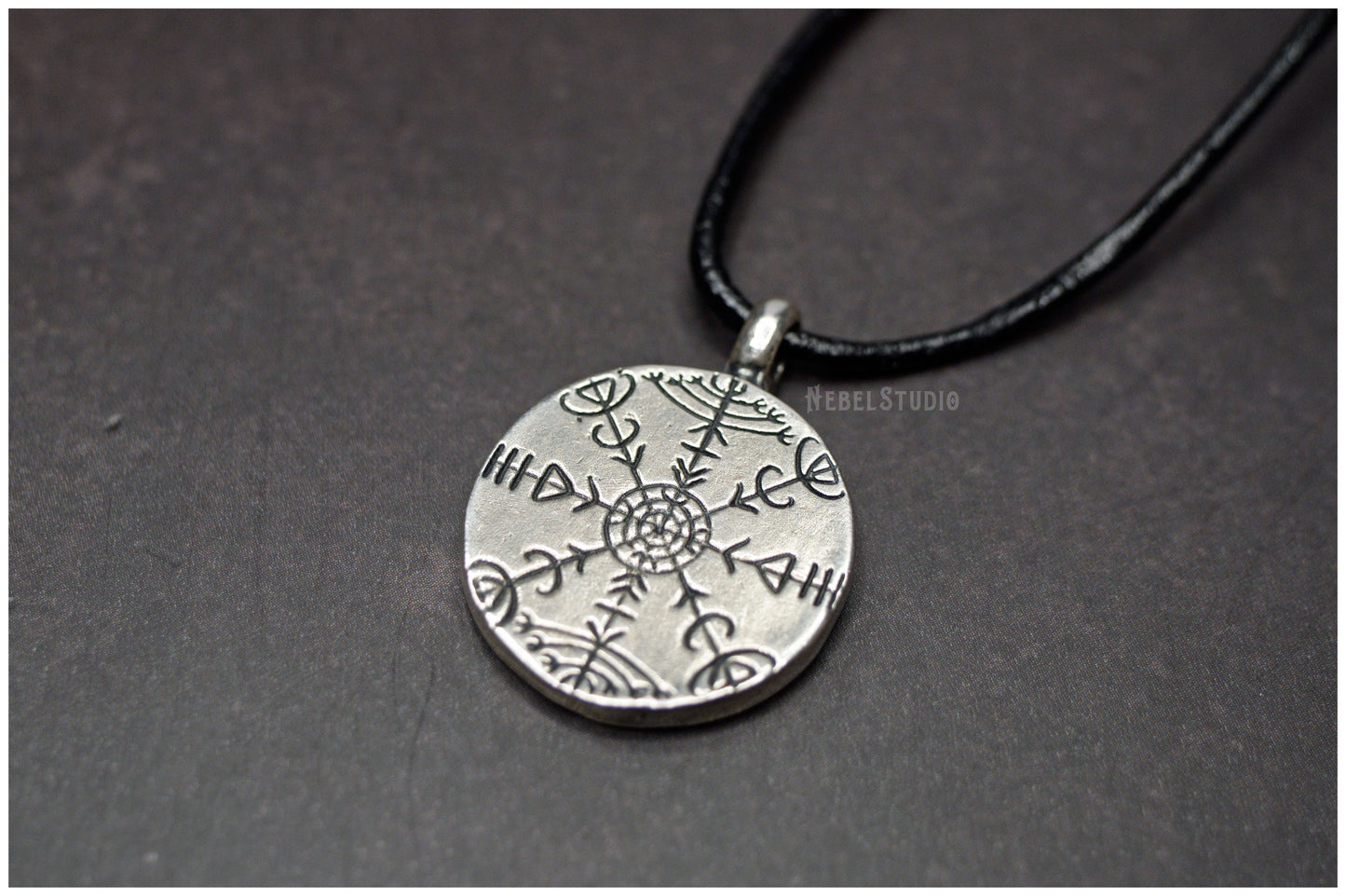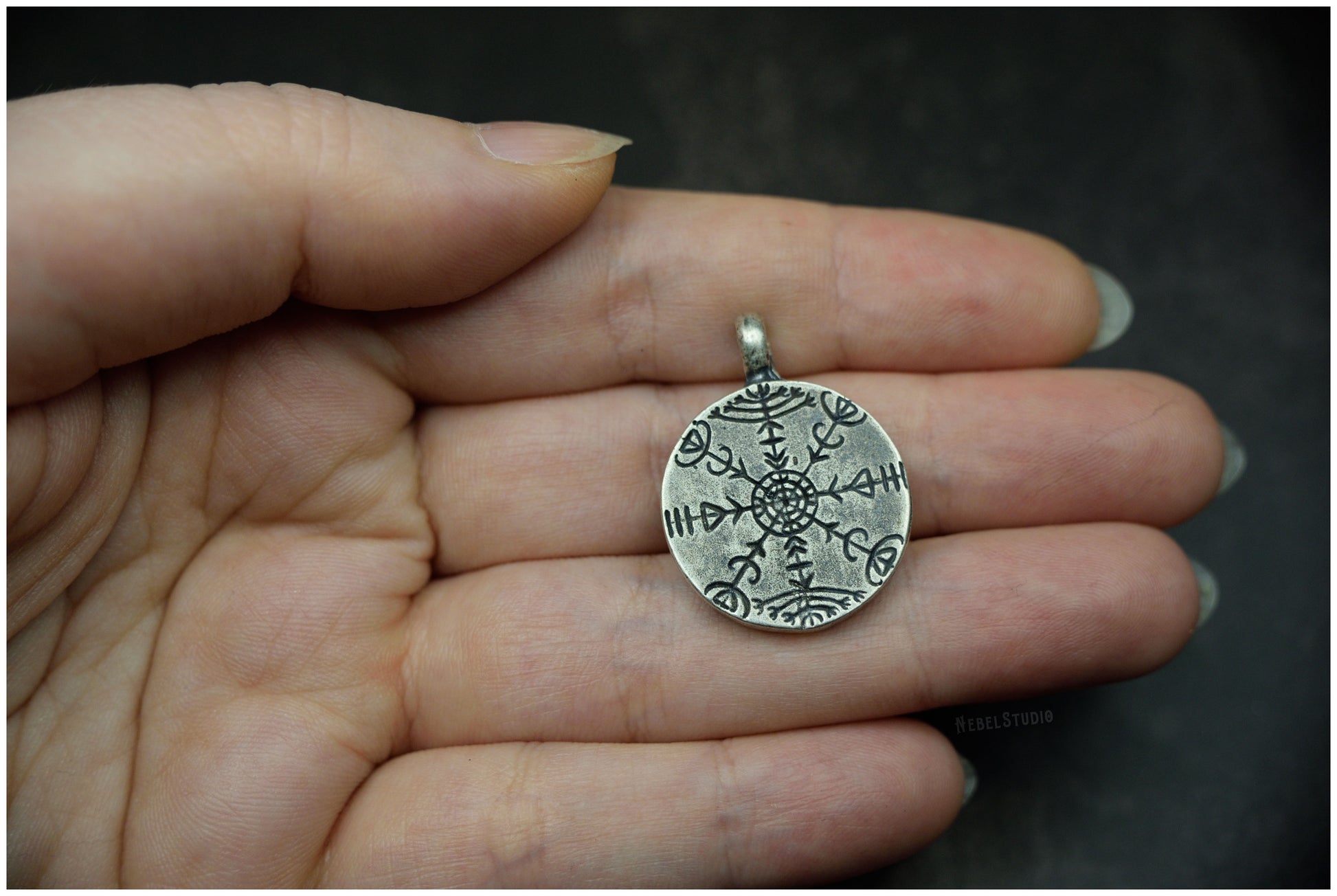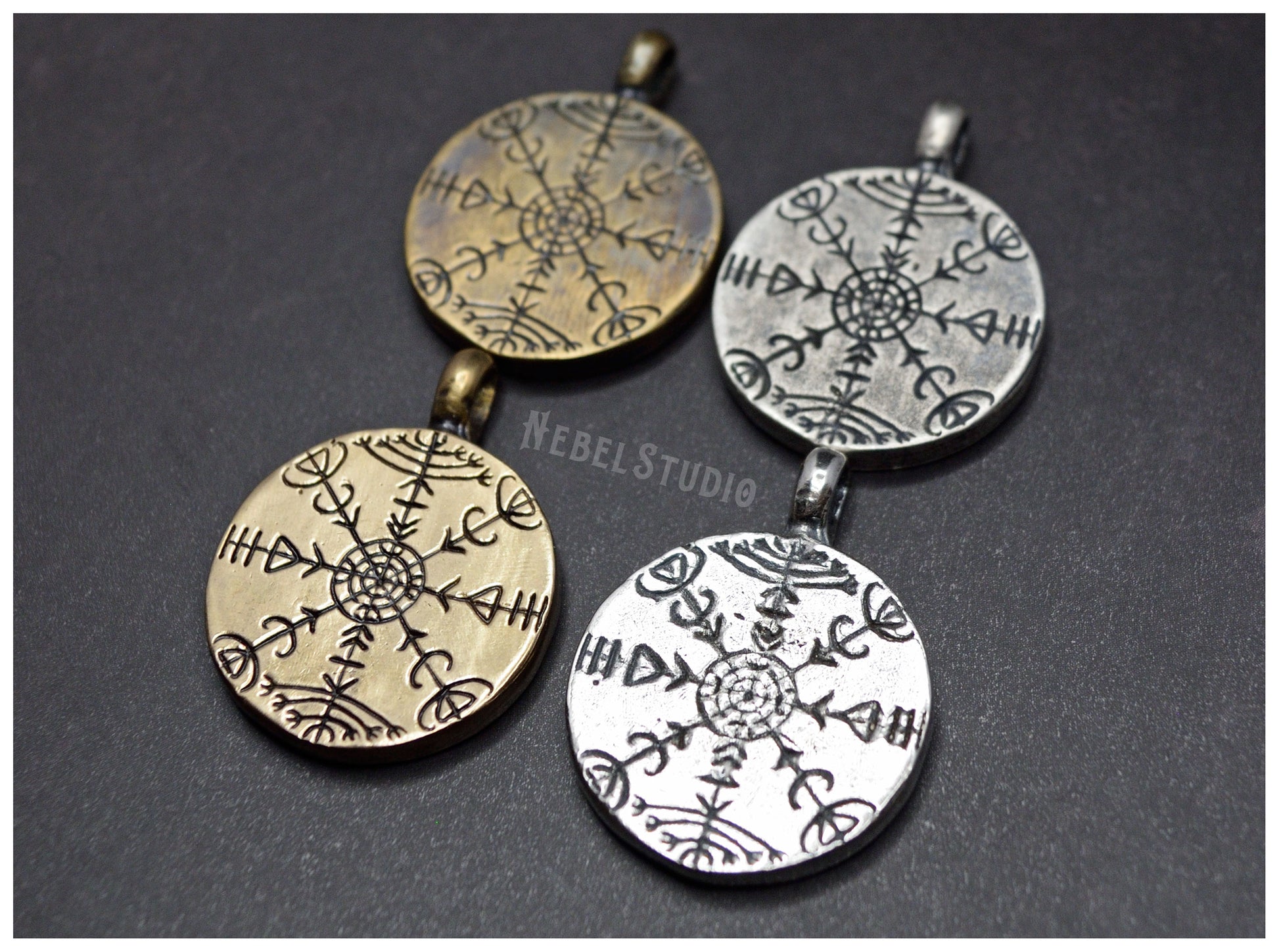 El símbolo que aparece en este colgante es un Veldismagn, es de origen islandés y su registro más antiguo que se conserva es en el Galdrabók (un grimorio islandés fechado alrededor del 1600) donde ser recogen distintos hechizos. Este es un hechizo de protección, no sólo para volver ilesos de los viajes por tierra o por mar, si no también contra enfermedades y magia negativa. Según la información del Museo de Hechicería y Brujería de Islandia, para activar su poder, había que grabarlo en lignito, colorearlo con sangre y llevarlo sobre el pecho. Pero el Veldismagn no es sólo un hechizo de protección, también es un hechizo de potenciación pues, literalmente, su nombre significa "el que aumenta el poder". El poder de quien lo porta.