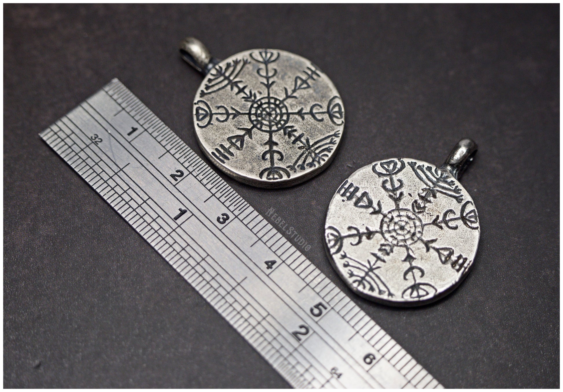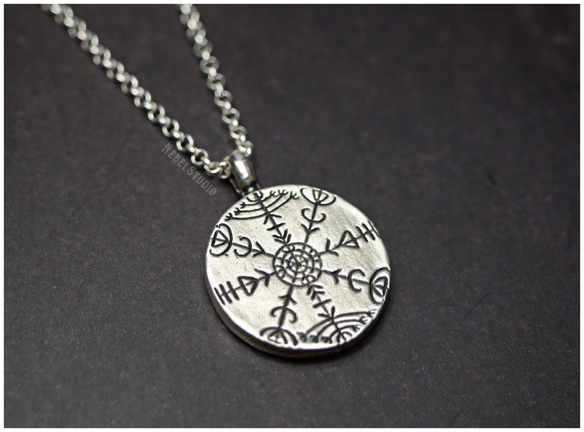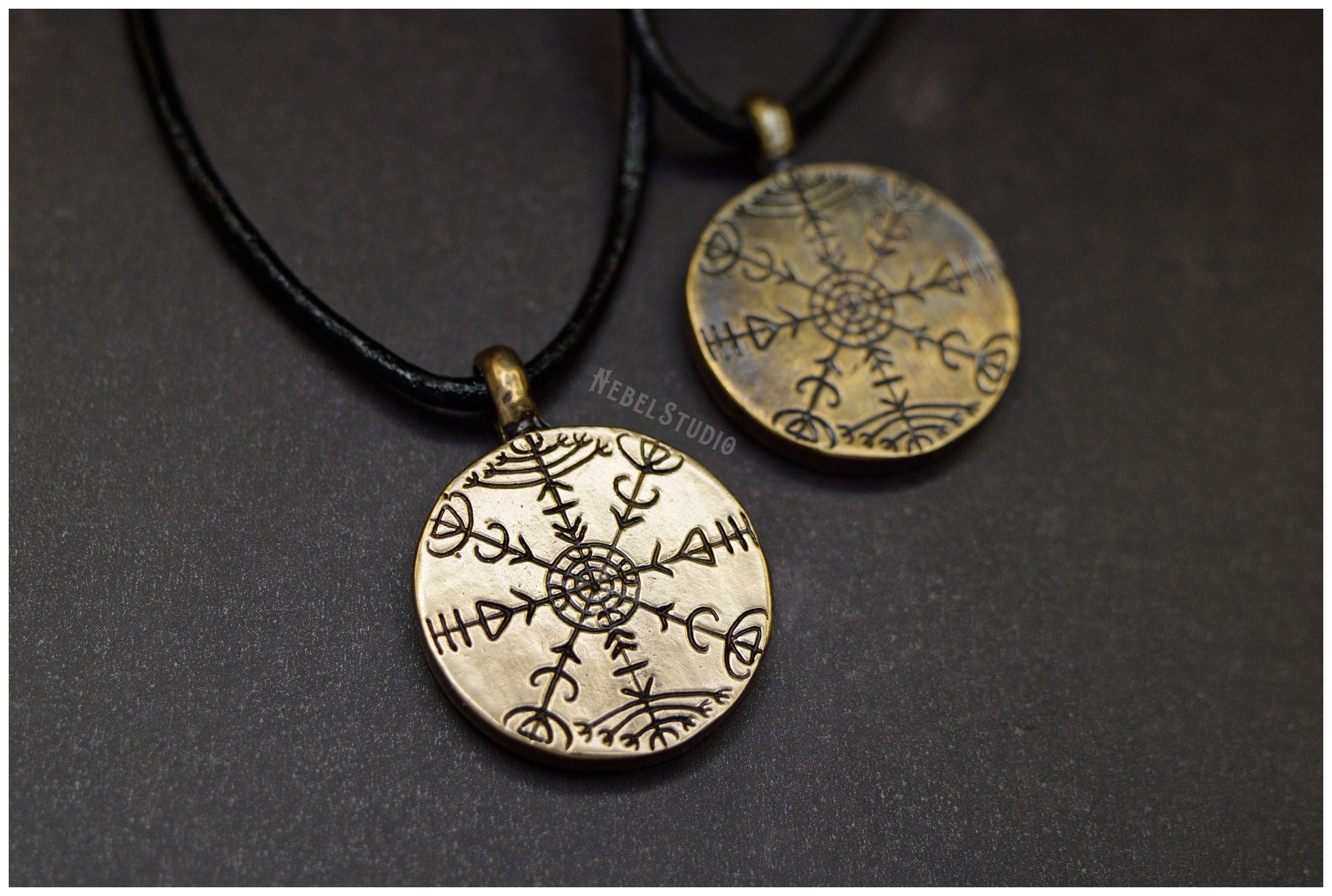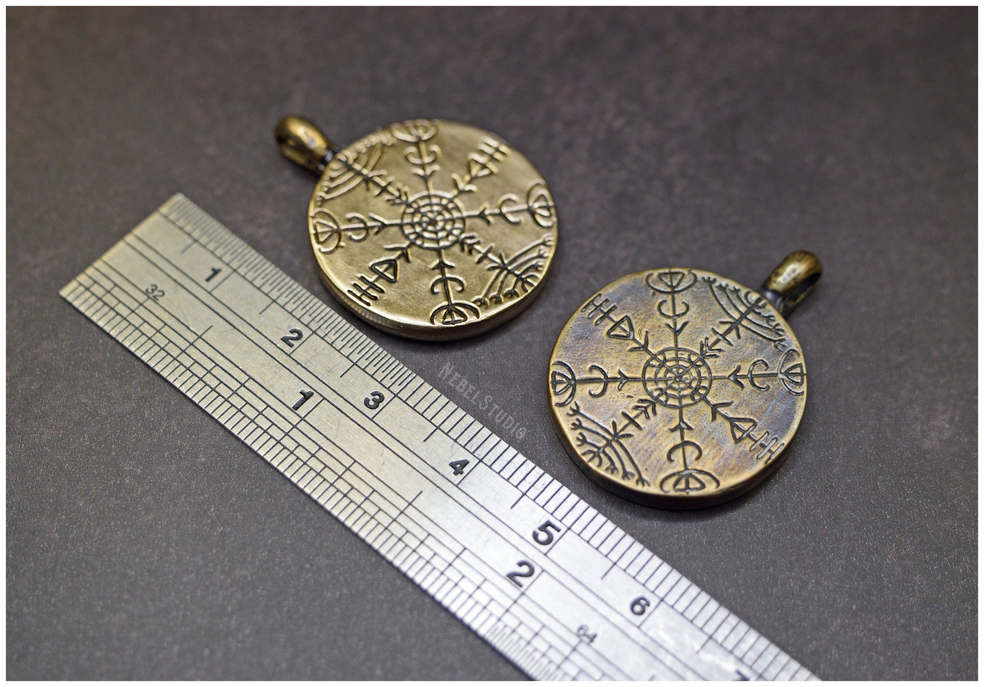 El símbolo que aparece en este colgante es un Veldismagn, es de origen islandés y su registro más antiguo que se conserva es en el Galdrabók (un grimorio islandés fechado alrededor del 1600) donde ser recogen distintos hechizos. Este es un hechizo de protección, no sólo para volver ilesos de los viajes por tierra o por mar, si no también contra enfermedades y magia negativa. Según la información del Museo de Hechicería y Brujería de Islandia, para activar su poder, había que grabarlo en lignito, colorearlo con sangre y llevarlo sobre el pecho. Pero el Veldismagn no es sólo un hechizo de protección, también es un hechizo de potenciación pues, literalmente, su nombre significa "el que aumenta el poder". El poder de quien lo porta.