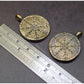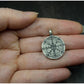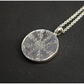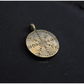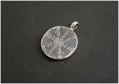 Esta pieza es un colgante de plata de ley 925 o bronce, macizo, de forma circular. Mide unos 2.5cm de diámetro por unos 3 mm de grosor. Está grabado a mano. El acabado es brillante con una pátina que resalta el grabado.